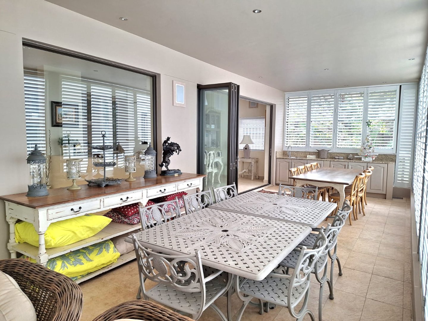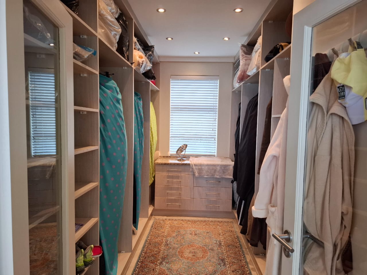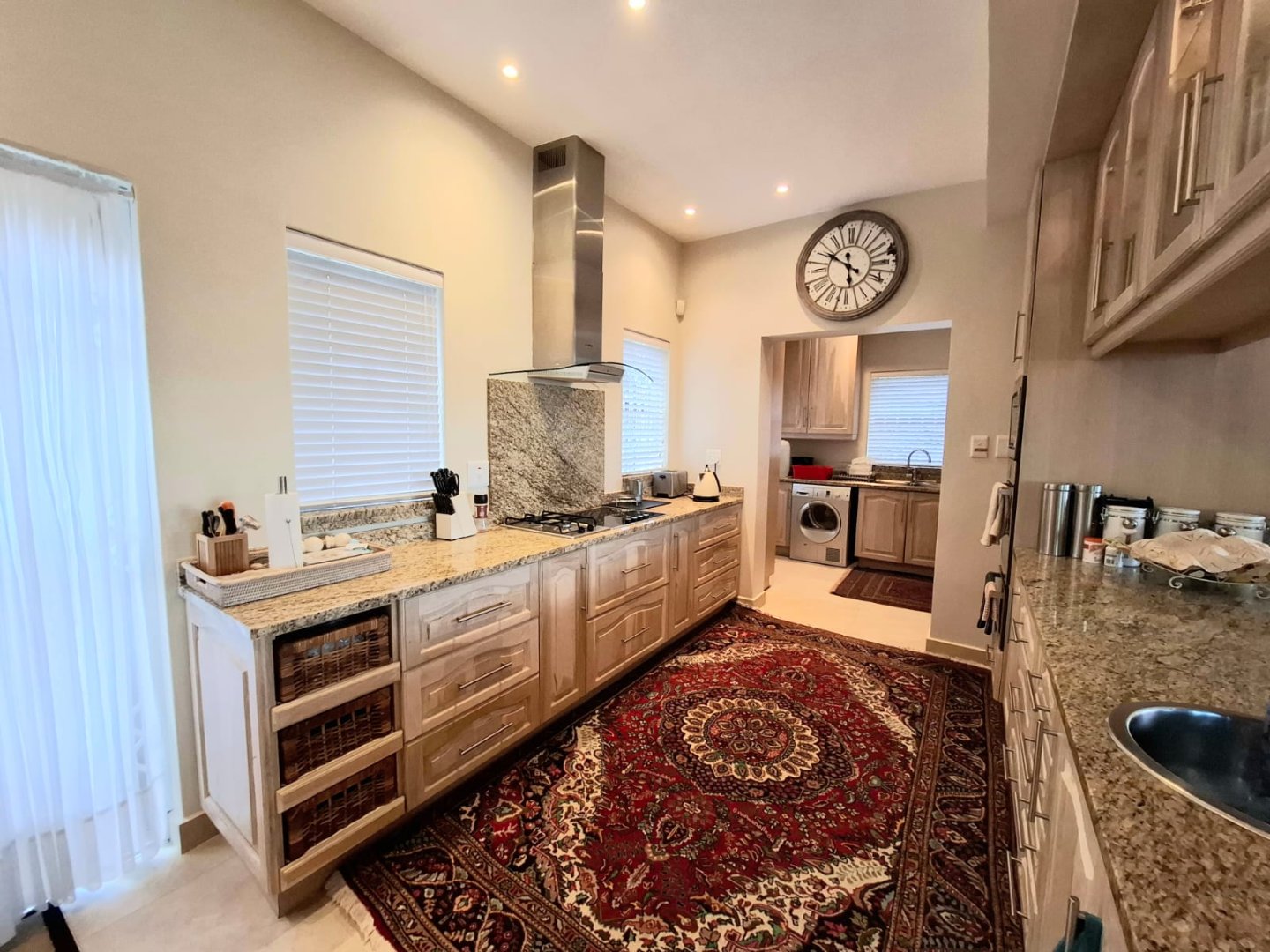 Designed with seamless flow and understated opulence, the home’s layout includes an expansive open-plan living and dining area that wraps around a central lounge, all enhanced by floor-to-ceiling windows framing ever-changing lagoon views. At the heart of this entertainer’s paradise is a state-of-the-art kitchen with a gas and electric hob, eye-level oven, and separate scullery—perfectly suited for hosting anything from intimate dinners to large-scale gatherings. The large patio, fitted with elegant plantation shutters, offers a year-round indoor-outdoor living space where golden sunsets paint the sky each evening.