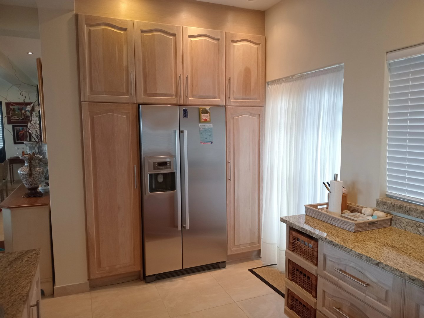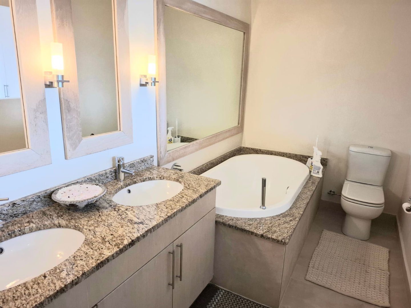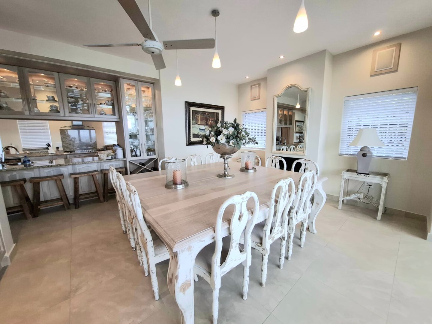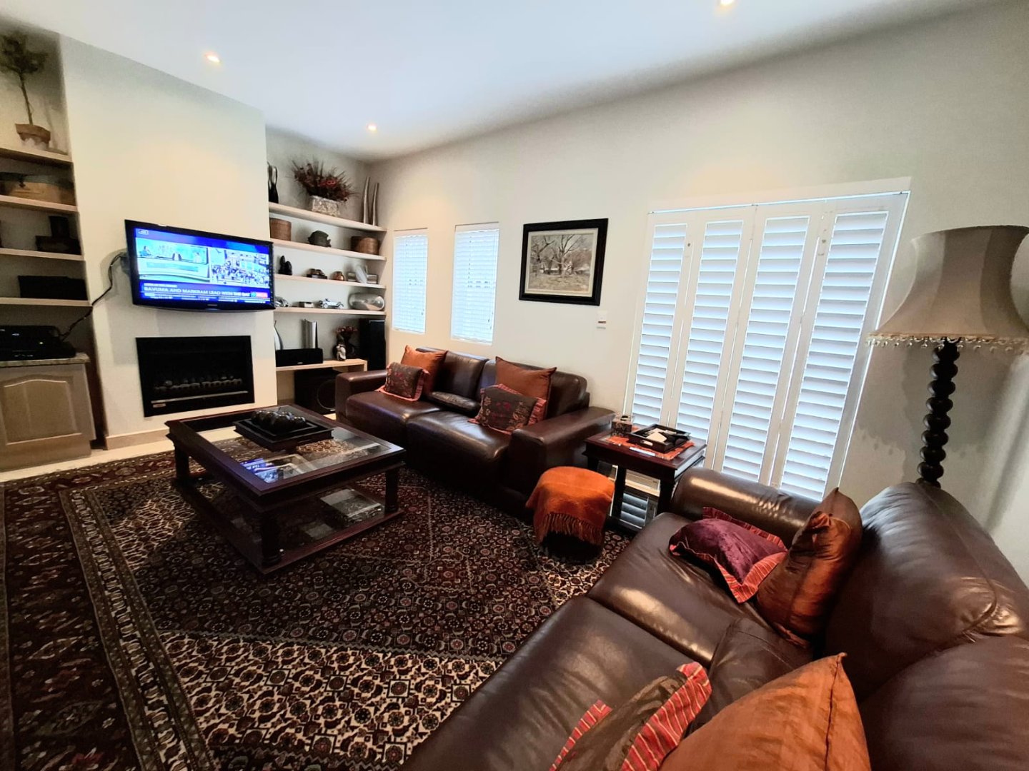 Designed with seamless flow and understated opulence, the home’s layout includes an expansive open-plan living and dining area that wraps around a central lounge, all enhanced by floor-to-ceiling windows framing ever-changing lagoon views. At the heart of this entertainer’s paradise is a state-of-the-art kitchen with a gas and electric hob, eye-level oven, and separate scullery—perfectly suited for hosting anything from intimate dinners to large-scale gatherings. The large patio, fitted with elegant plantation shutters, offers a year-round indoor-outdoor living space where golden sunsets paint the sky each evening.