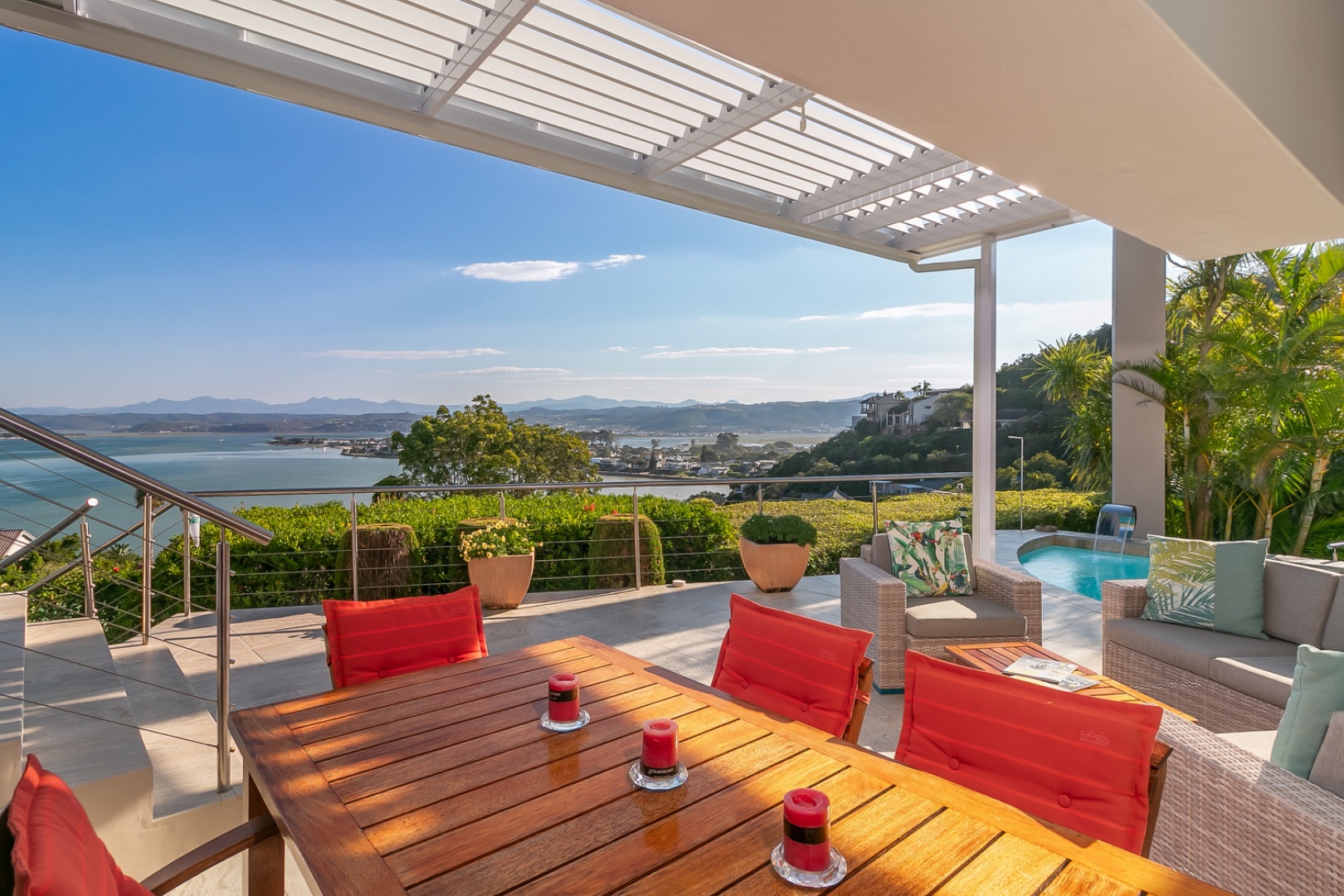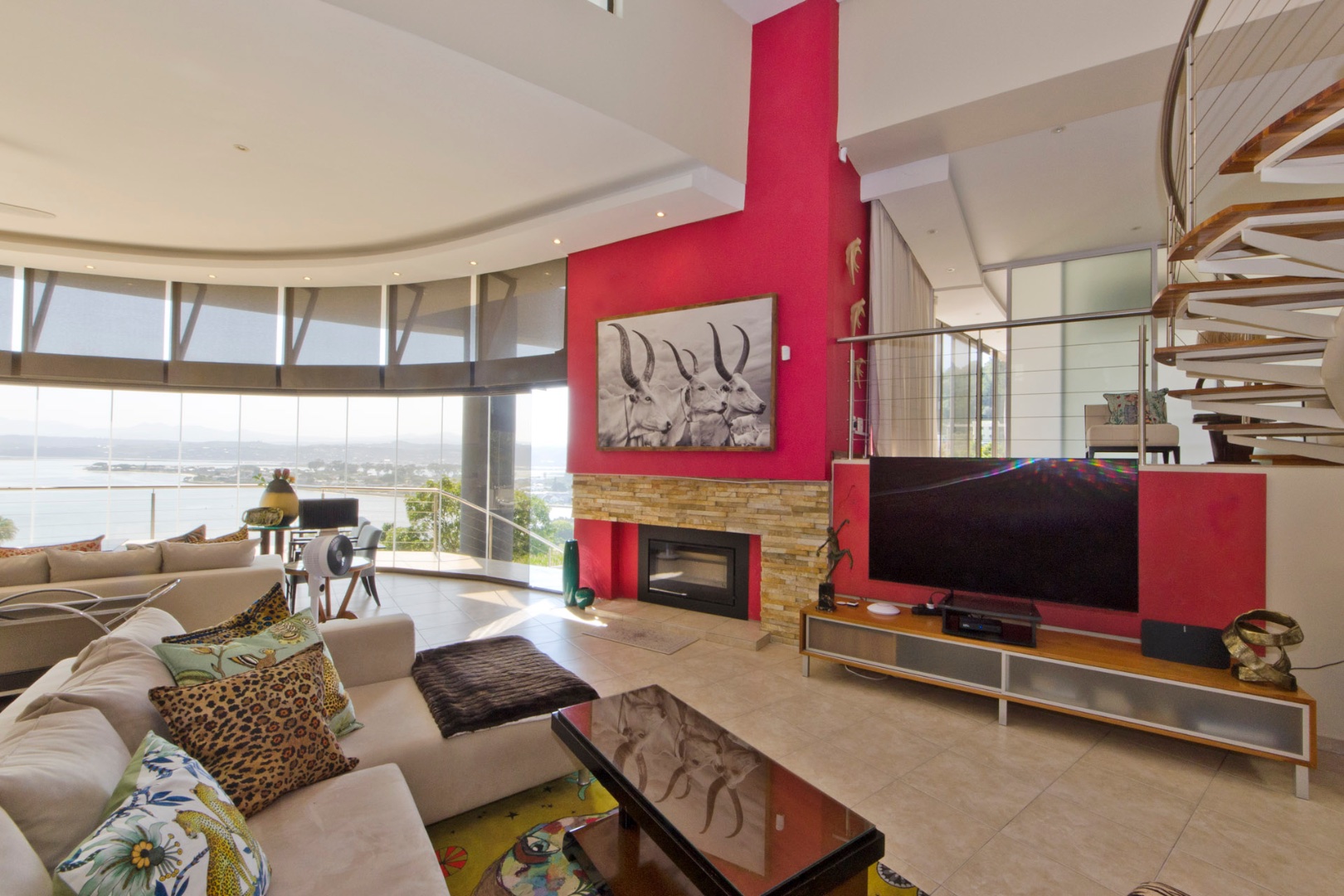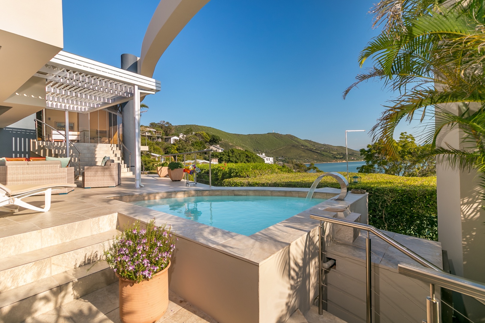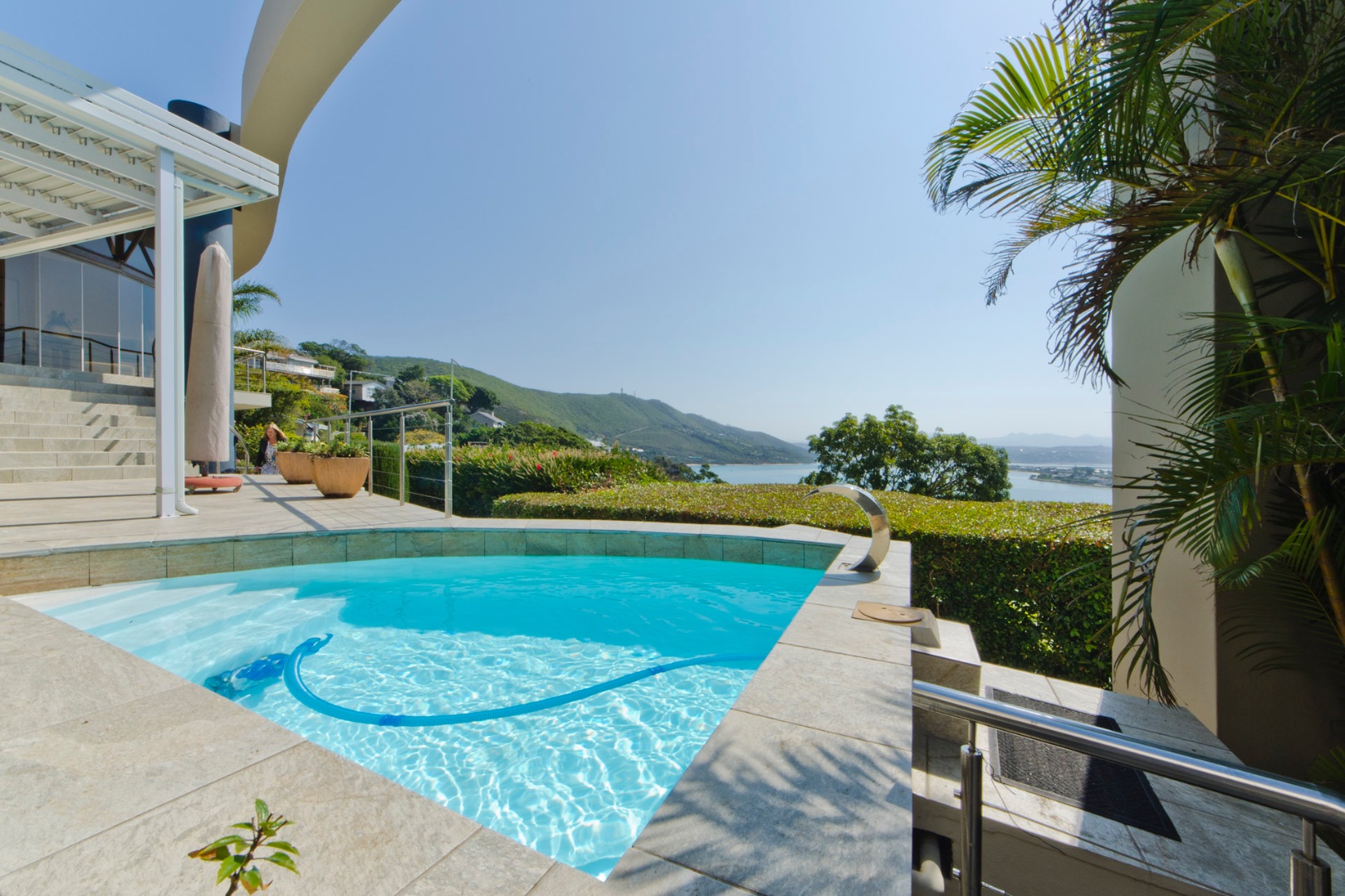 EXCLUSIVE MANDATE: Unique in many ways this modern home has uninterrupted views framing the Knysna Lagoon from every window. The nuance of lighting in exclusive spaces shows the personalised thought and planning in this grand design. Suspended support structures built in a wave-like manner outlines the house without dispelling the views. This 5 bedroom spacious home includes a private flat downstairs.