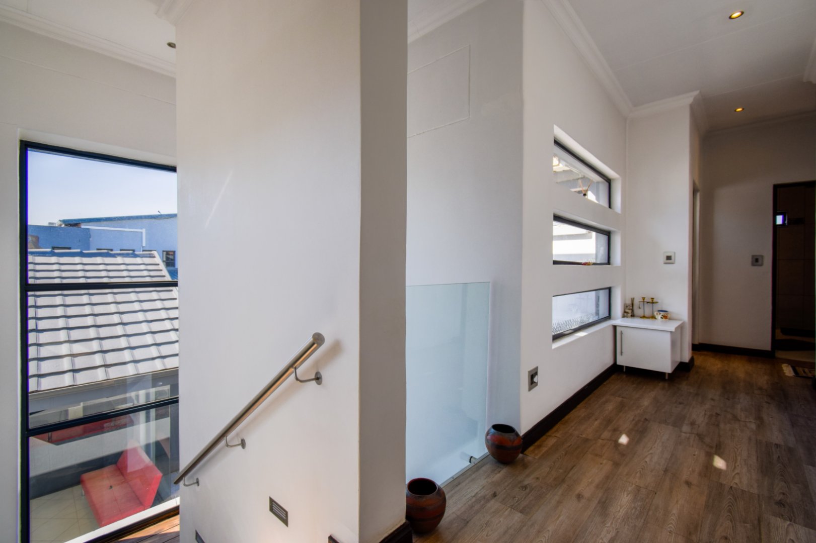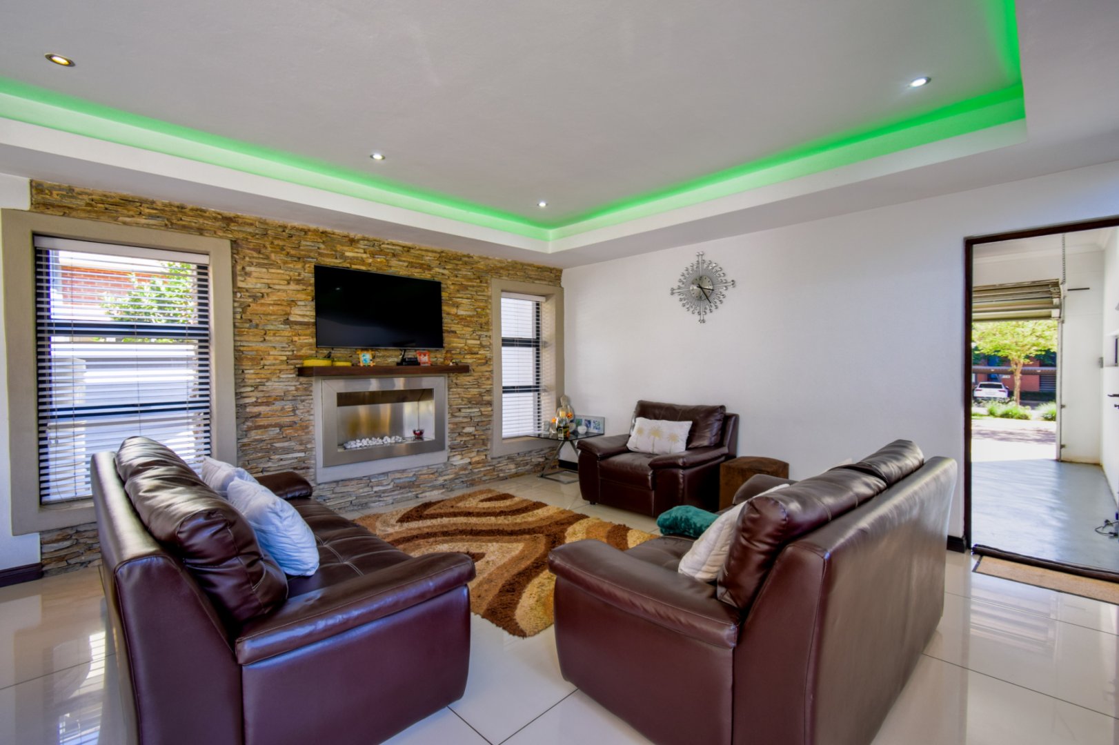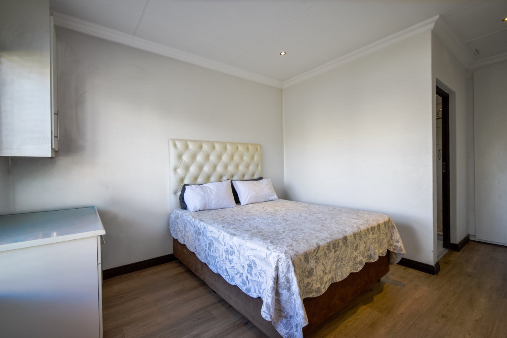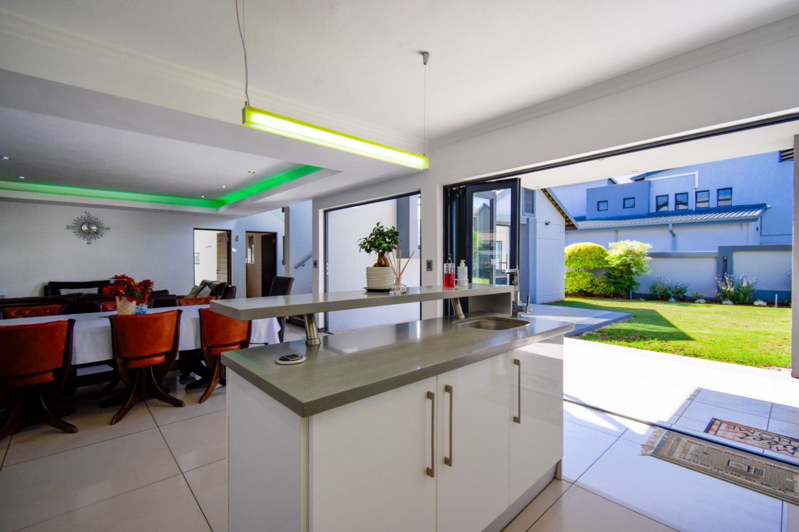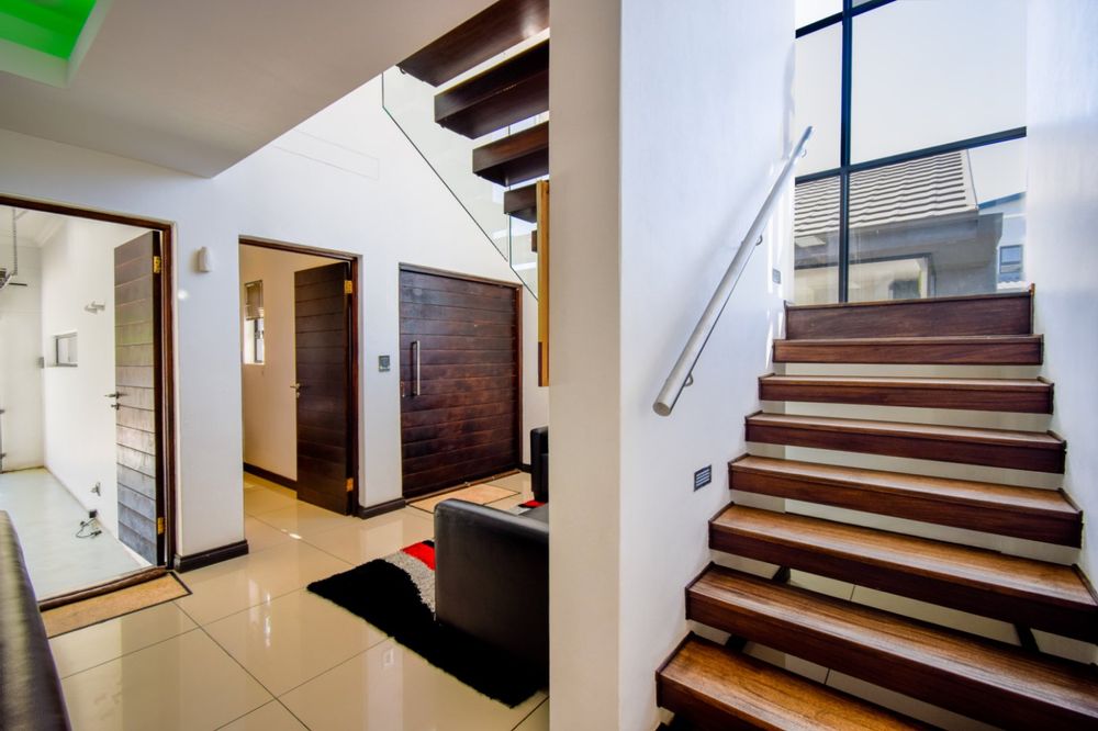 The ground floor welcomes you with a striking double-volume entrance hall, a designer chandelier, and a feature wall with a gas fireplace in the lounge. The open-plan layout flows effortlessly to the dining area and gourmet kitchen, finished with Caesarstone countertops, a pantry, ample cabinetry and abundant plug points for convenience.