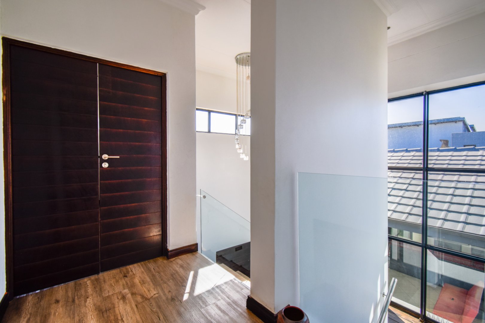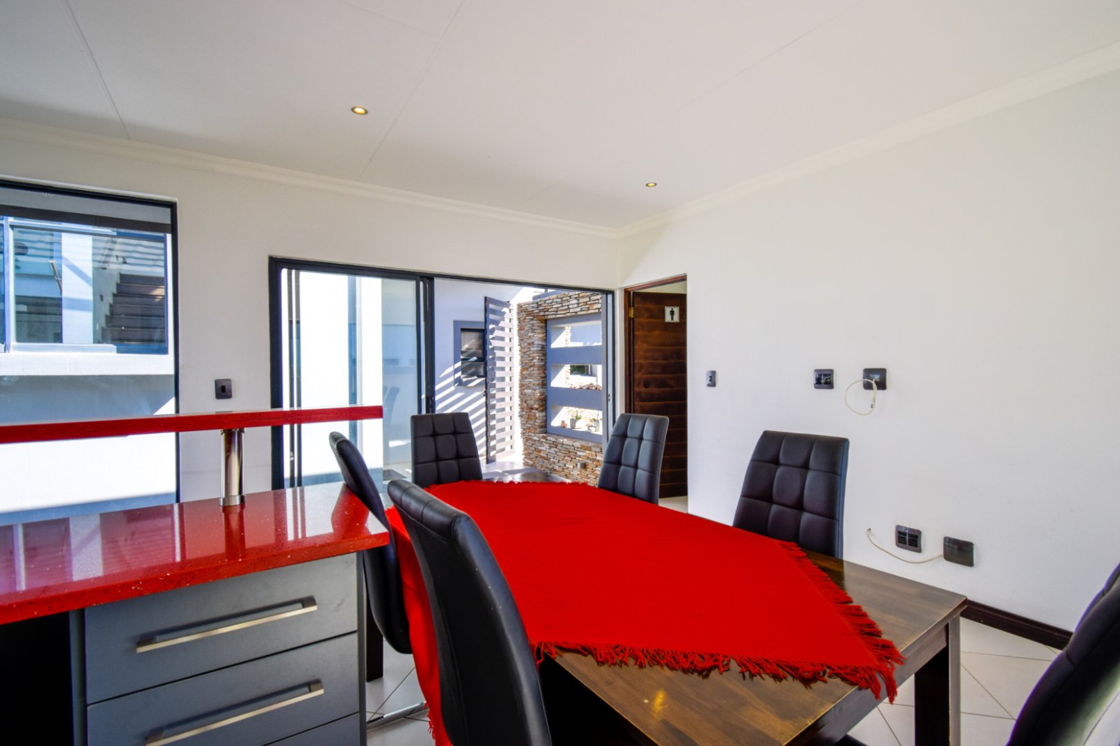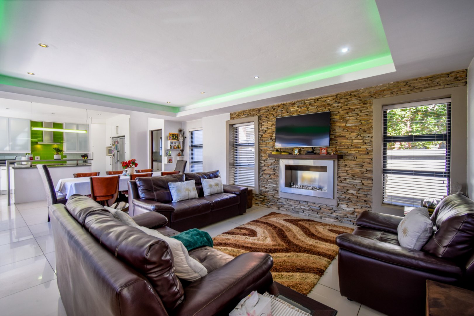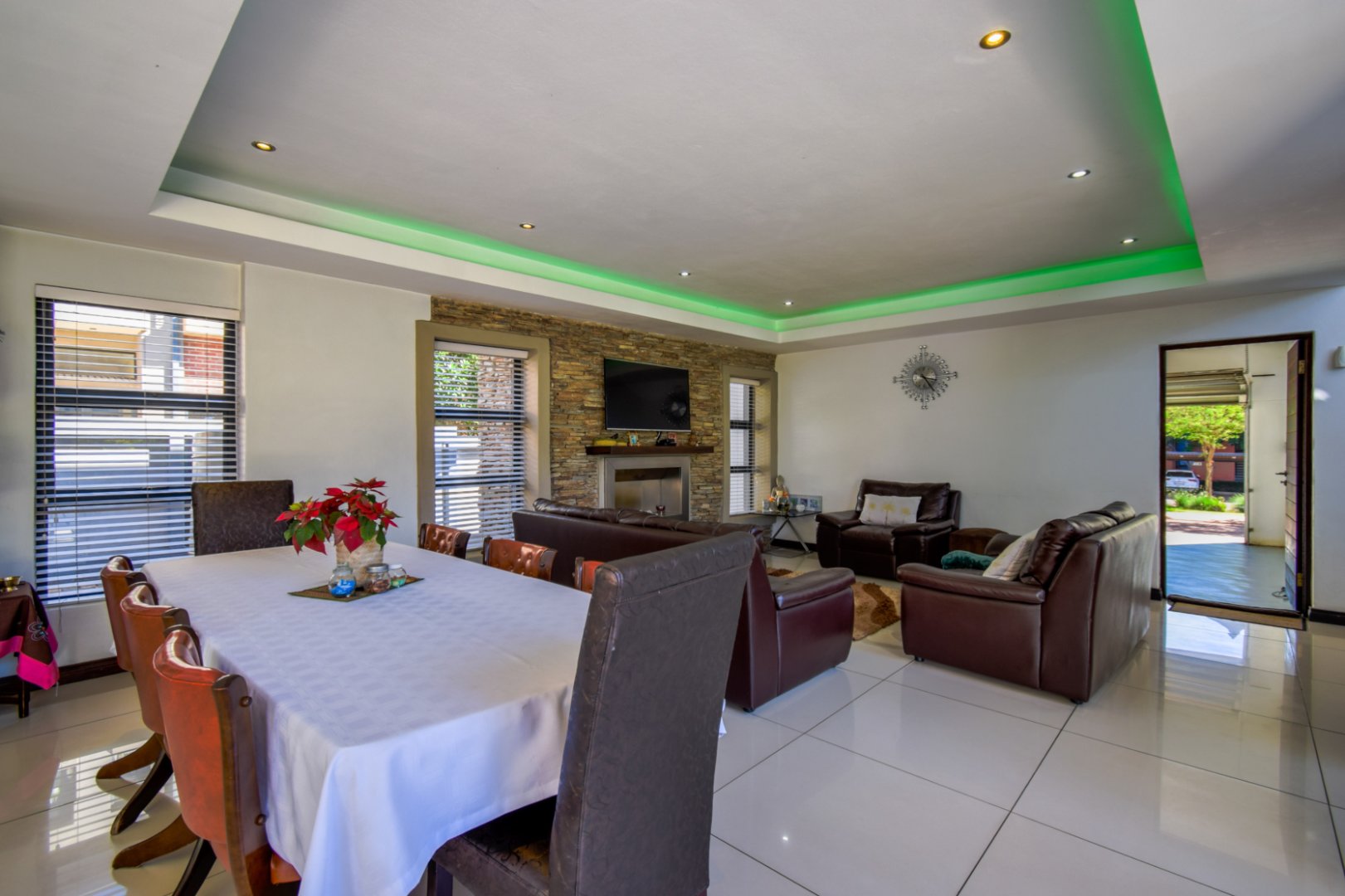 The ground floor welcomes you with a striking double-volume entrance hall, a designer chandelier, and a feature wall with a gas fireplace in the lounge. The open-plan layout flows effortlessly to the dining area and gourmet kitchen, finished with Caesarstone countertops, a pantry, ample cabinetry and abundant plug points for convenience.