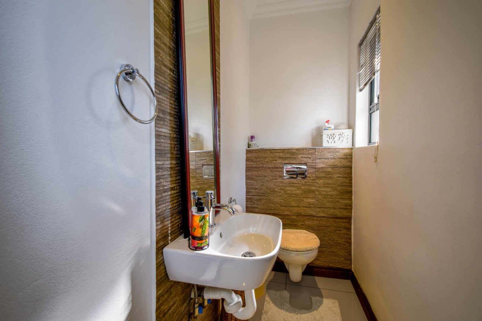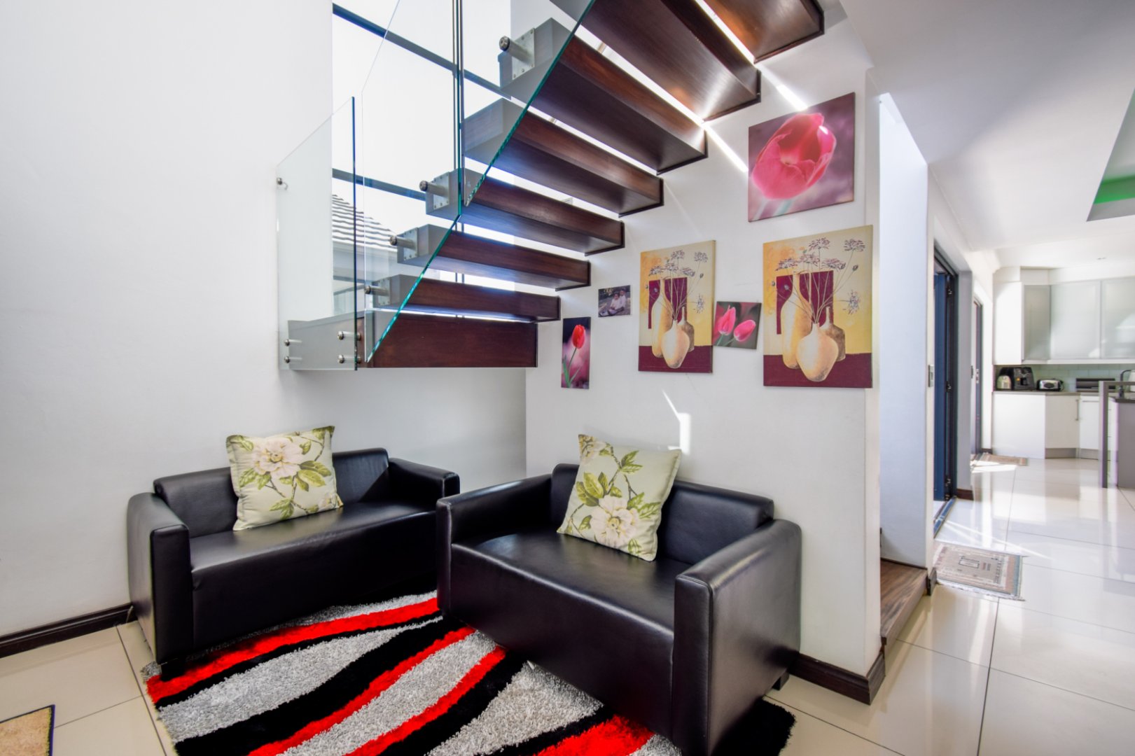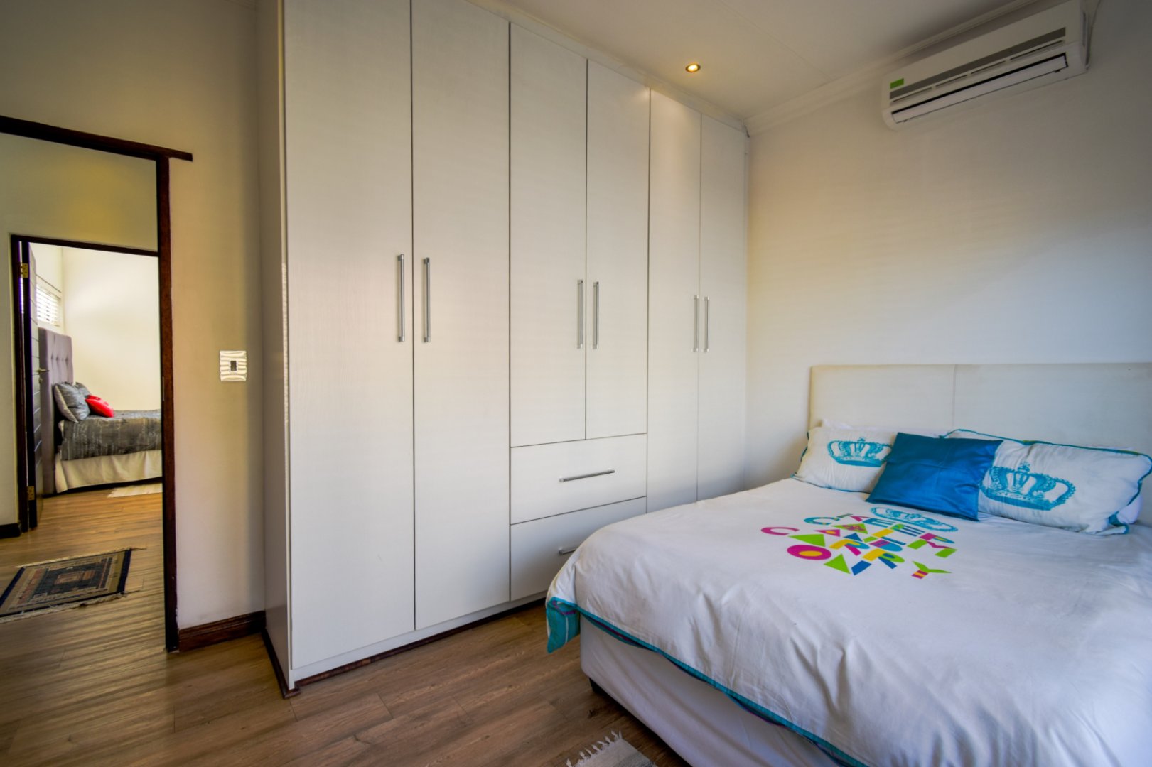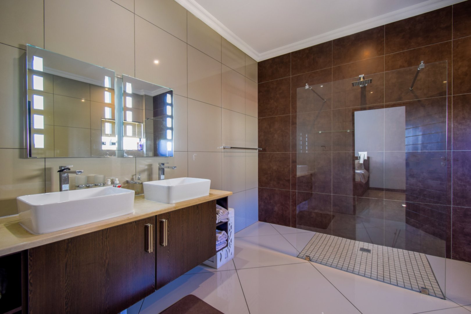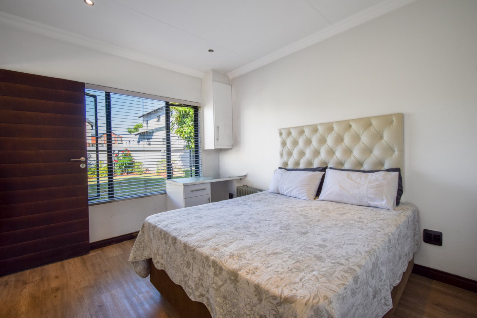 The ground floor welcomes you with a striking double-volume entrance hall, a designer chandelier, and a feature wall with a gas fireplace in the lounge. The open-plan layout flows effortlessly to the dining area and gourmet kitchen, finished with Caesarstone countertops, a pantry, ample cabinetry and abundant plug points for convenience.