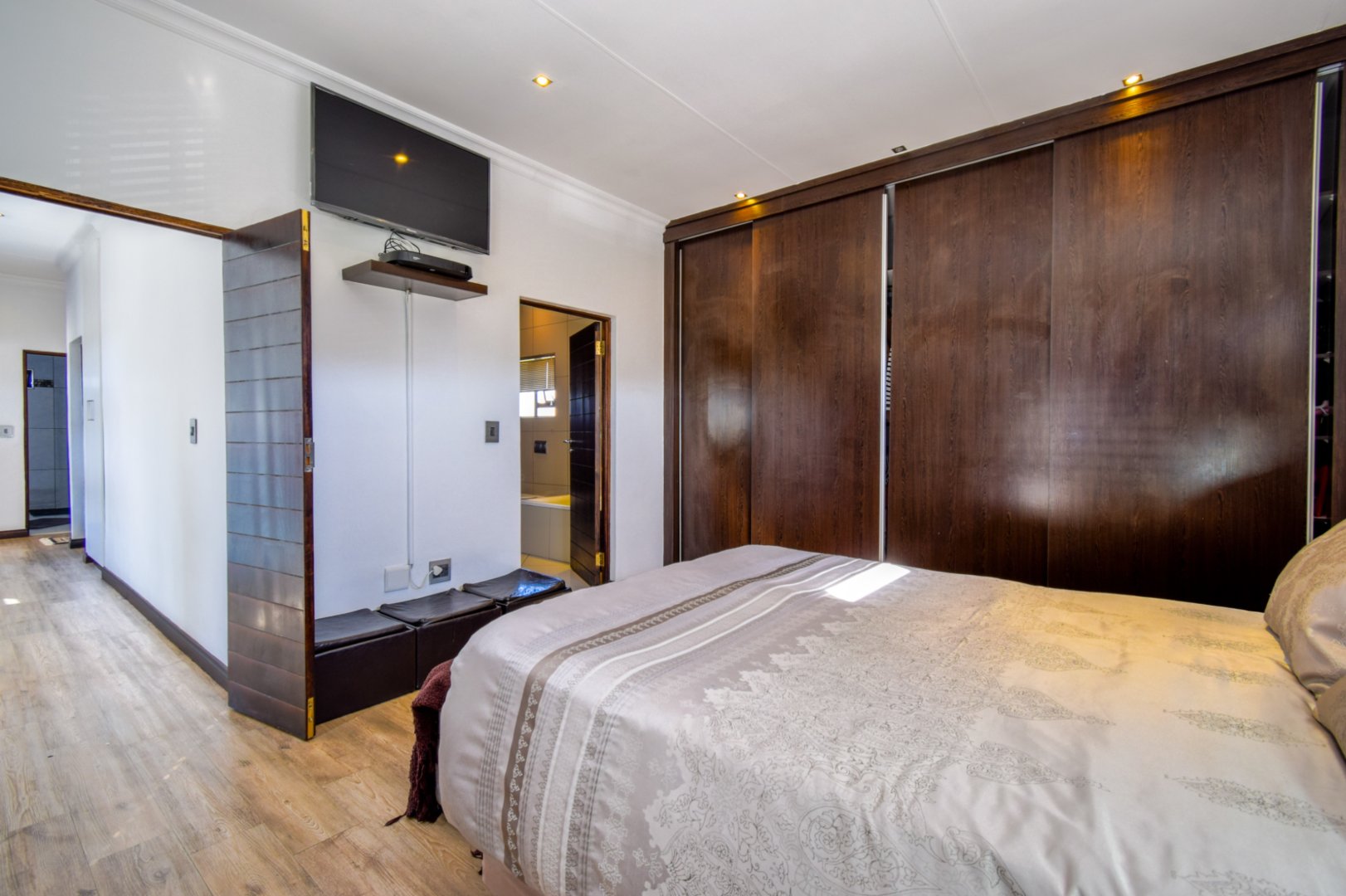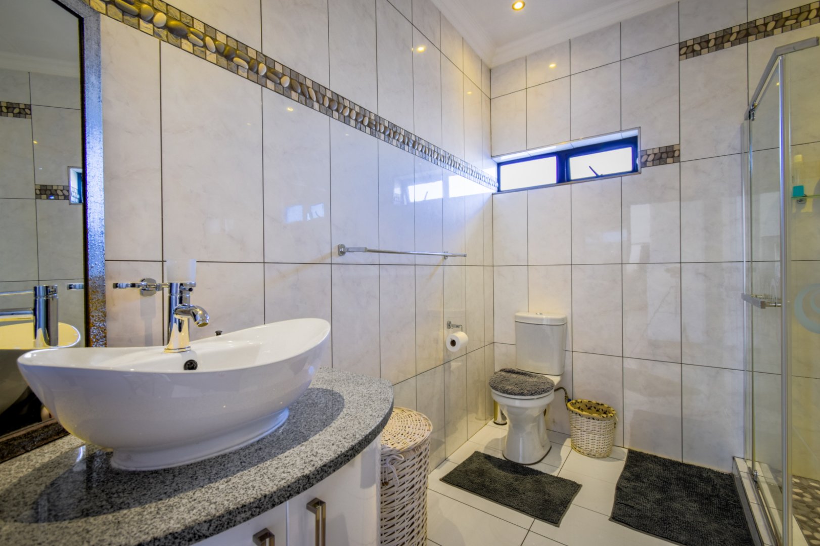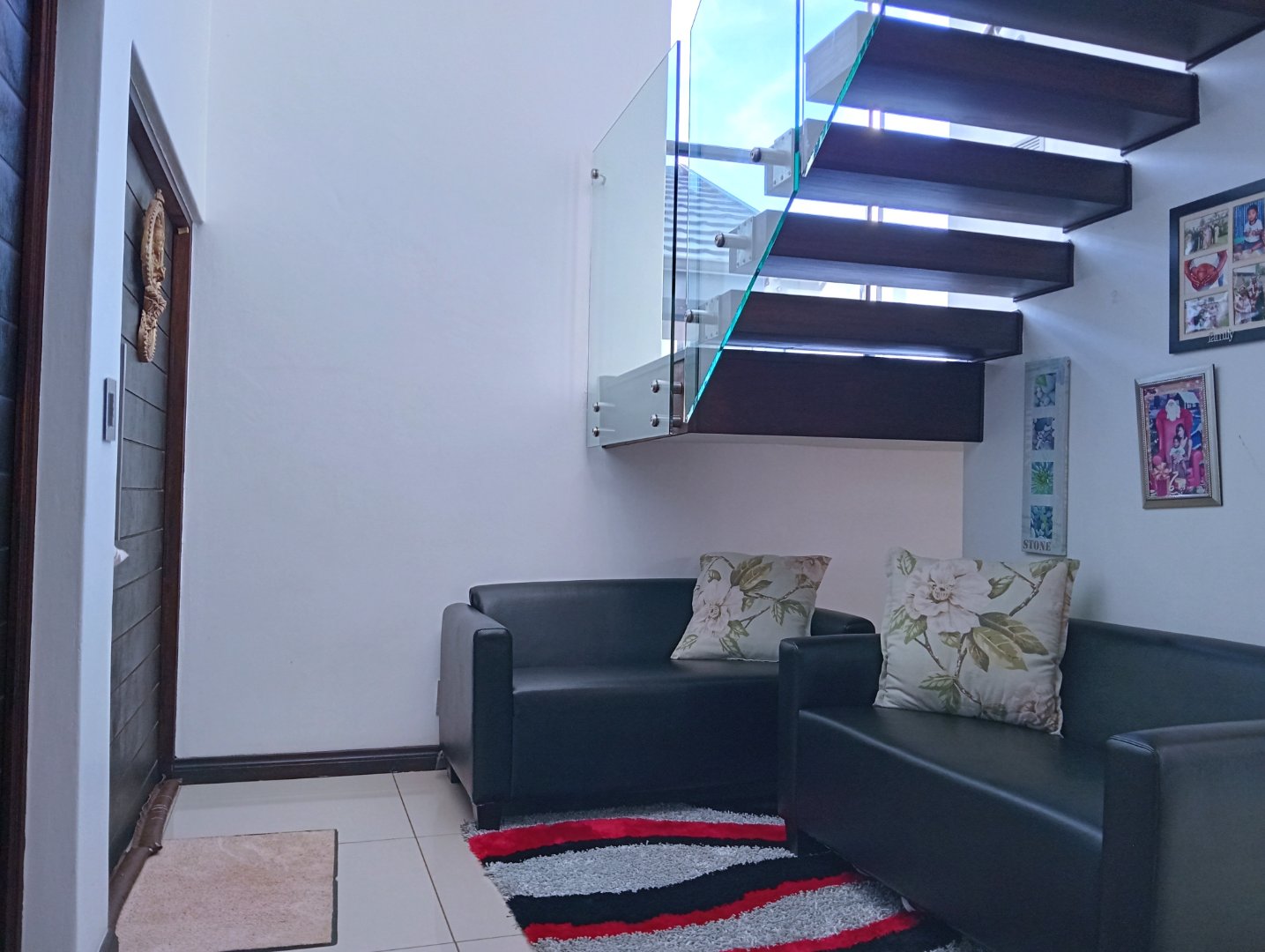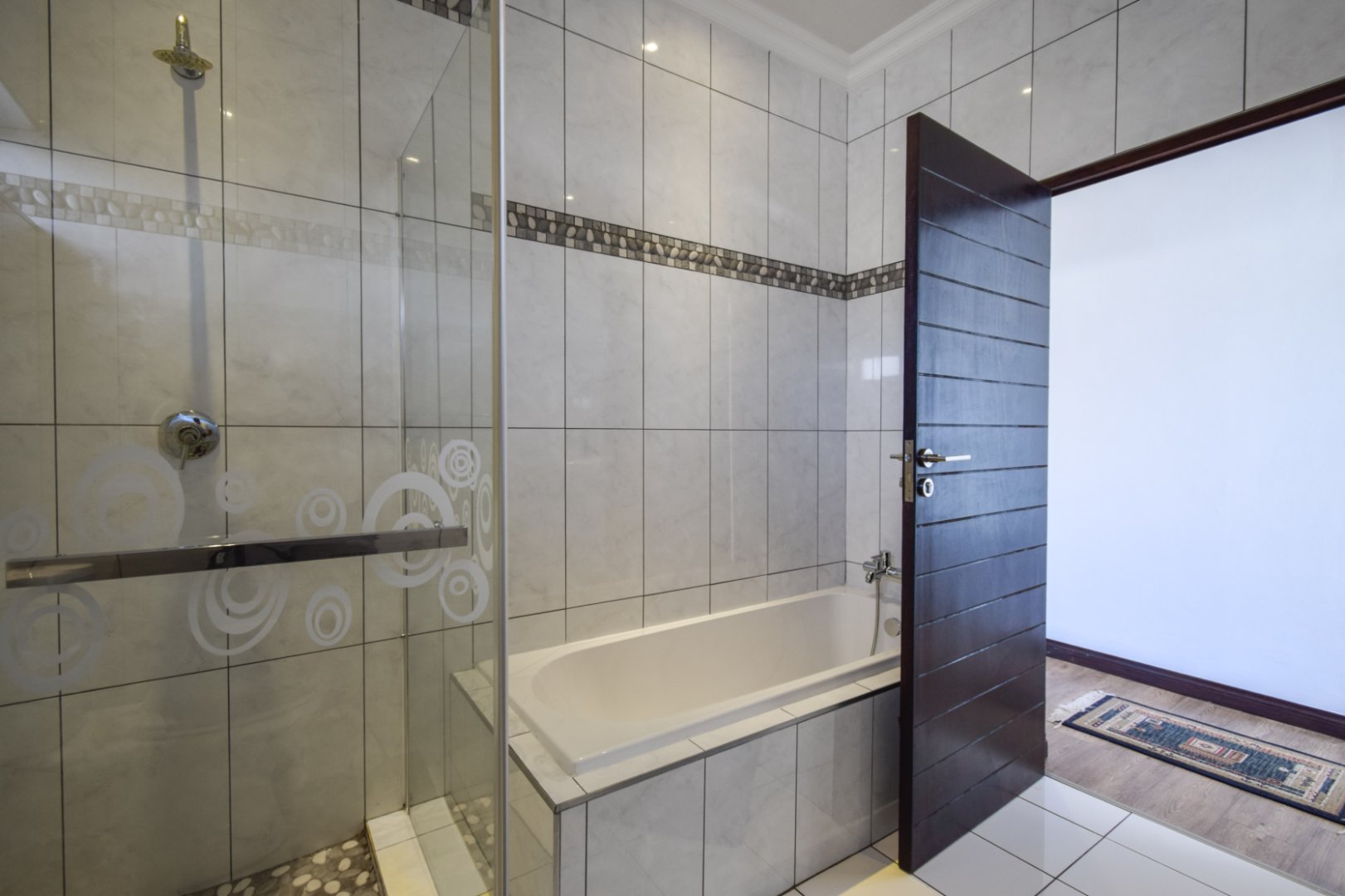 The ground floor welcomes you with a striking double-volume entrance hall, a designer chandelier, and a feature wall with a gas fireplace in the lounge. The open-plan layout flows effortlessly to the dining area and gourmet kitchen, finished with Caesarstone countertops, a pantry, ample cabinetry and abundant plug points for convenience.