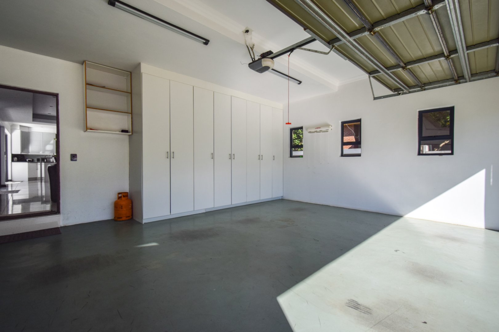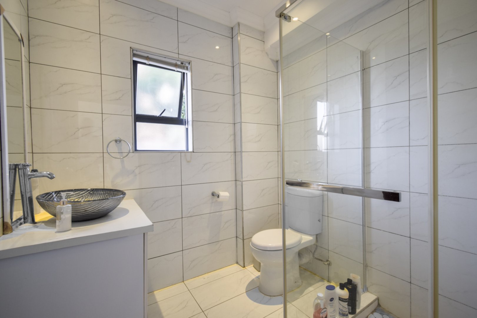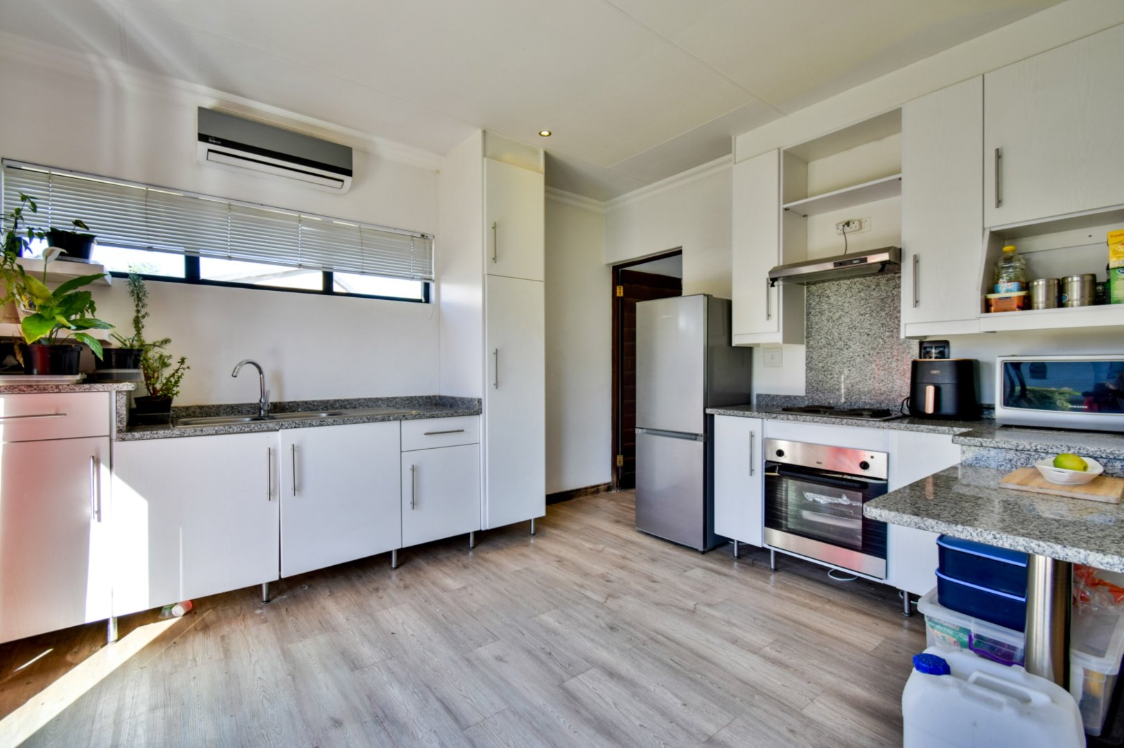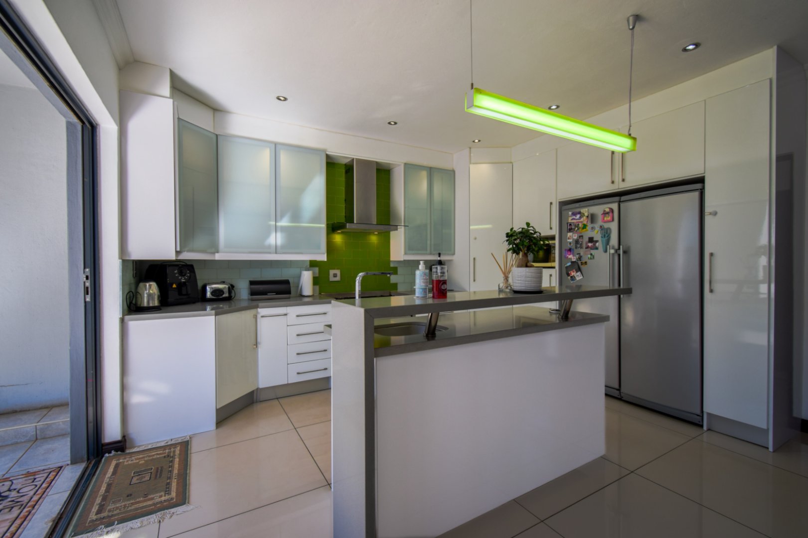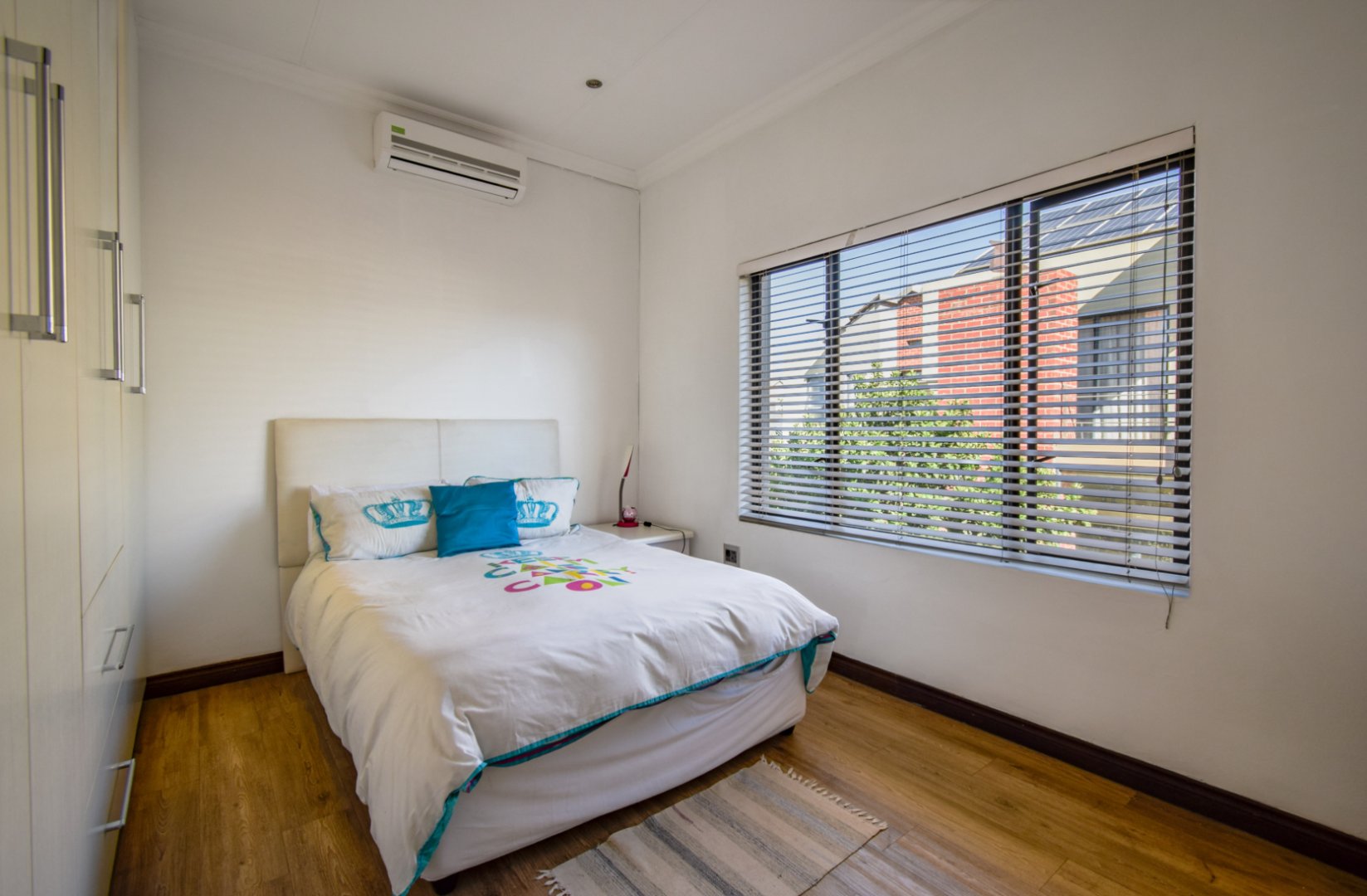 The ground floor welcomes you with a striking double-volume entrance hall, a designer chandelier, and a feature wall with a gas fireplace in the lounge. The open-plan layout flows effortlessly to the dining area and gourmet kitchen, finished with Caesarstone countertops, a pantry, ample cabinetry and abundant plug points for convenience.