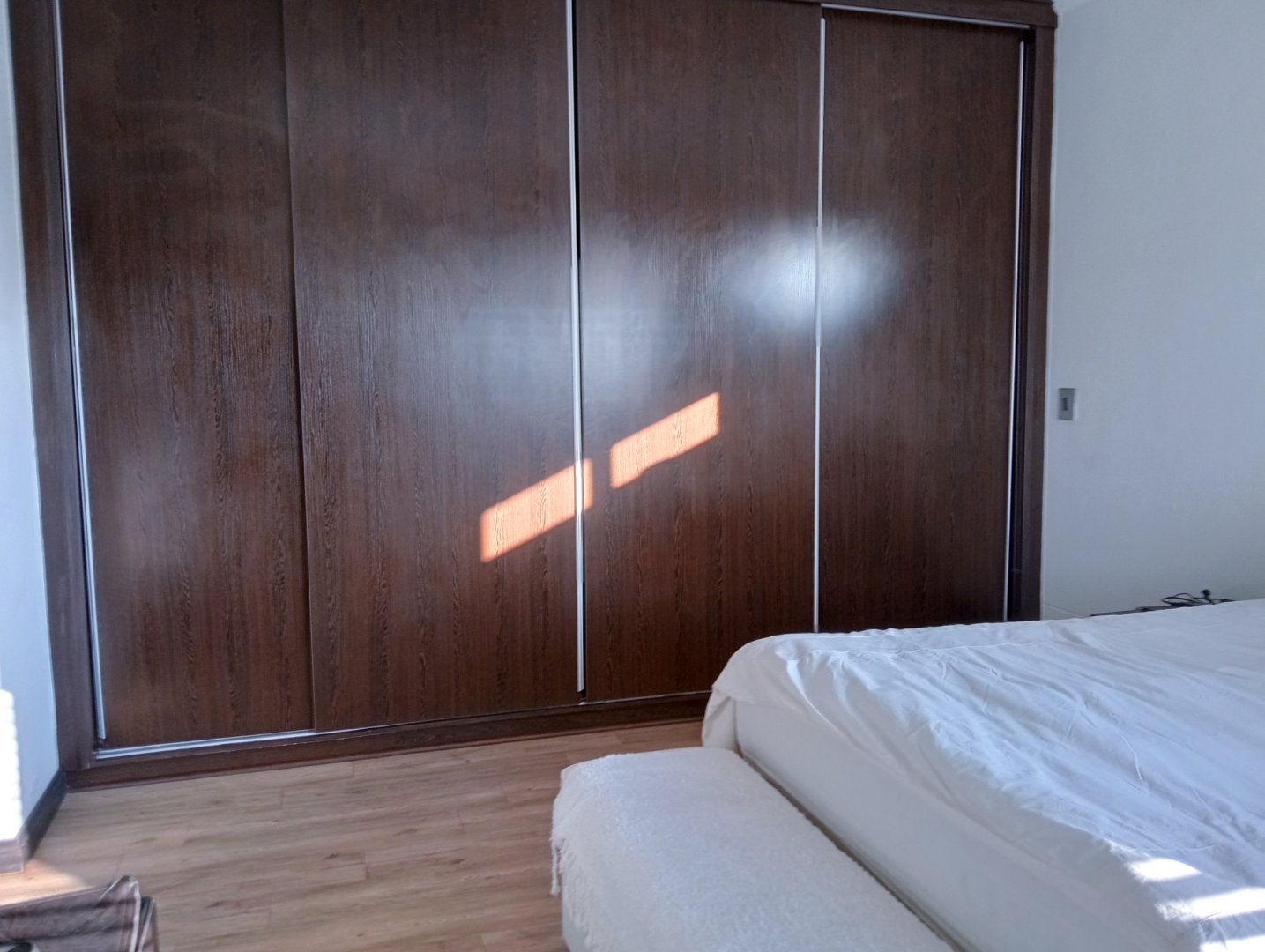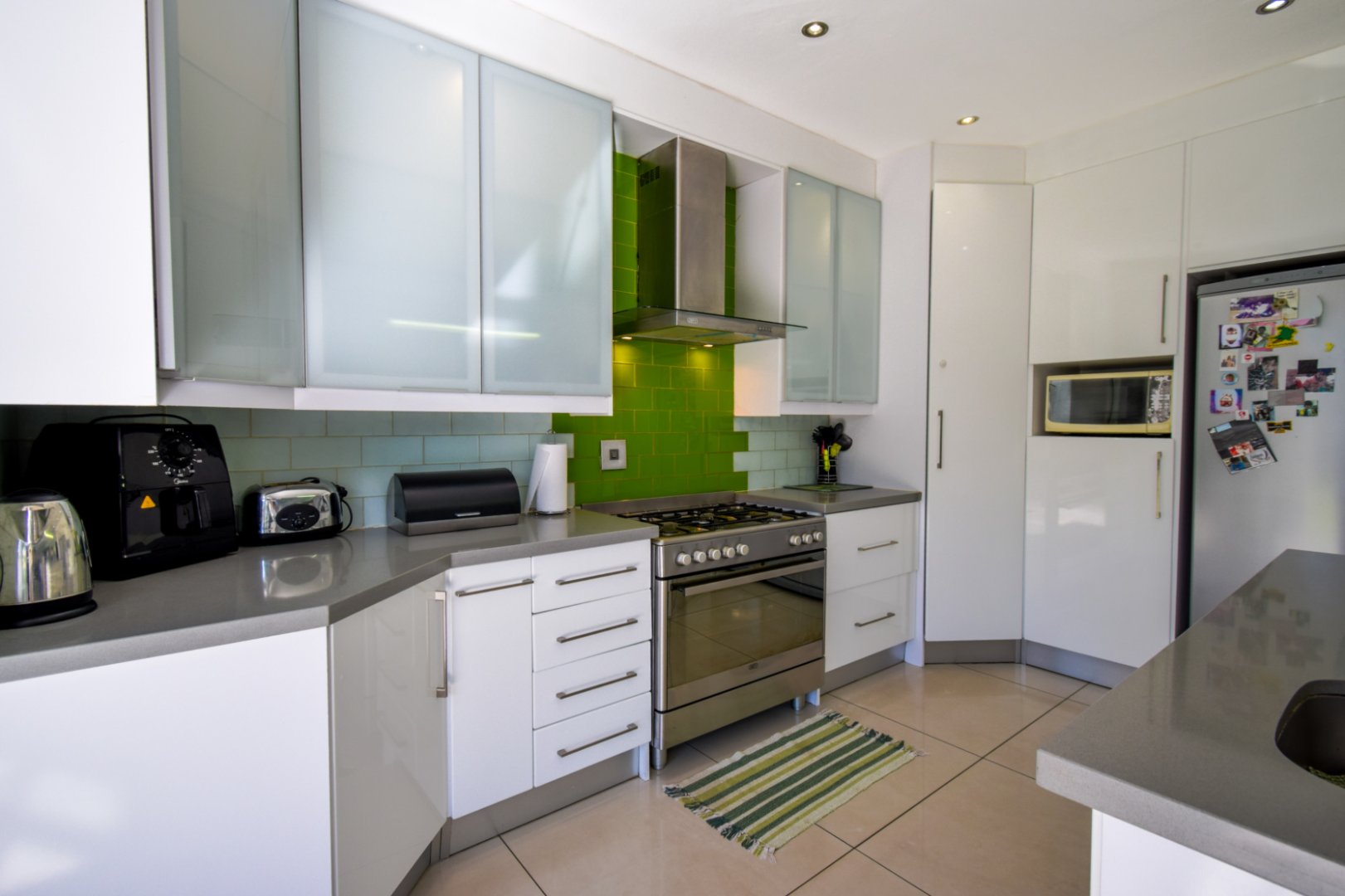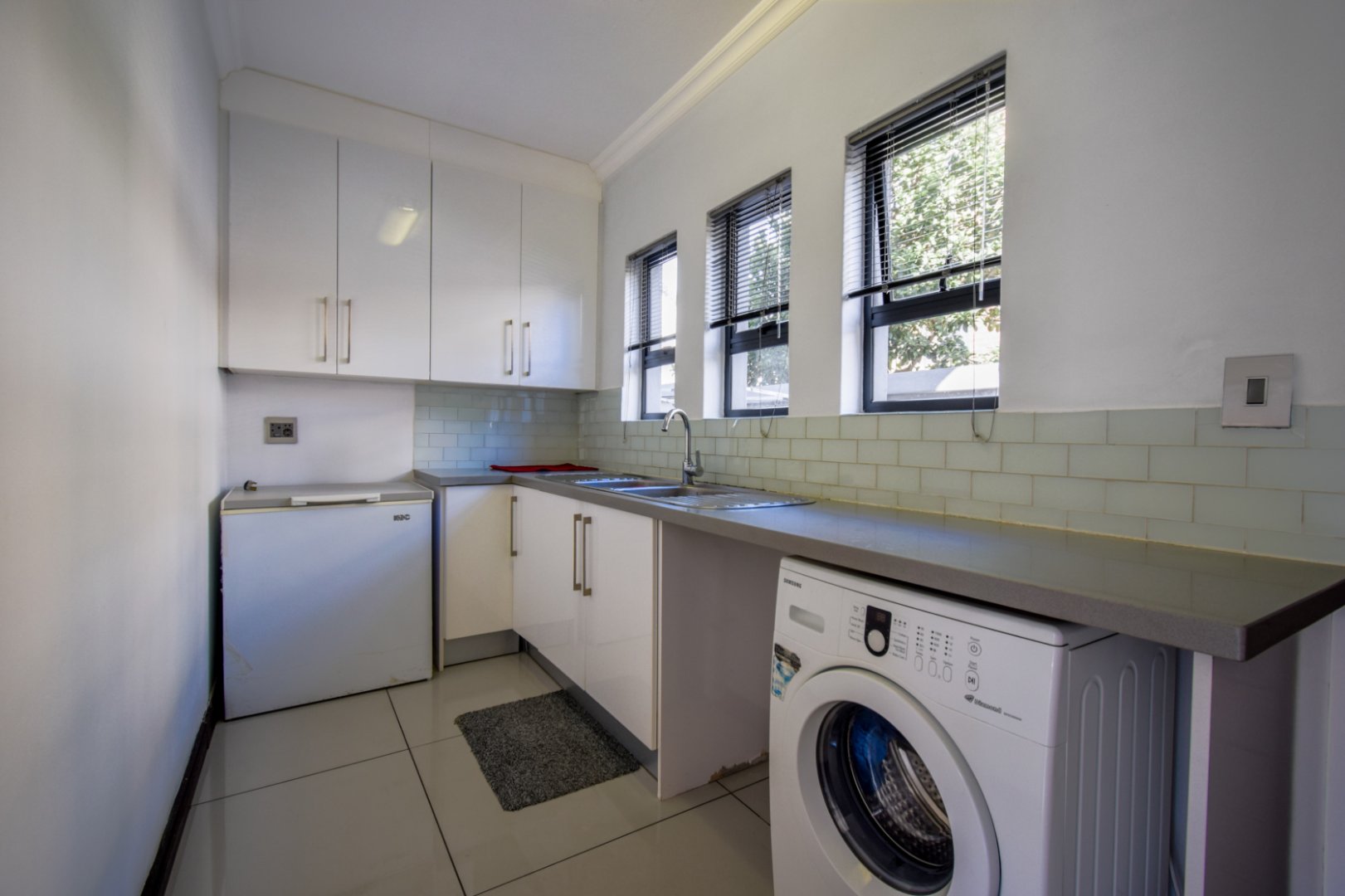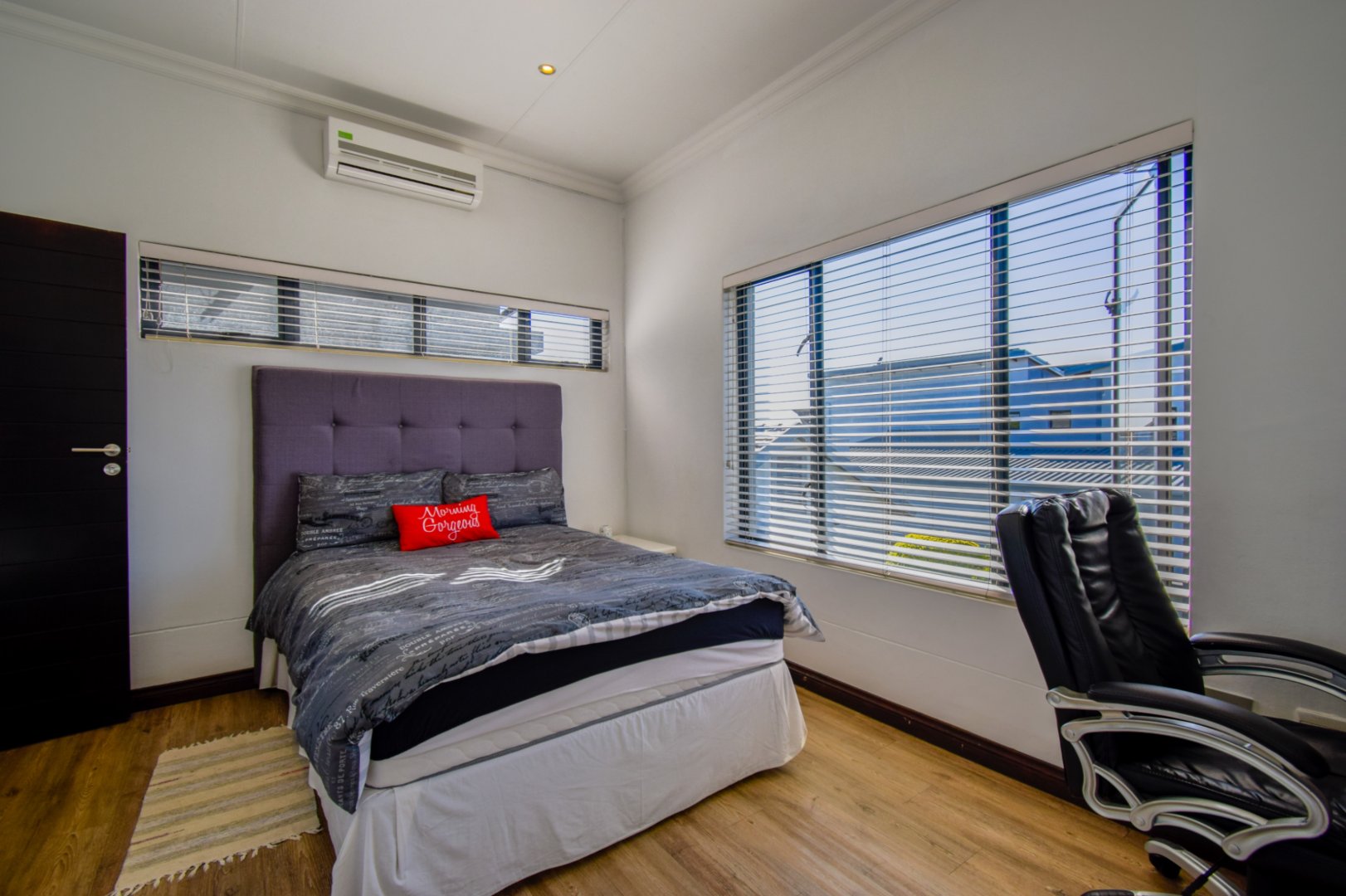 The ground floor welcomes you with a striking double-volume entrance hall, a designer chandelier, and a feature wall with a gas fireplace in the lounge. The open-plan layout flows effortlessly to the dining area and gourmet kitchen, finished with Caesarstone countertops, a pantry, ample cabinetry and abundant plug points for convenience.