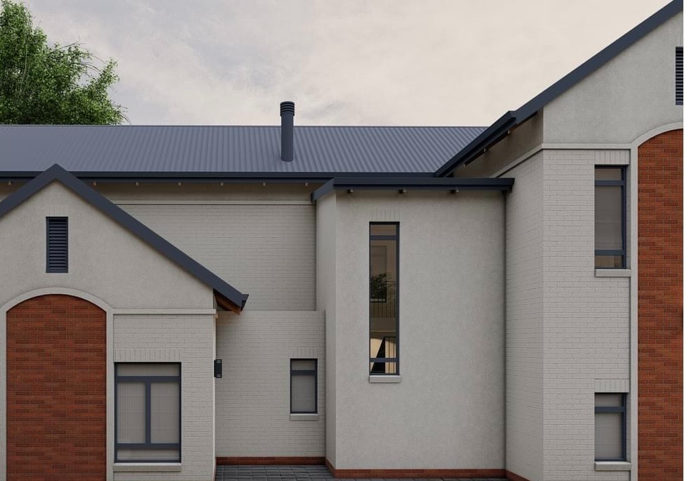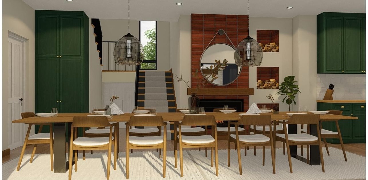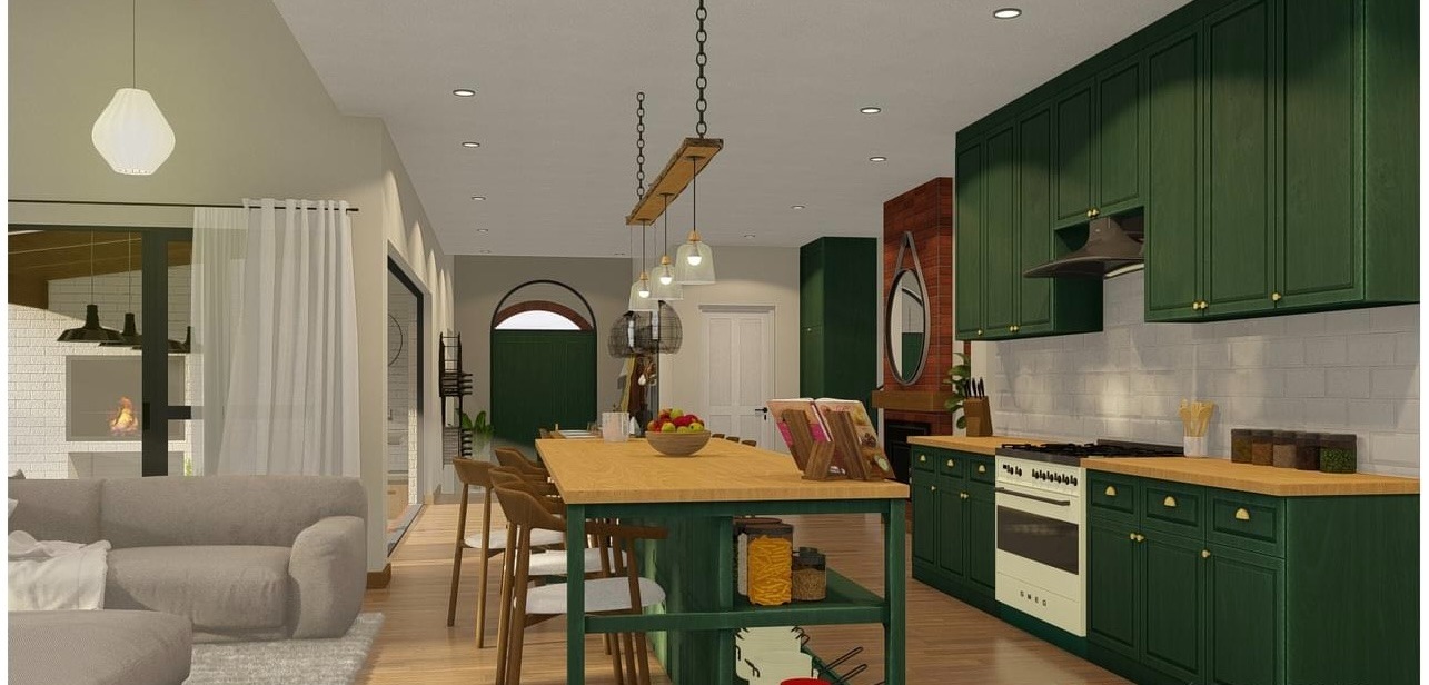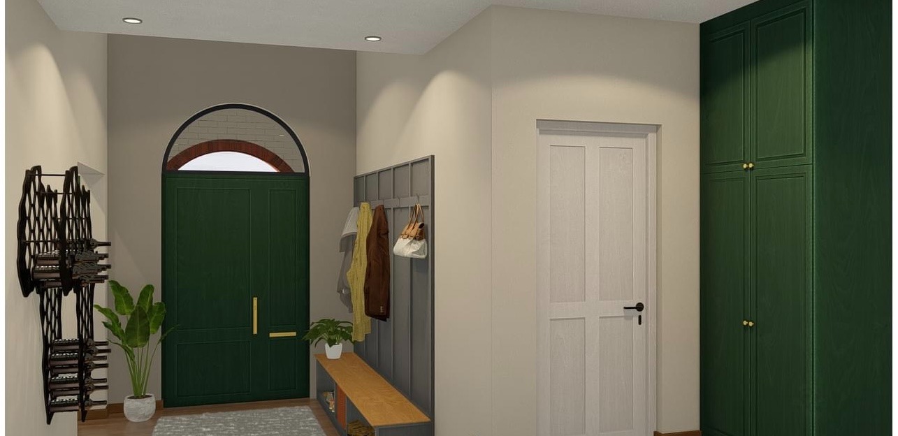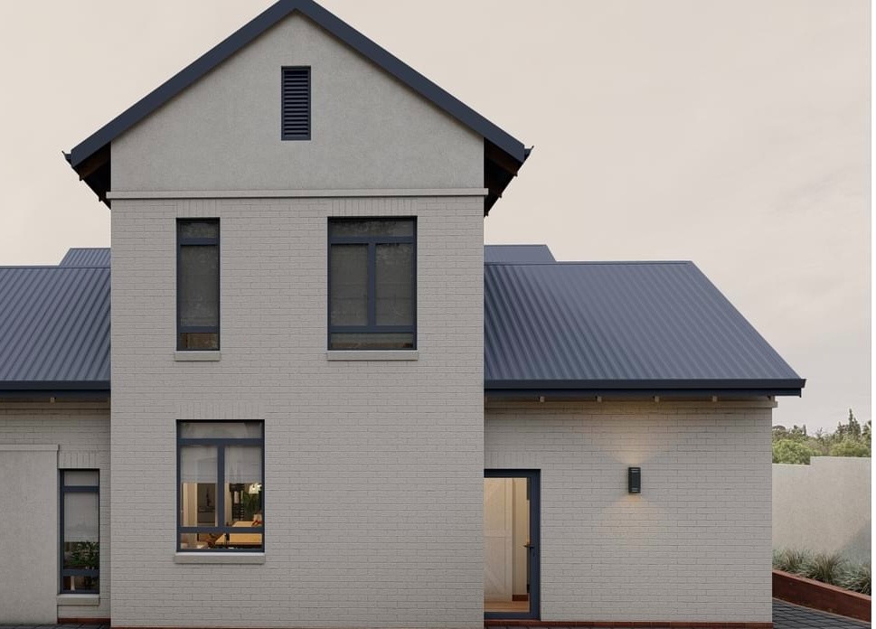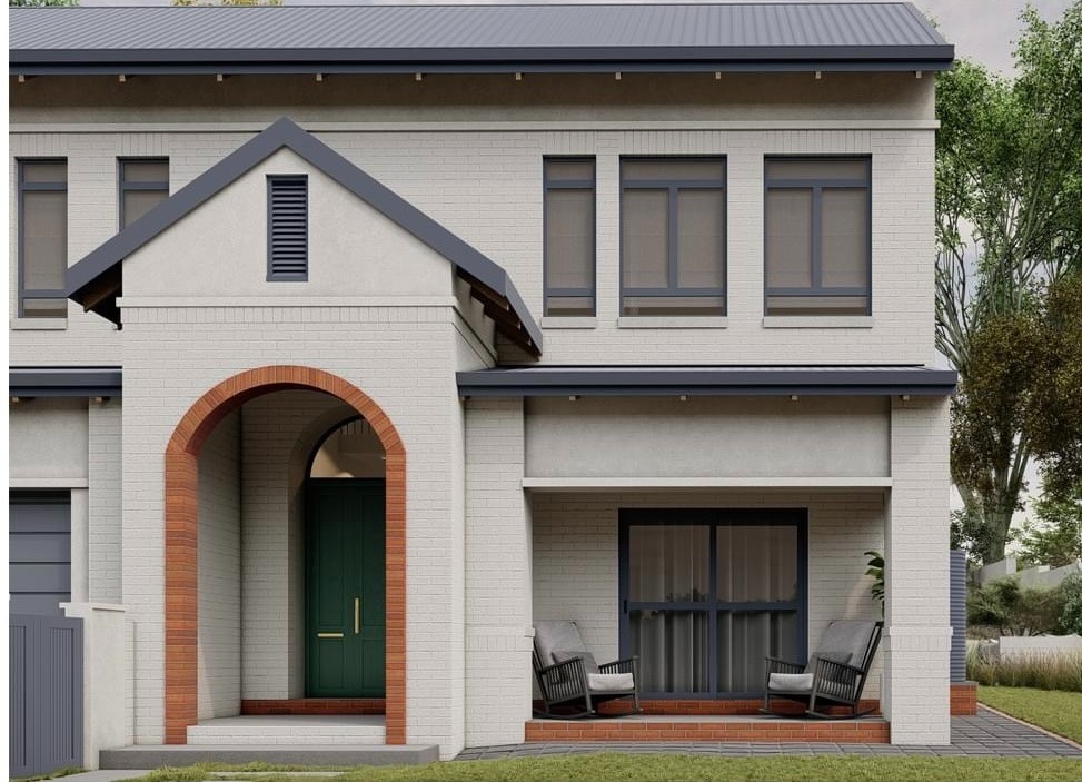 With its sophisticated charm, the home captivates passersby with its striking green front door, boldly juxtaposed against two sleek volumes beneath a distinguished face brick archway.