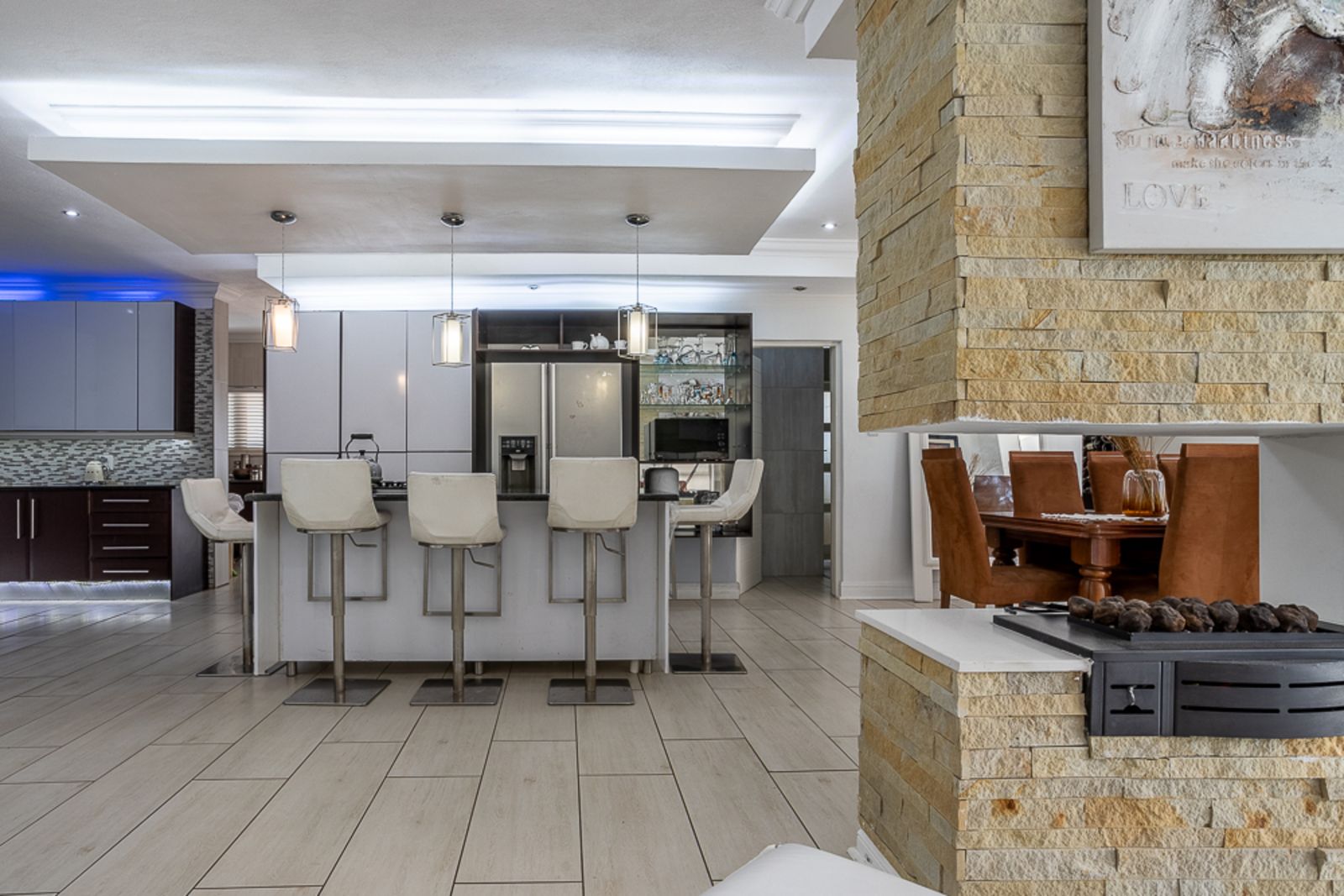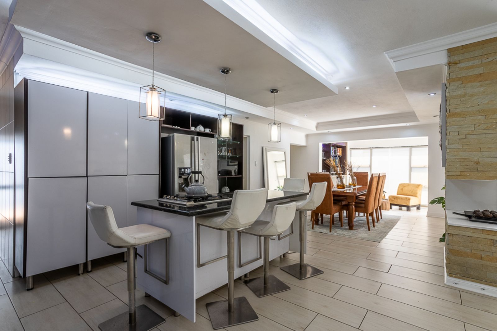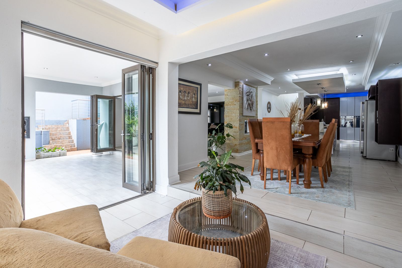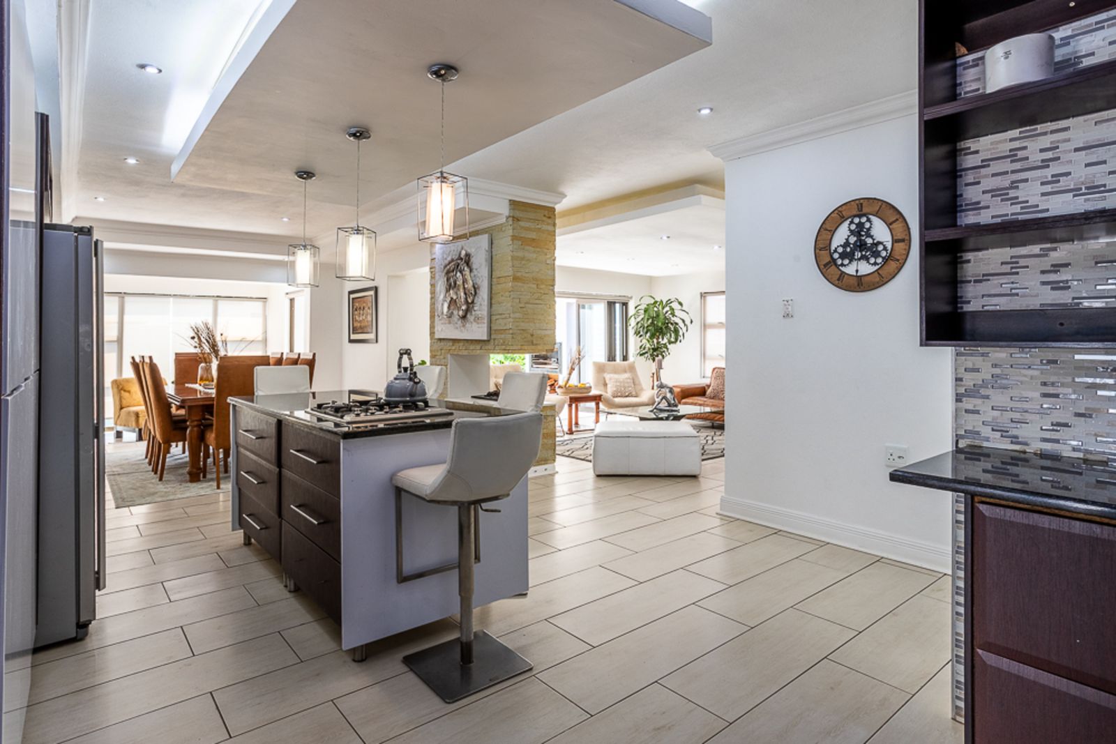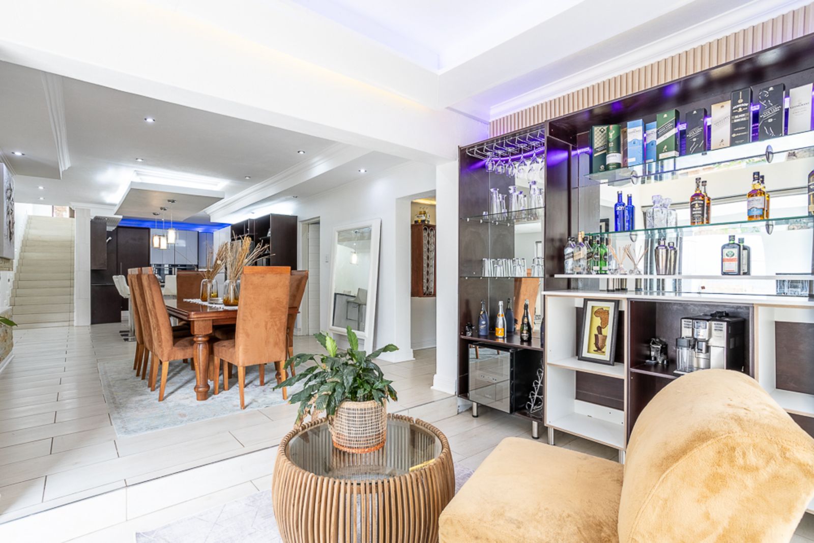 Upon entering, you are welcomed by an entrance hall that leads to a formal lounge, perfect for hosting guests. The open-plan design connects the family room and dining area to a state-of-the-art kitchen, equipped with two eye-level ovens, an induction and gas hob, a scullery, pantry, and a convenient kitchenette—ideal for culinary enthusiasts.
