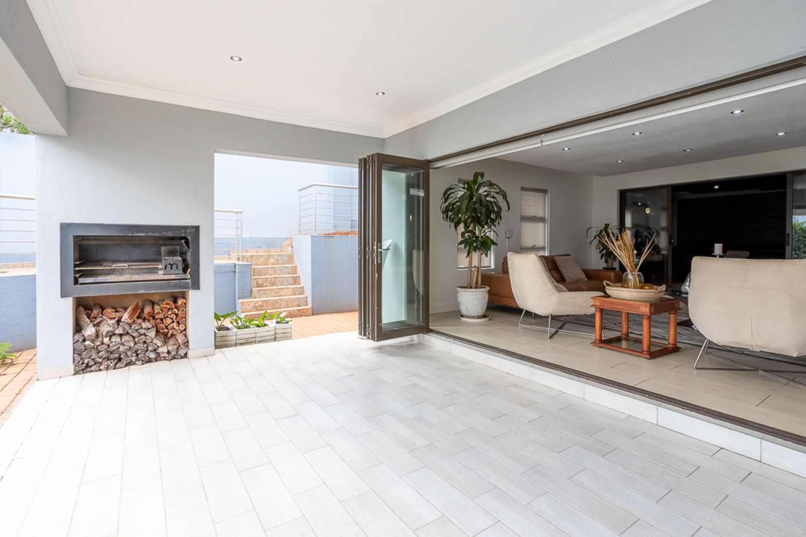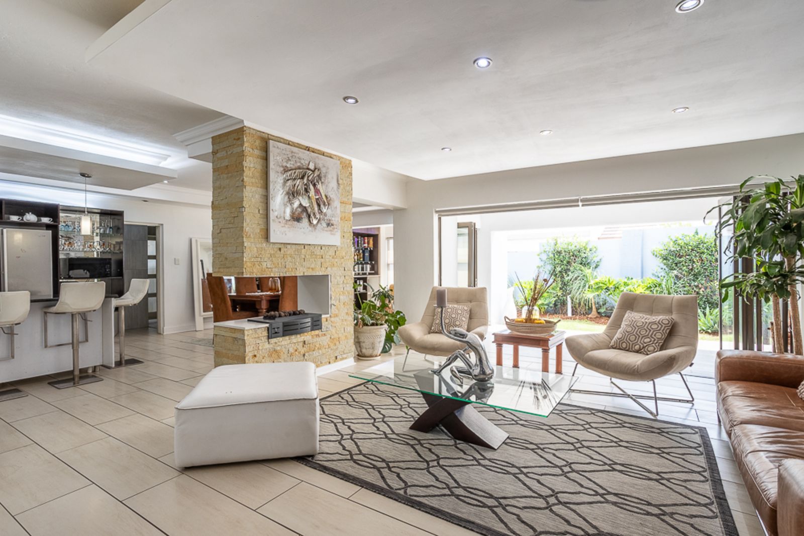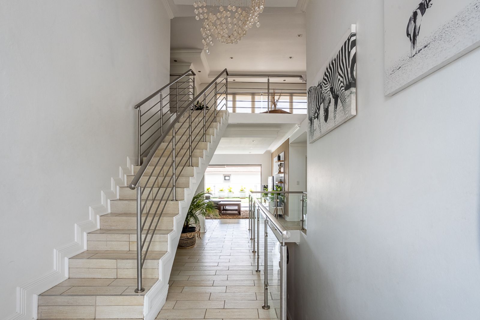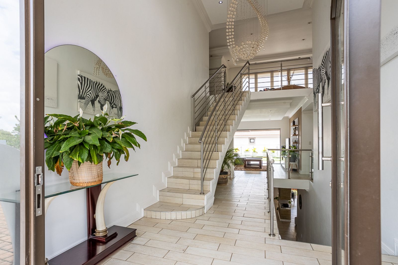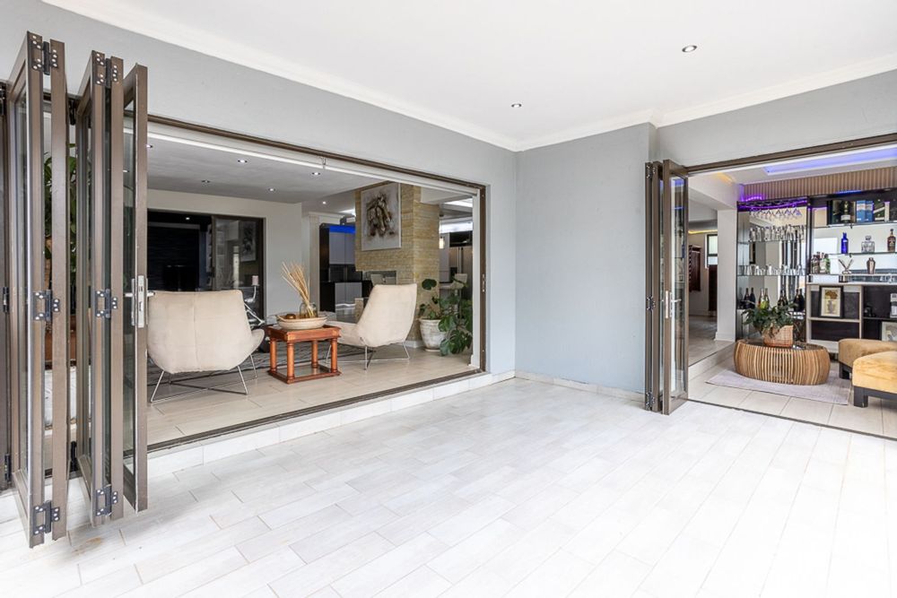 Upon entering, you are welcomed by an entrance hall that leads to a formal lounge, perfect for hosting guests. The open-plan design connects the family room and dining area to a state-of-the-art kitchen, equipped with two eye-level ovens, an induction and gas hob, a scullery, pantry, and a convenient kitchenette—ideal for culinary enthusiasts.