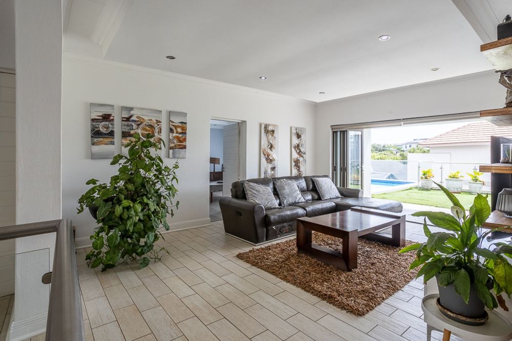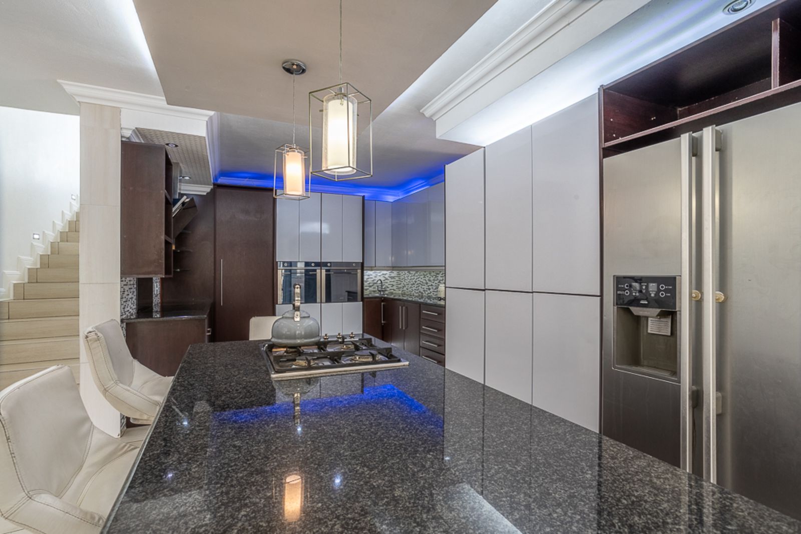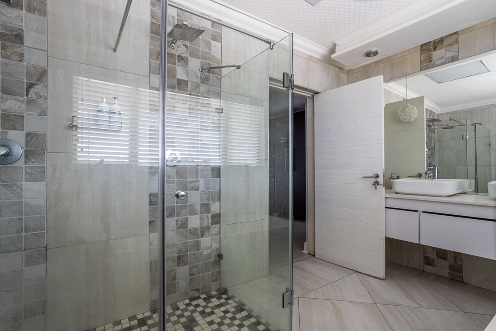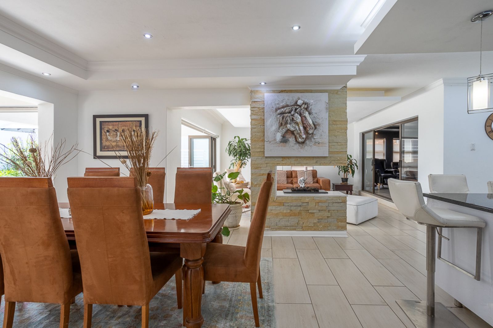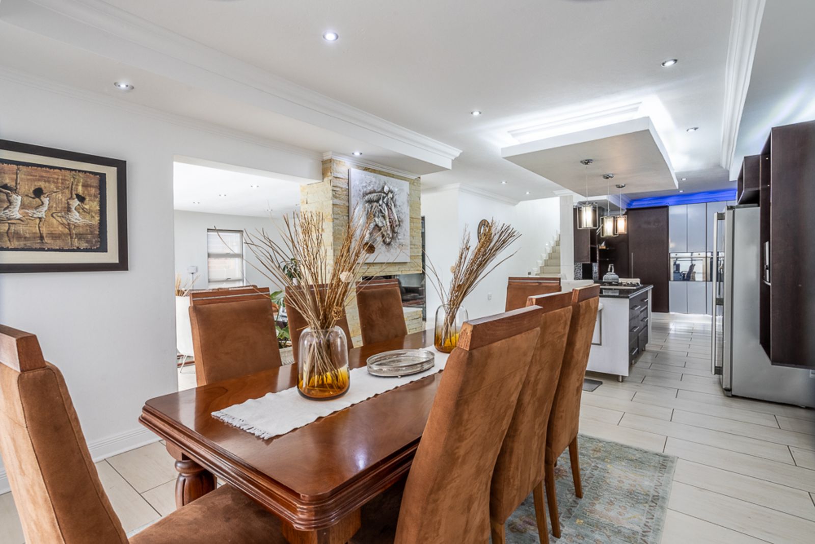 Upon entering, you are welcomed by an entrance hall that leads to a formal lounge, perfect for hosting guests. The open-plan design connects the family room and dining area to a state-of-the-art kitchen, equipped with two eye-level ovens, an induction and gas hob, a scullery, pantry, and a convenient kitchenette—ideal for culinary enthusiasts.