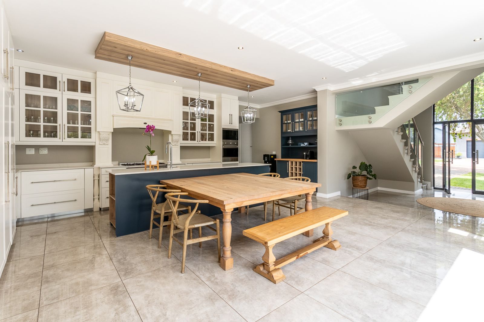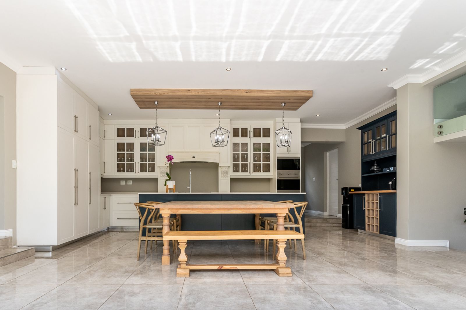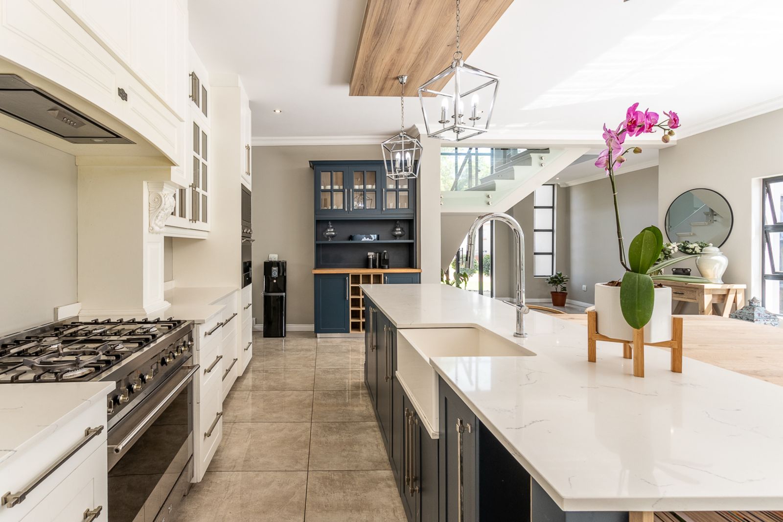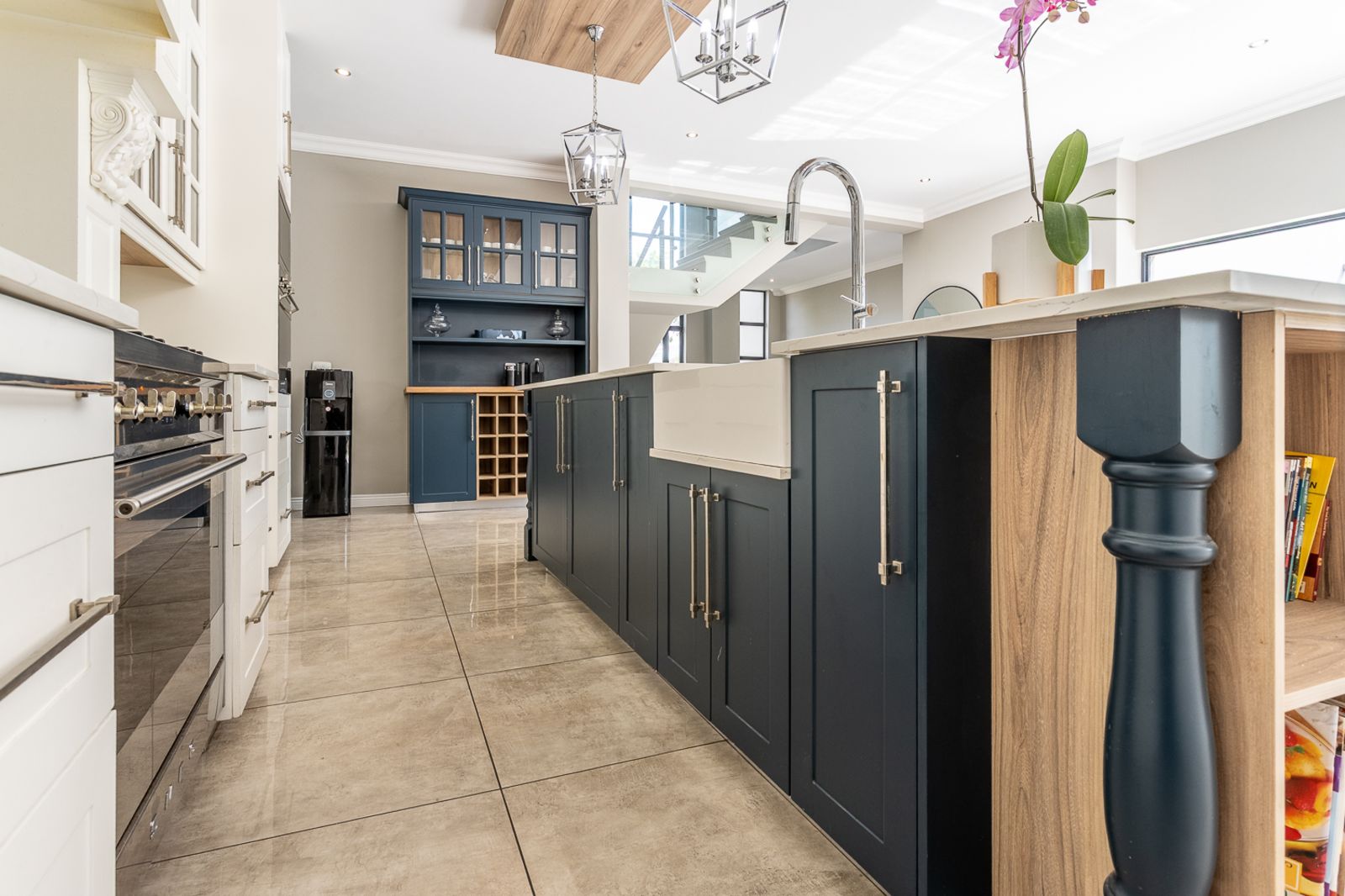 At the heart of the home is a contemporary kitchen featuring a Smeg stove, scullery, pantry, laundry, and breakfast nook. A custom coffee station, which doubles as a bar area, adds to the charm and function of the space.