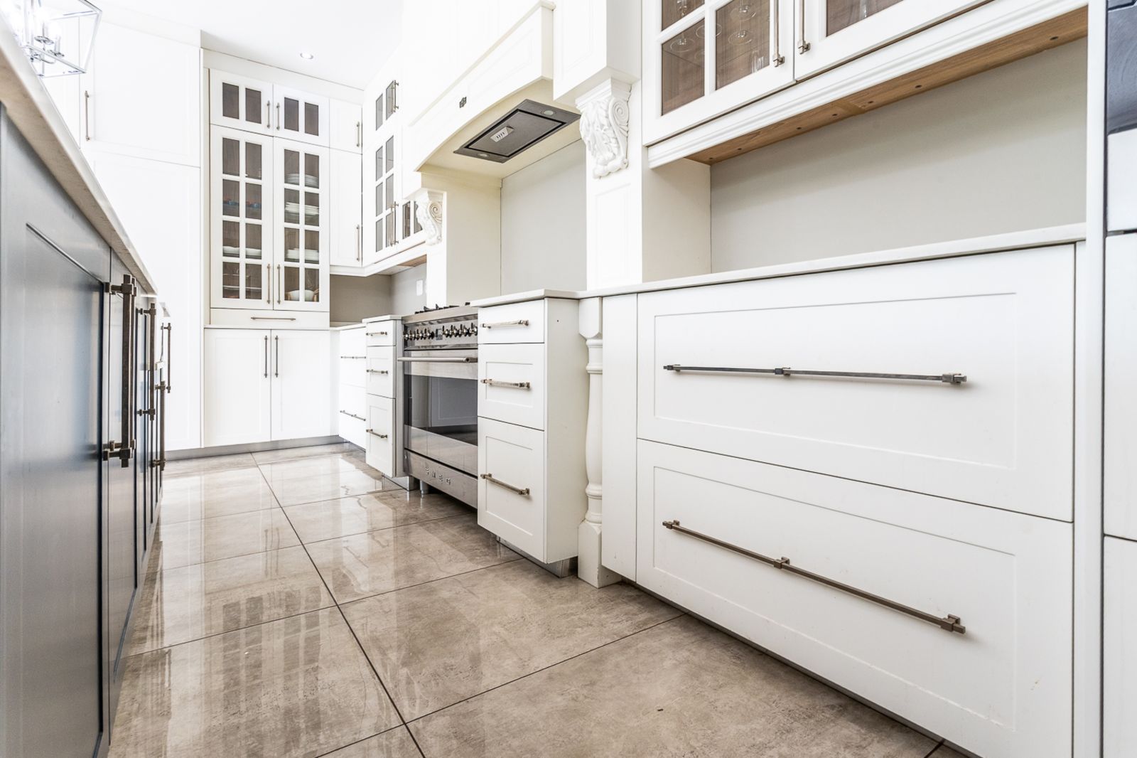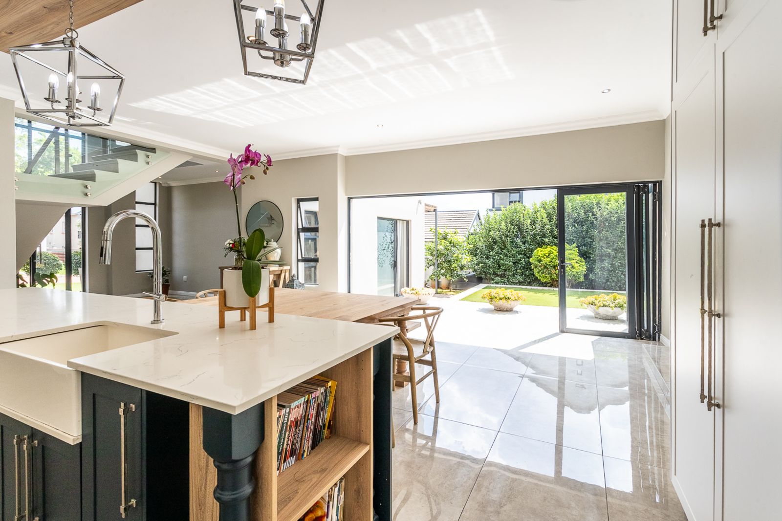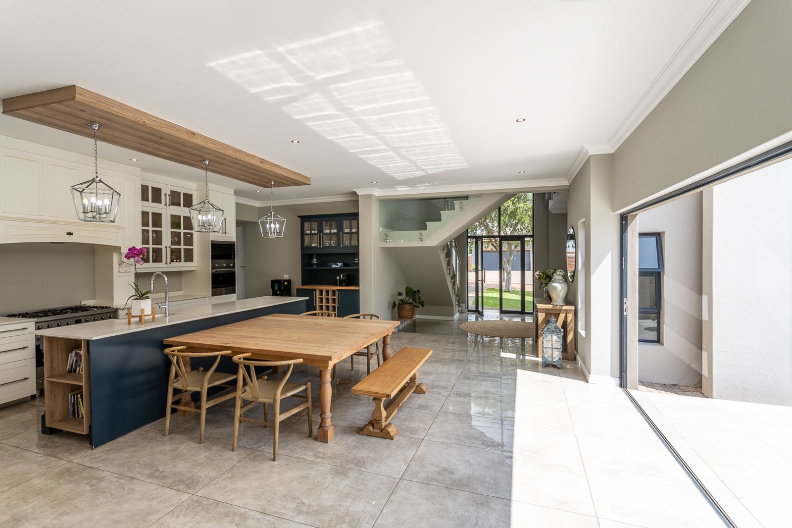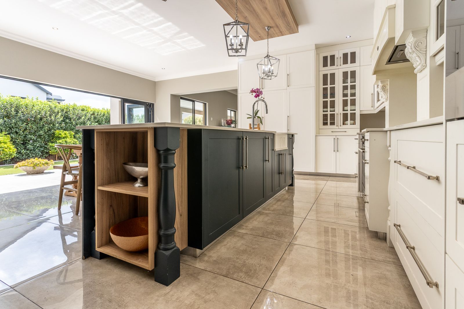 At the heart of the home is a contemporary kitchen featuring a Smeg stove, scullery, pantry, laundry, and breakfast nook. A custom coffee station, which doubles as a bar area, adds to the charm and function of the space.