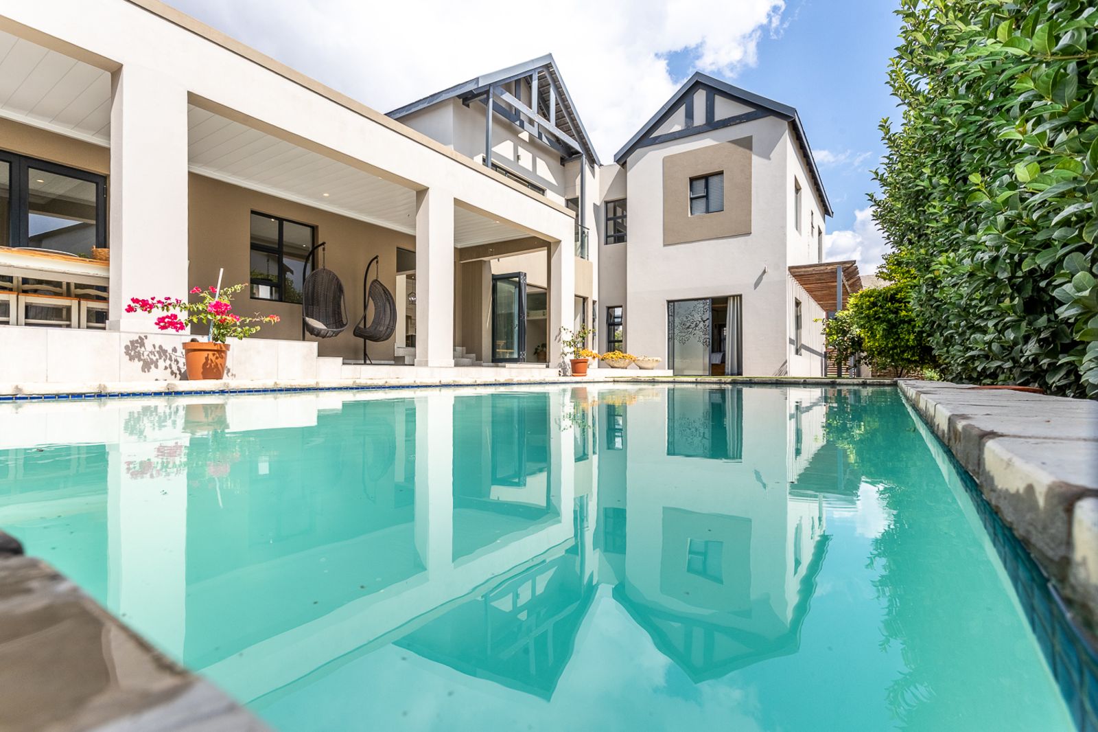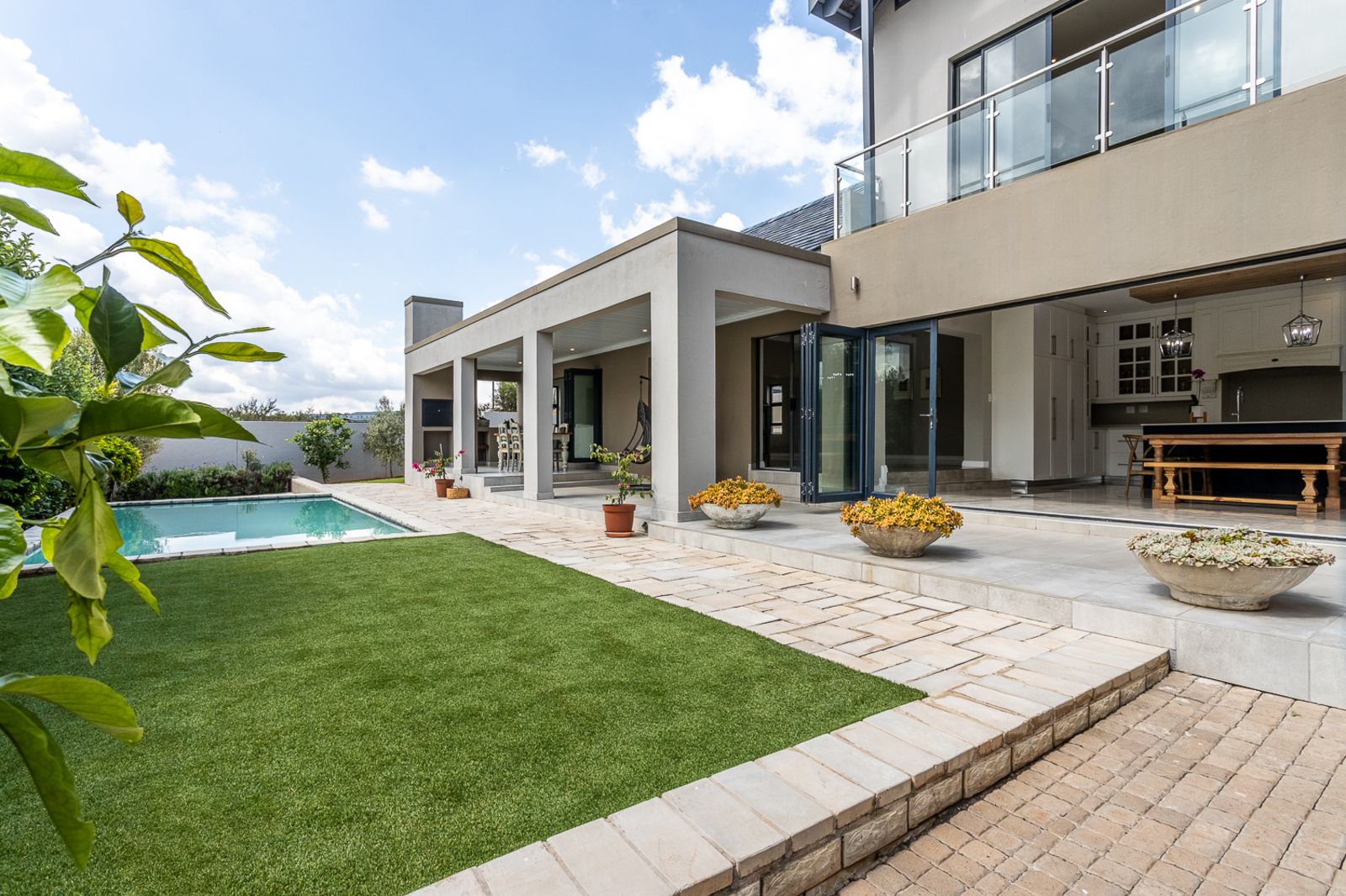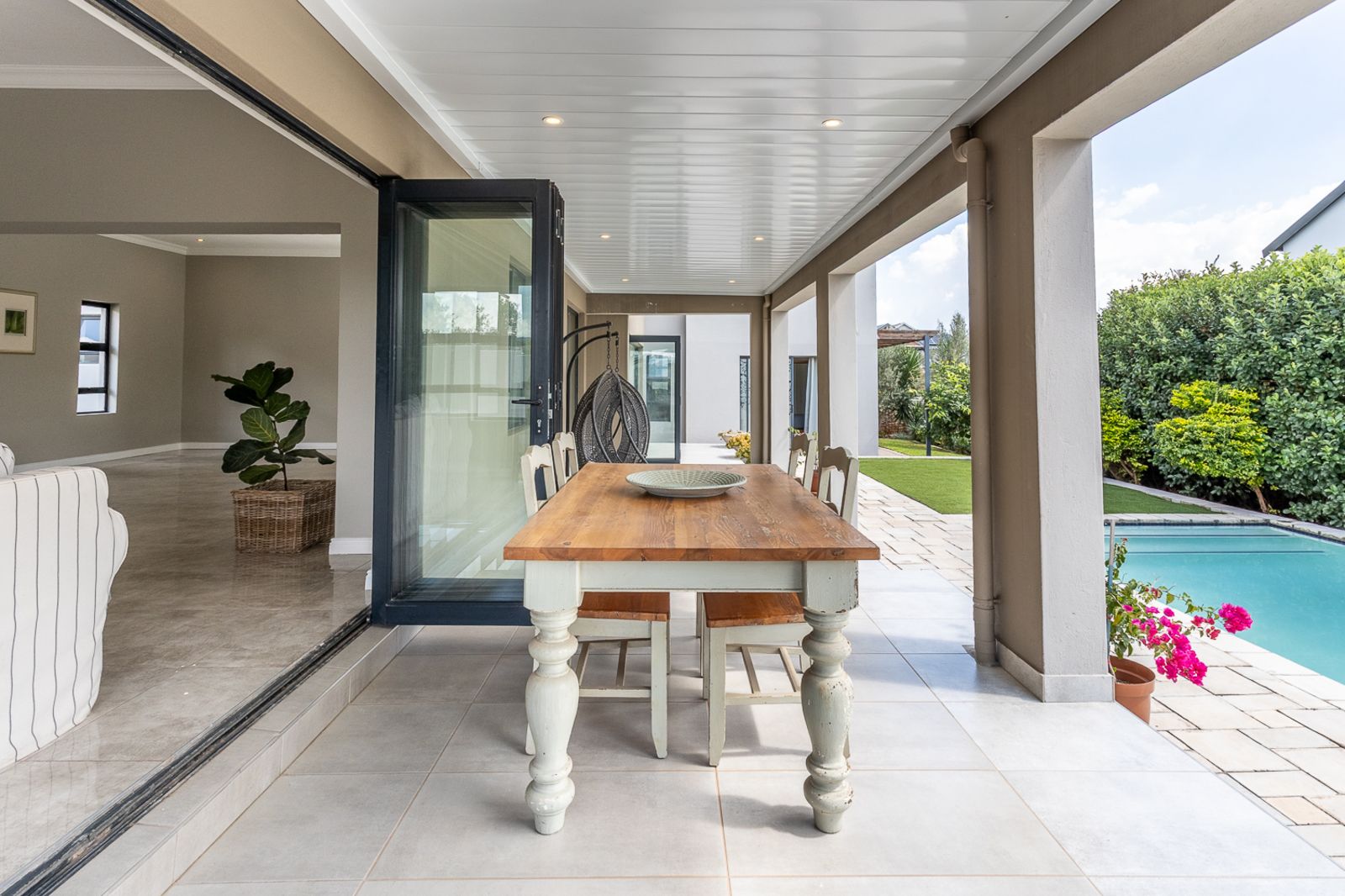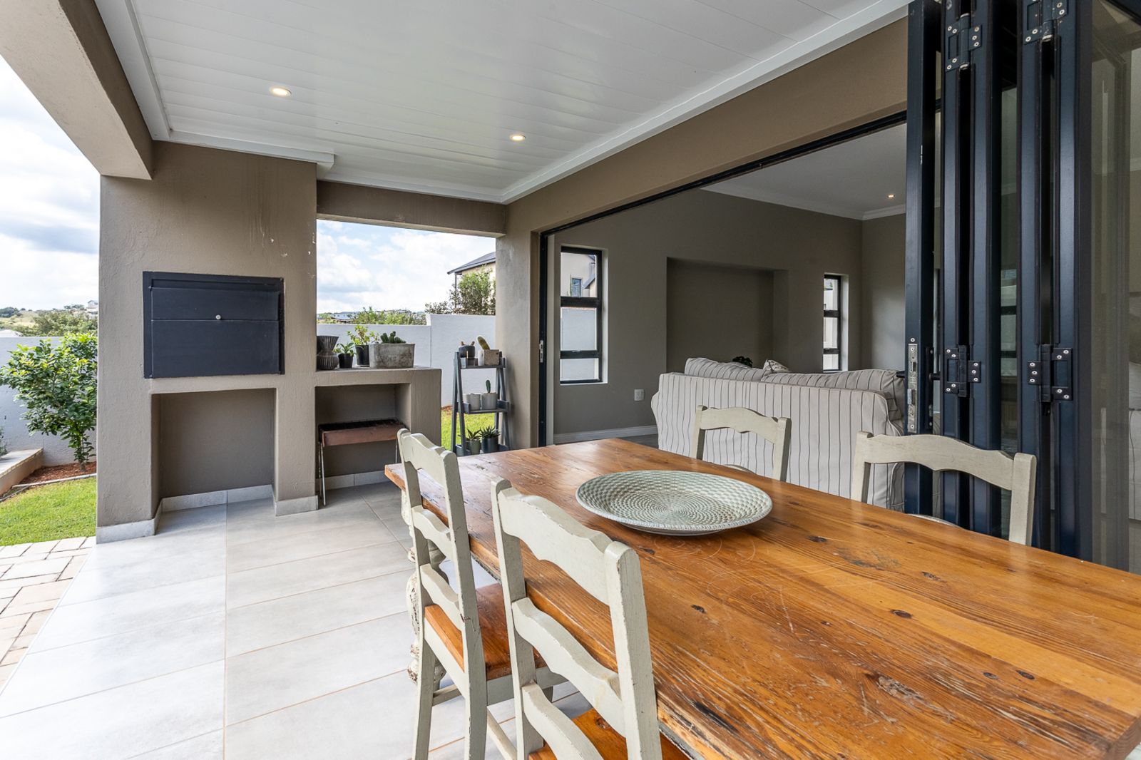 Entertain effortlessly as stacking doors open from the living areas onto a covered patio with a built-in braai, revealing a private pool area and beautifully landscaped garden—ideal for soaking up the sun, hosting friends, or spending quality time with family.