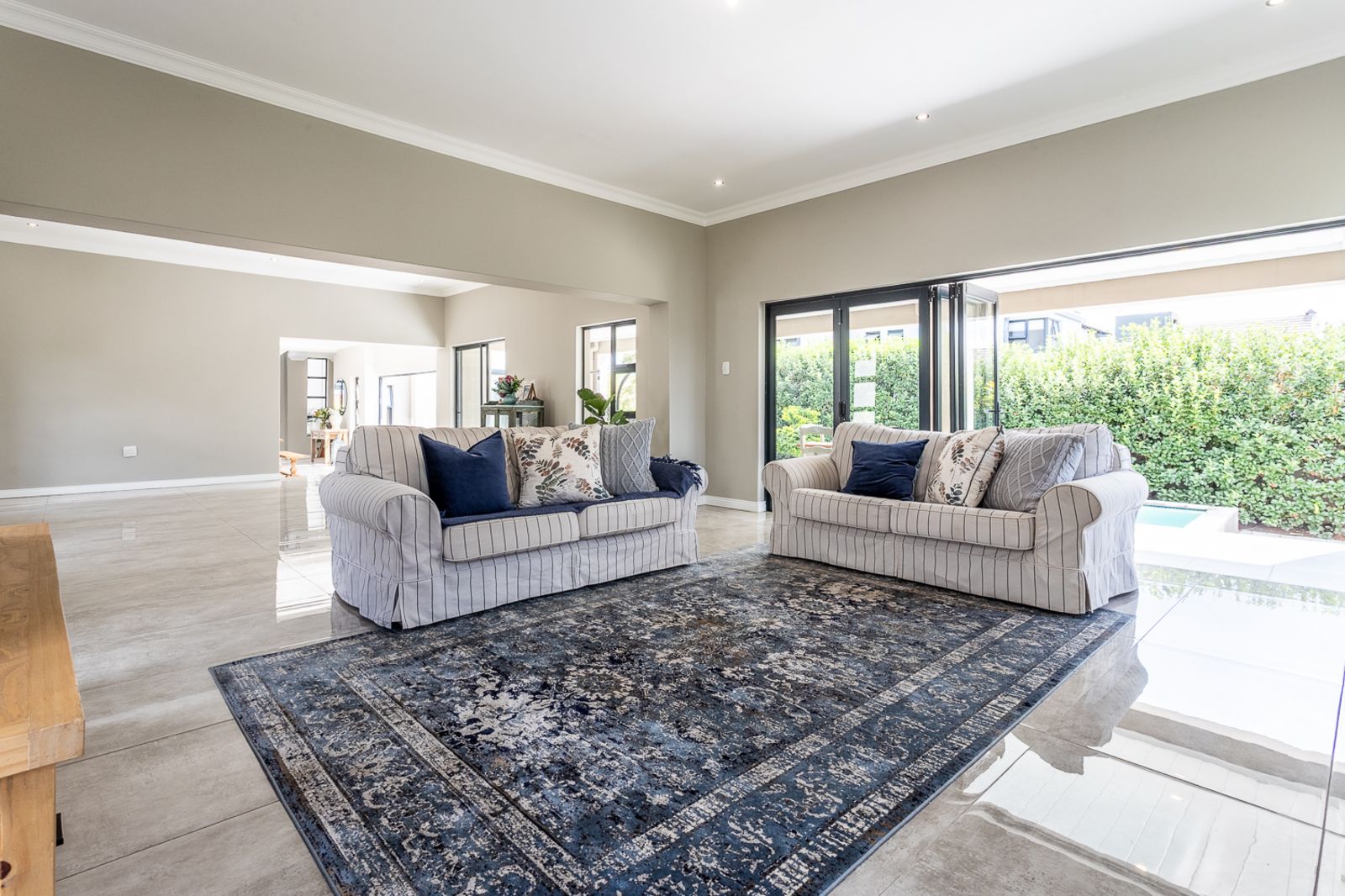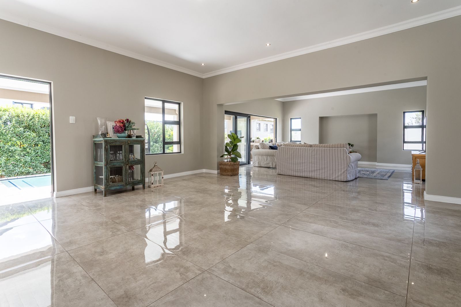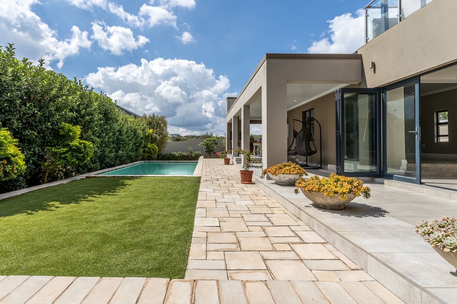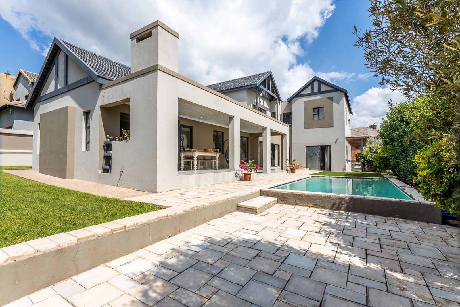 Entertain effortlessly as stacking doors open from the living areas onto a covered patio with a built-in braai, revealing a private pool area and beautifully landscaped garden—ideal for soaking up the sun, hosting friends, or spending quality time with family.