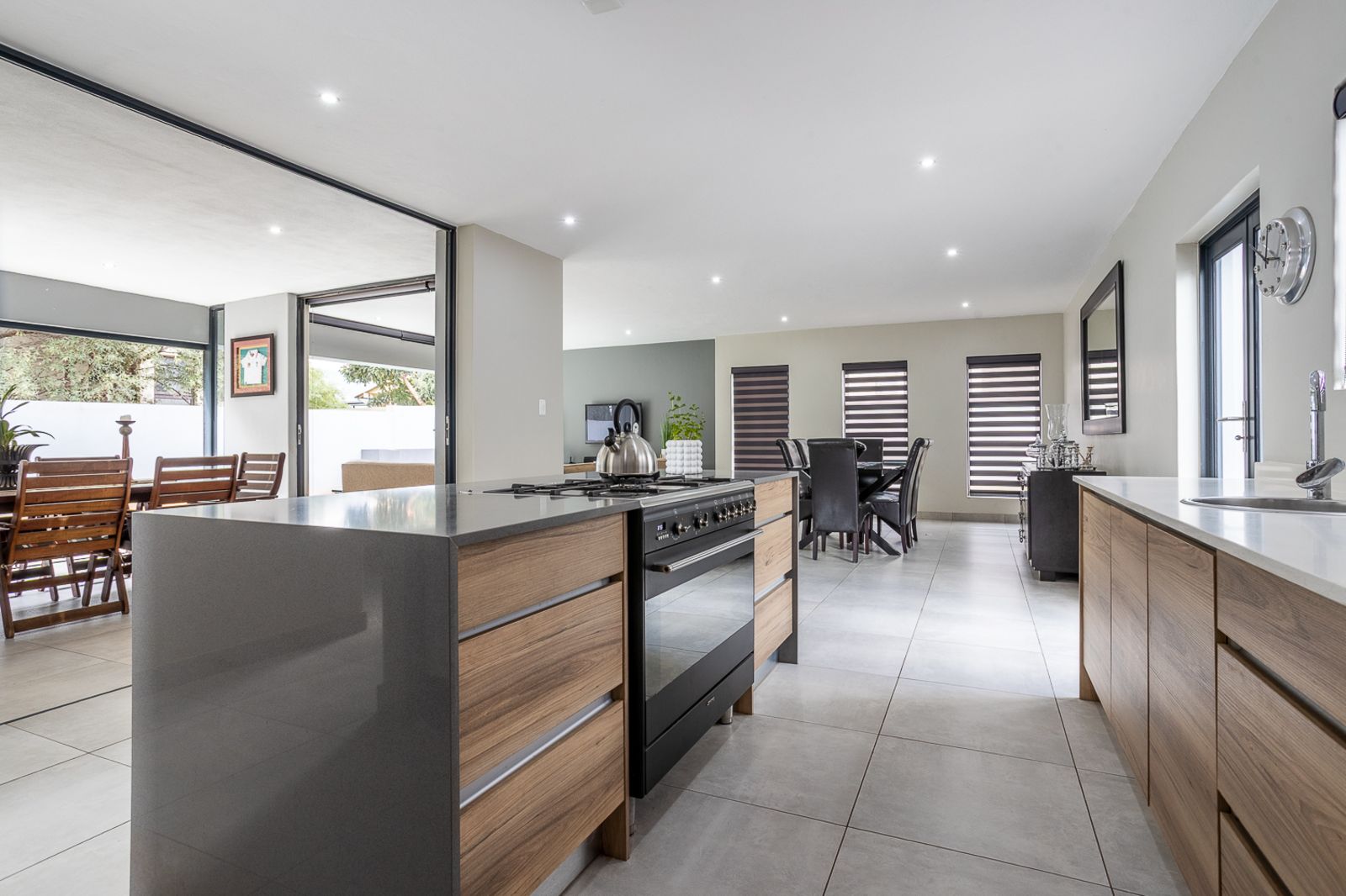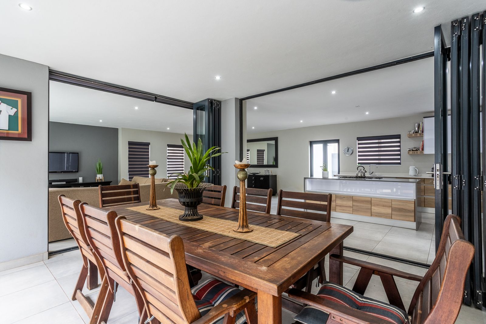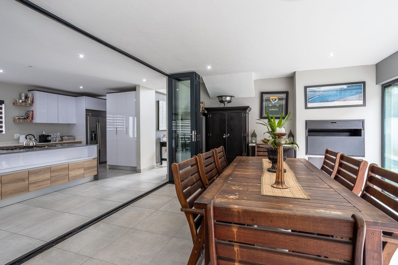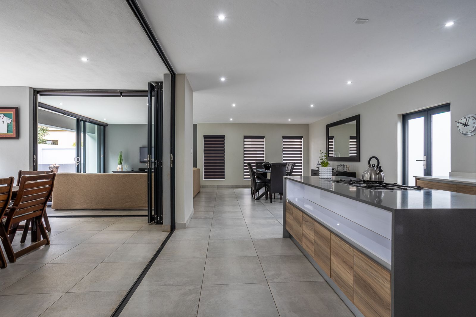Step outside to a stylish covered patio with frameless glass stacking doors, creating a seamless flow between indoor and outdoor spaces. The built-in braai, landscaped garden, and sparkling swimming pool make this an entertainer’s dream.