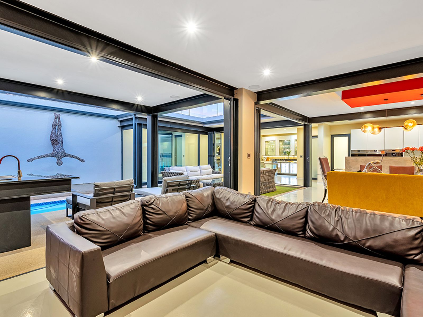 Step through a grand entrance hall into a home that exudes warmth and sophistication. The open-plan living spaces include a stylish dining room, family/TV room with a gas fireplace, and a fully integrated bar—perfect for entertaining. The deck, patio, and boma seamlessly connect the interior to the beautifully landscaped garden with automated irrigation, offering an ideal setting for gatherings or tranquil moments.