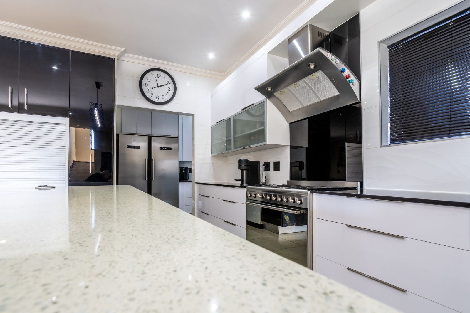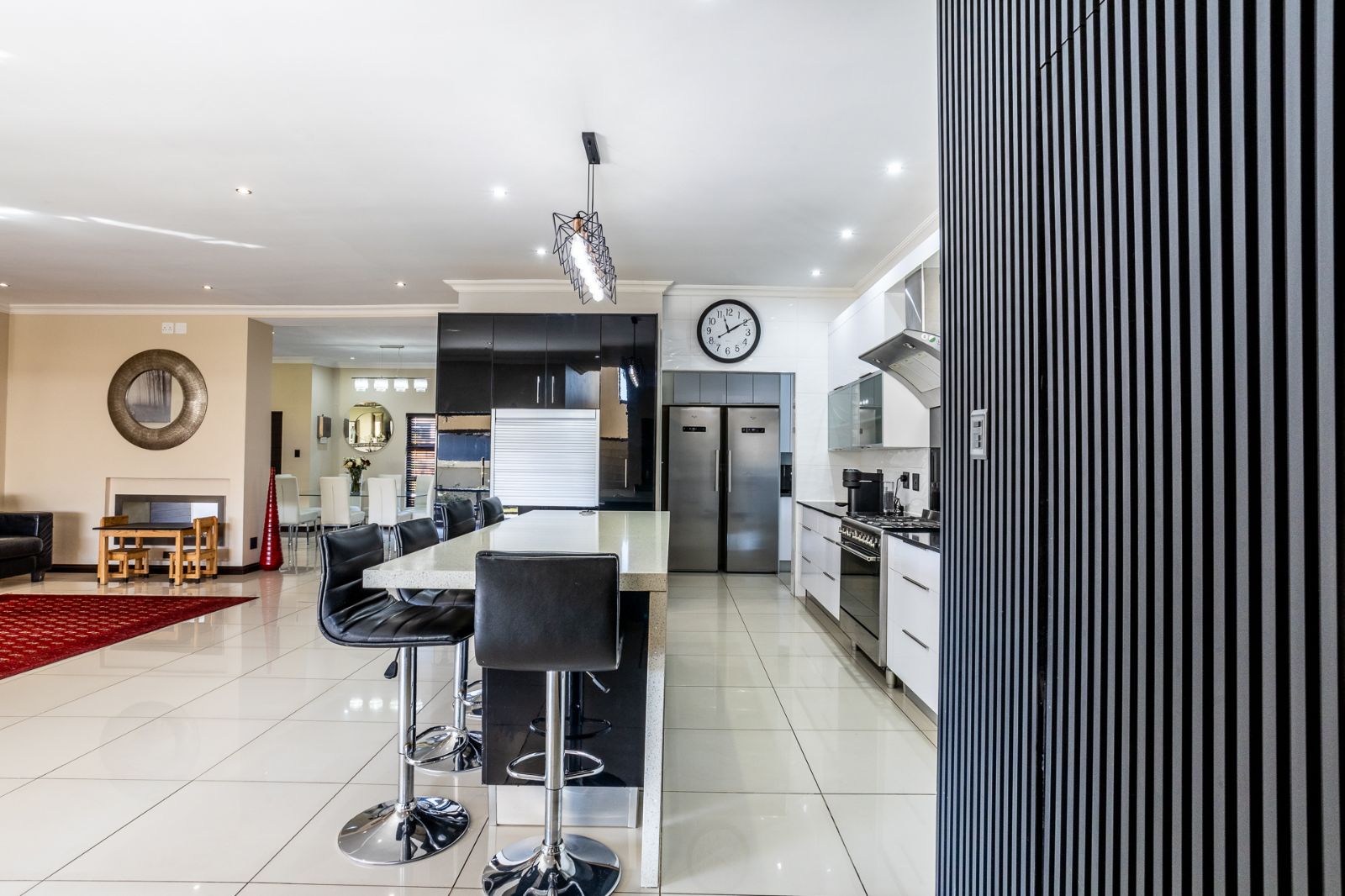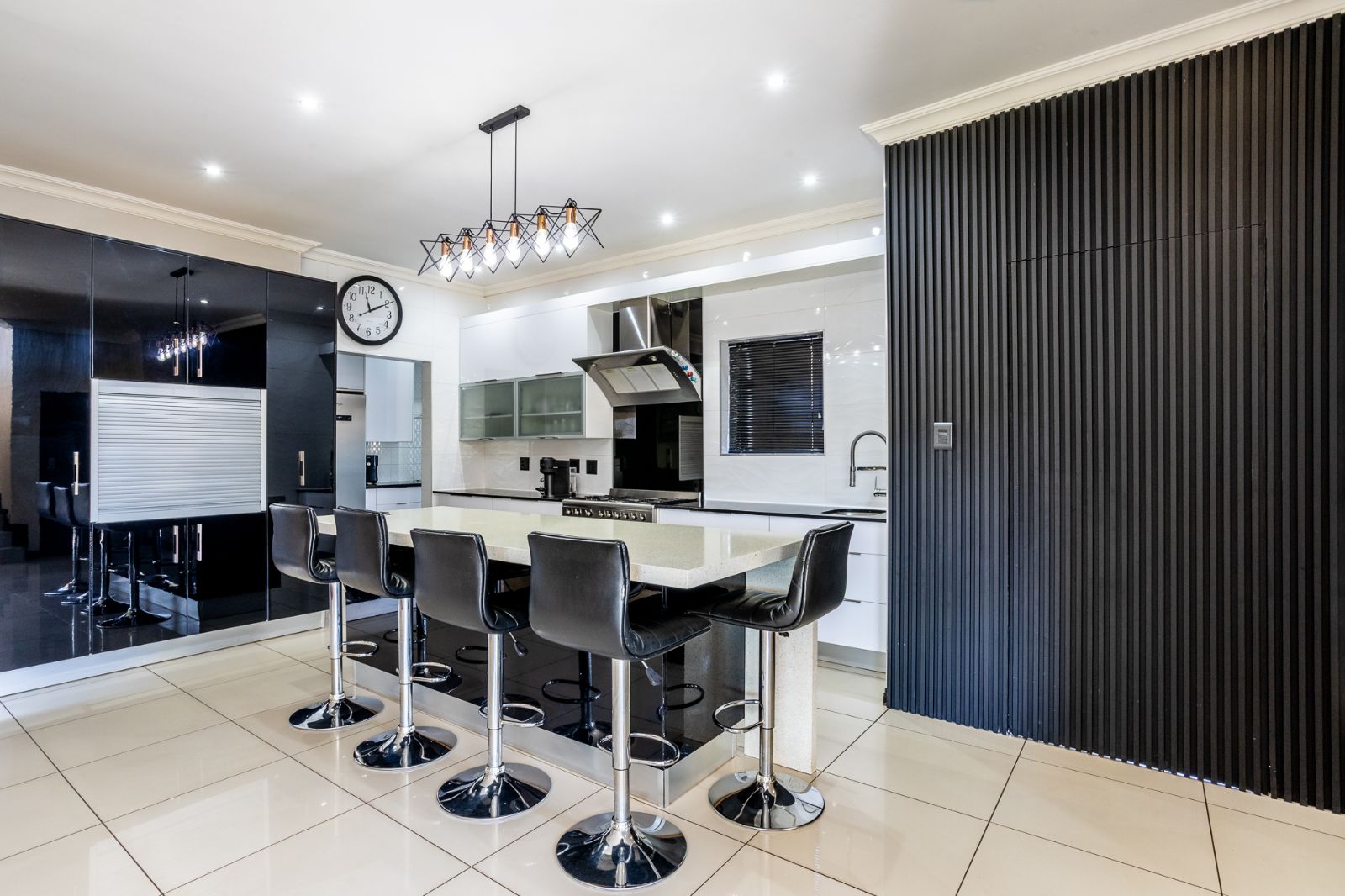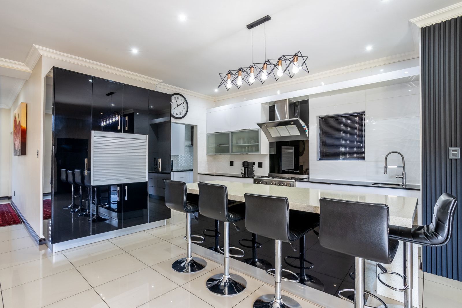 The home opens into a warm and inviting lounge/TV room, featuring a beautiful built-in fireplace – perfect for cosy evenings with family or entertaining guests. The open-plan dining area connects effortlessly to the modern front kitchen, complete with a stylish coffee station cleverly concealed behind a pull-down aluminium door. A fully-equipped chef’s kitchen at the back, along with a separate scullery and laundry, ensures a streamlined cooking and living experience.