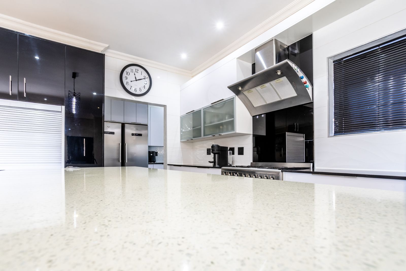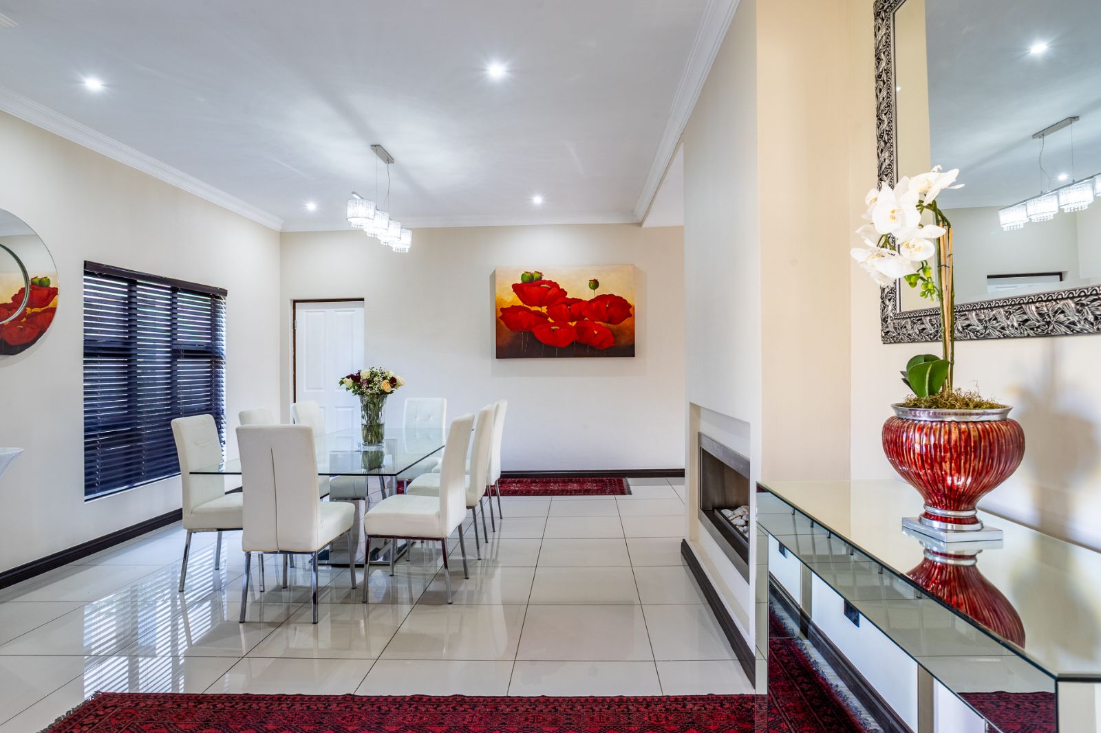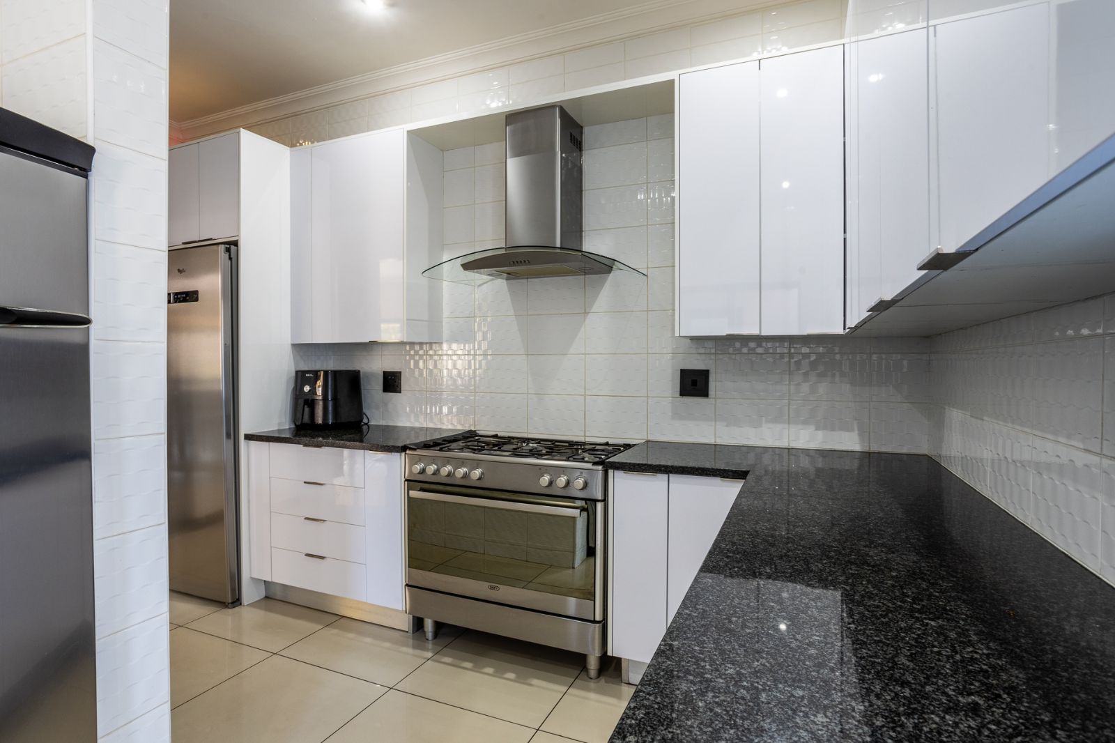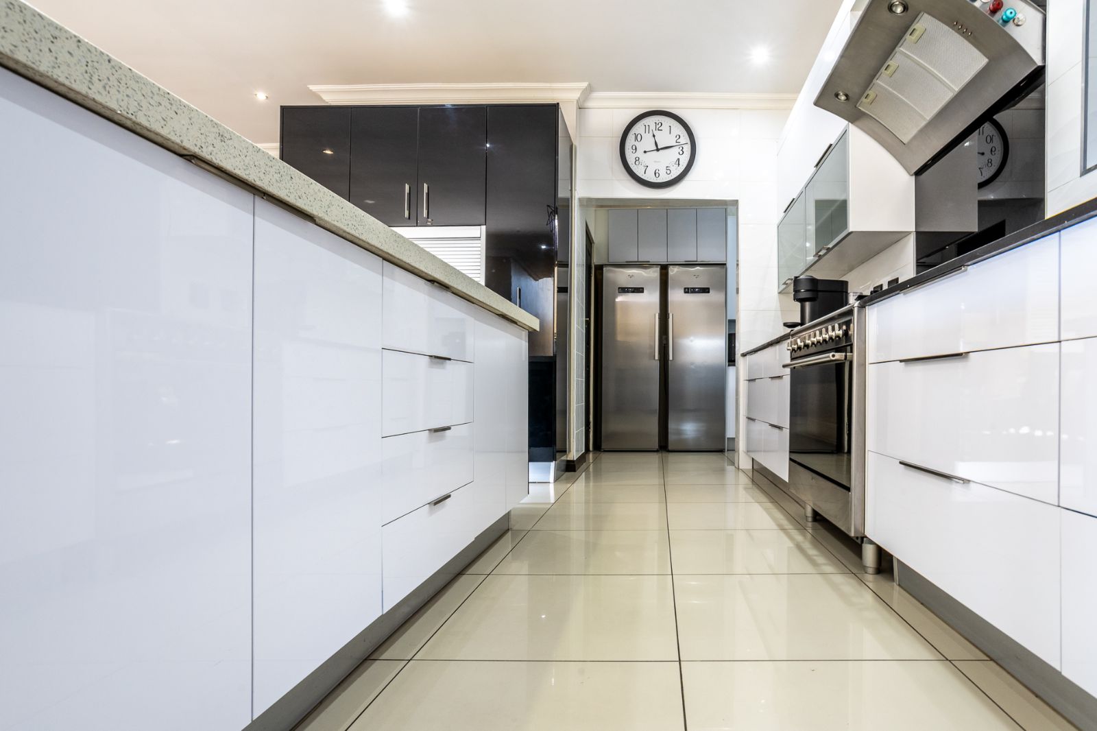 The home opens into a warm and inviting lounge/TV room, featuring a beautiful built-in fireplace – perfect for cosy evenings with family or entertaining guests. The open-plan dining area connects effortlessly to the modern front kitchen, complete with a stylish coffee station cleverly concealed behind a pull-down aluminium door. A fully-equipped chef’s kitchen at the back, along with a separate scullery and laundry, ensures a streamlined cooking and living experience.