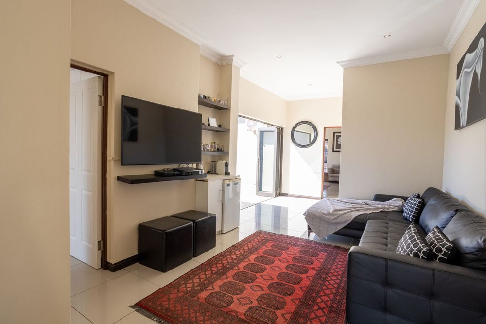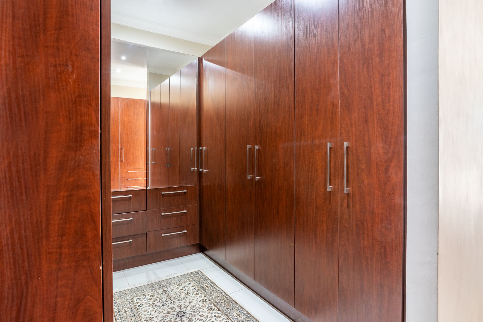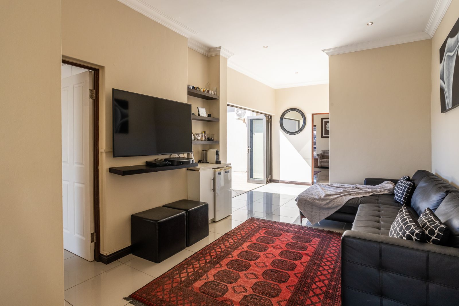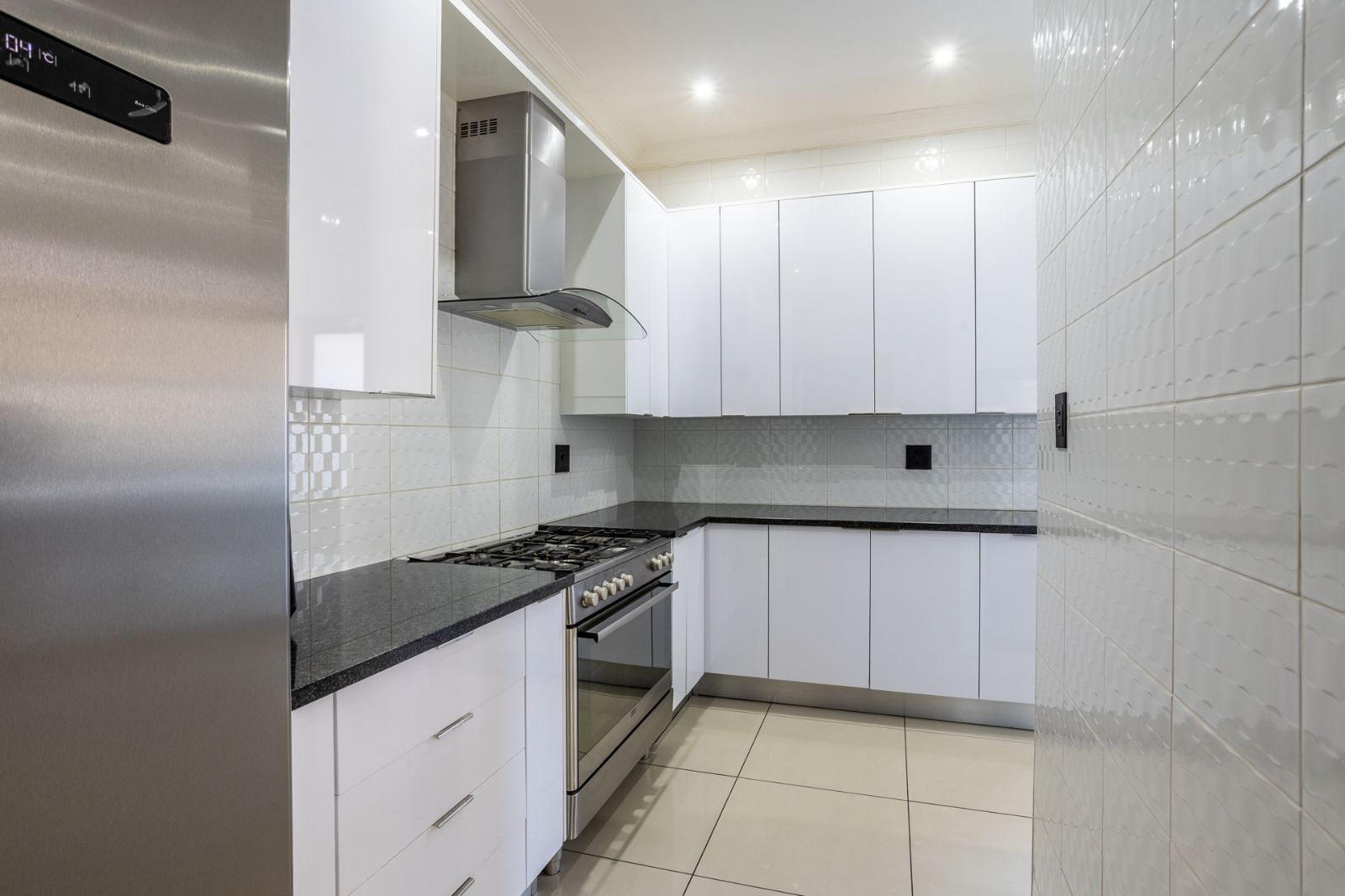 The home opens into a warm and inviting lounge/TV room, featuring a beautiful built-in fireplace – perfect for cosy evenings with family or entertaining guests. The open-plan dining area connects effortlessly to the modern front kitchen, complete with a stylish coffee station cleverly concealed behind a pull-down aluminium door. A fully-equipped chef’s kitchen at the back, along with a separate scullery and laundry, ensures a streamlined cooking and living experience.