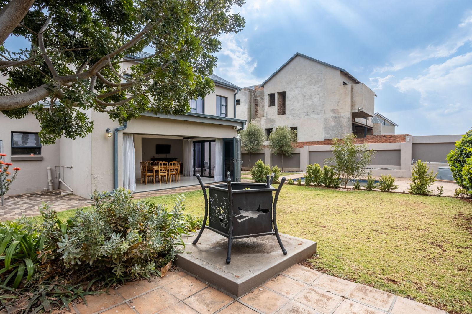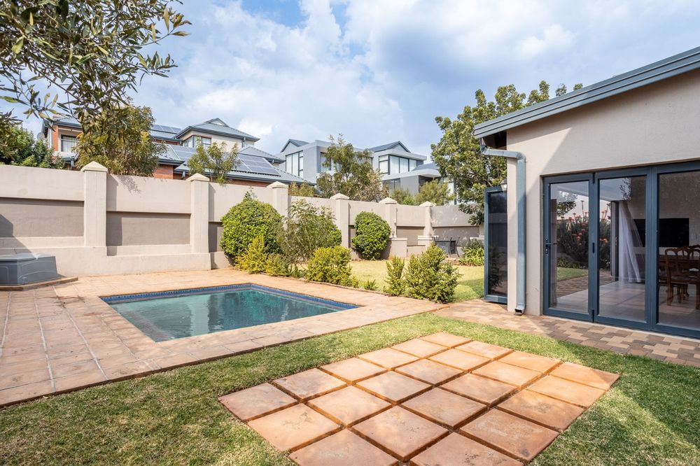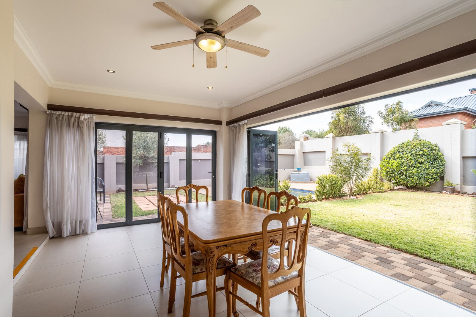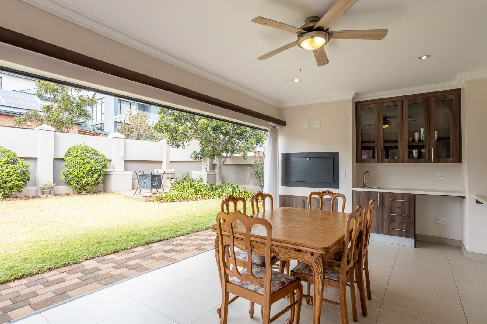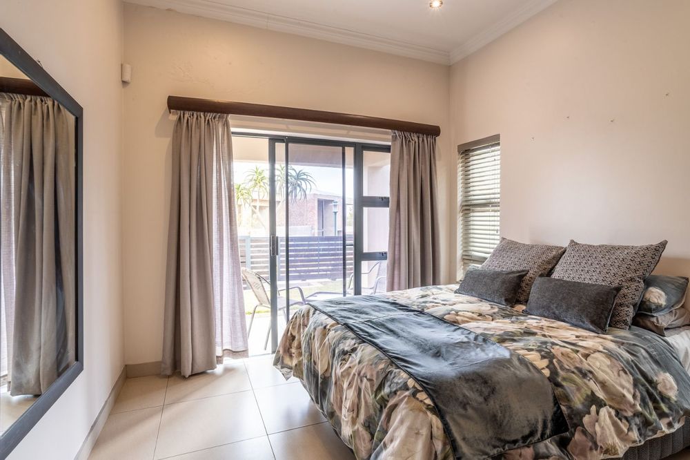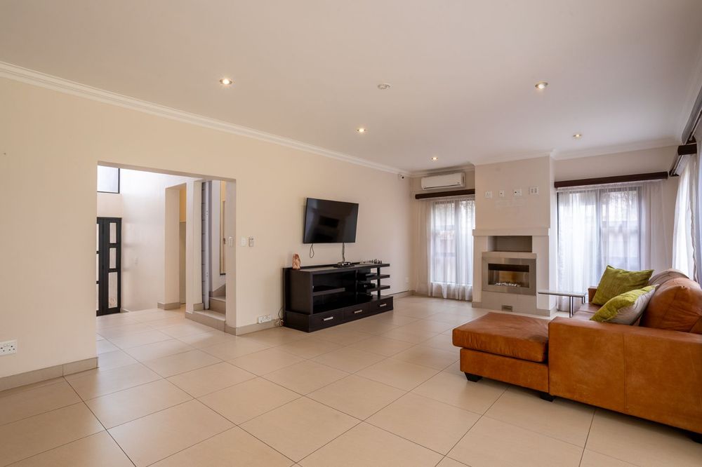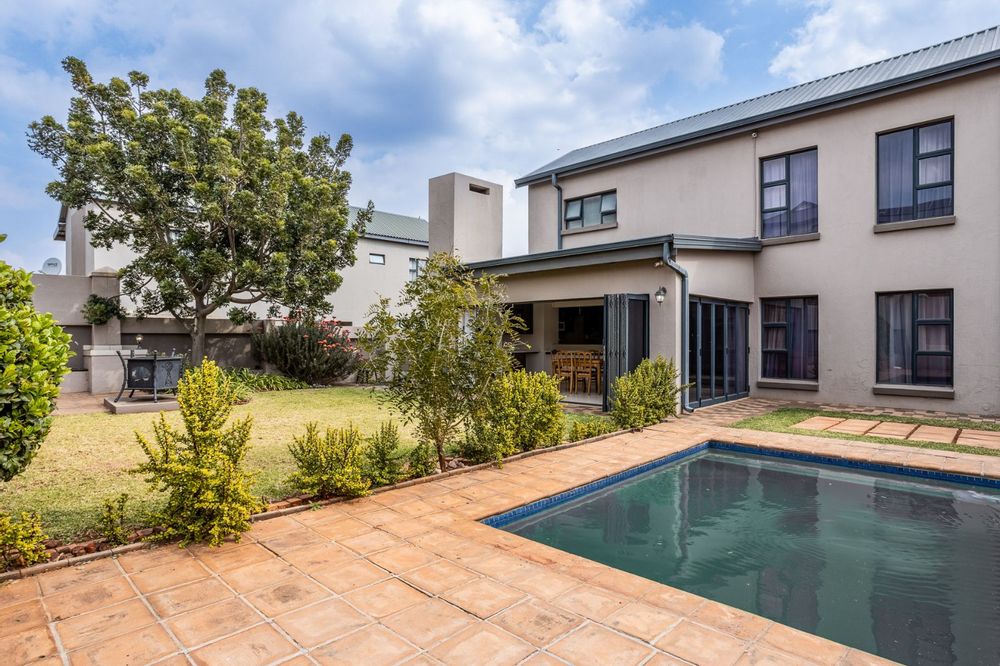 A highlight of this home is the enclosed patio with stack doors and a built-in braai, creating a versatile all-season entertainment space. Open the doors to extend your living area to the boma, sparkling pool, and landscaped garden—perfect for relaxed evenings or entertaining under the stars.