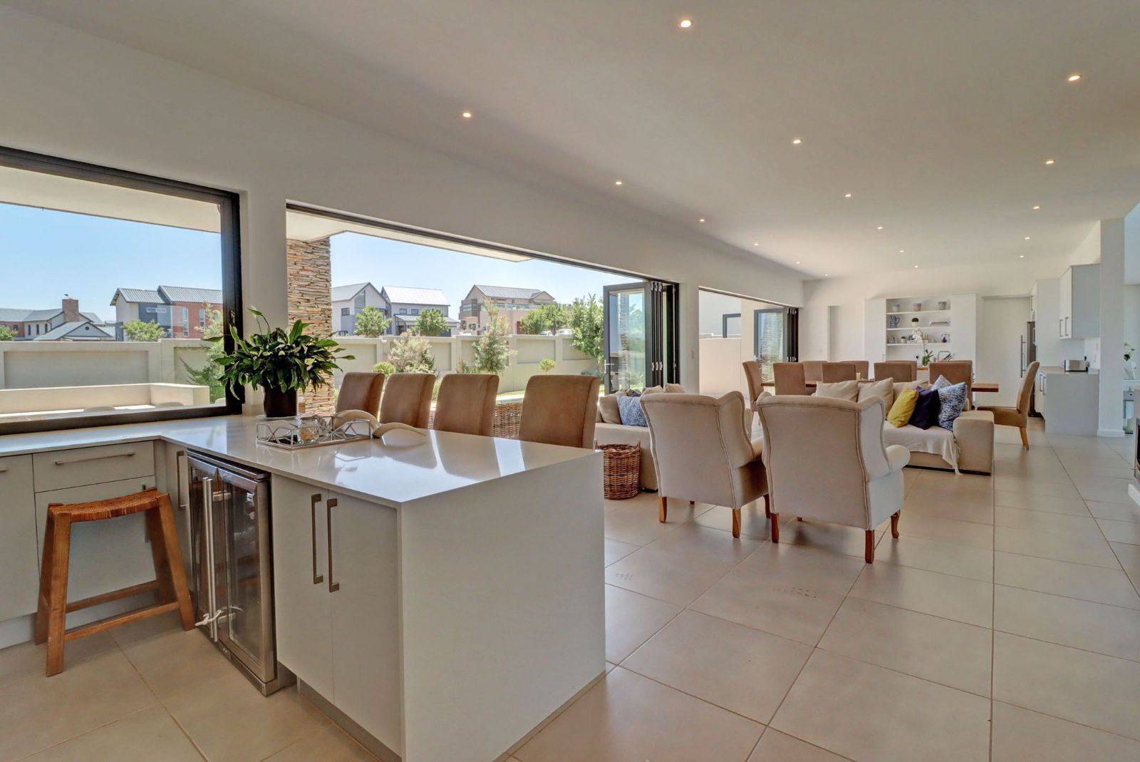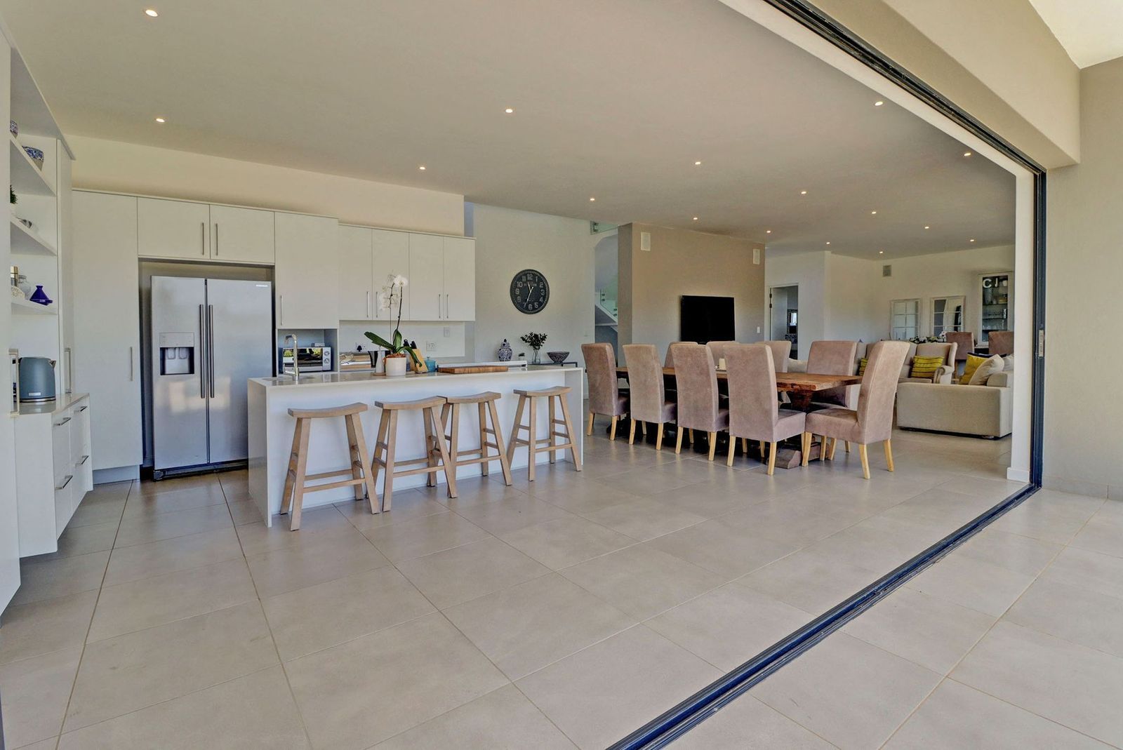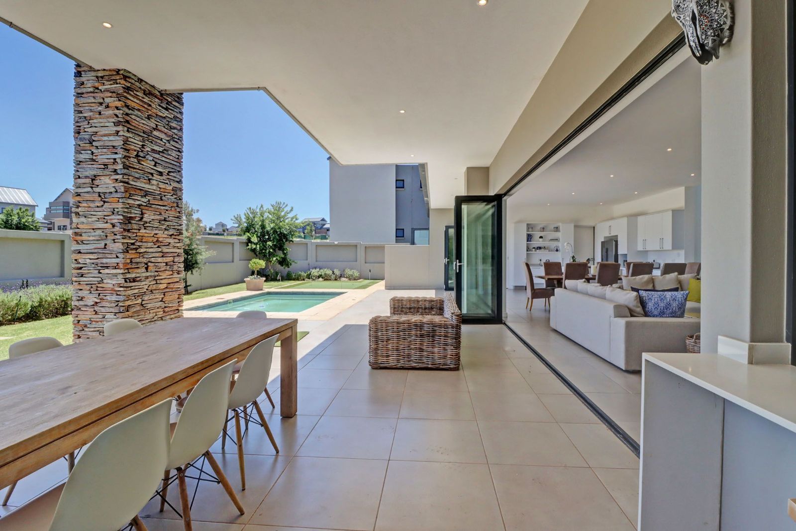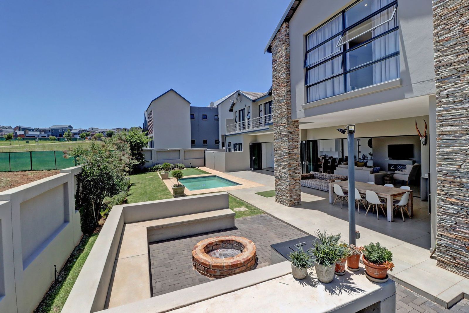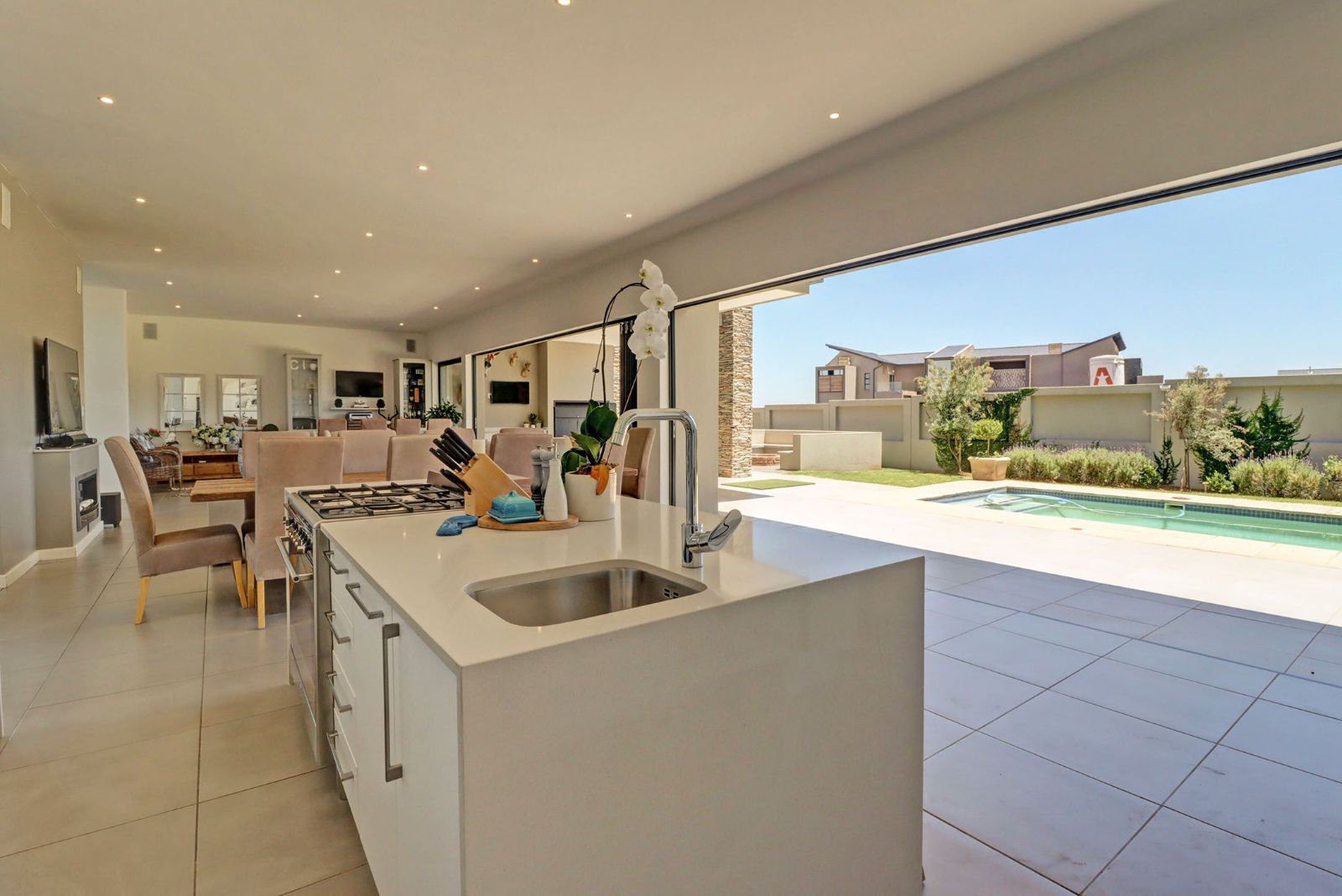 At the heart of the home lies a beautifully integrated open-plan living space. The designer kitchen, elegant dining area, expansive lounge with a feature gas fireplace form a cohesive and inviting hub. Stacking glass doors open this space entirely to a generous covered patio, thoughtfully designed for entertaining—with a built-in braai, ample prep space, storage, and distinct areas for dining and lounging. From here, the landscaped garden unfolds to reveal a boma, sparkling pool, and private putting green—perfect for relaxed family living and unforgettable gatherings.