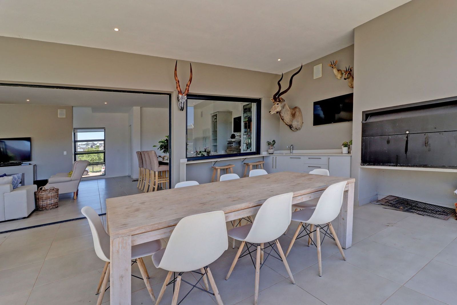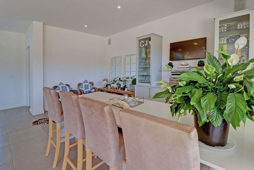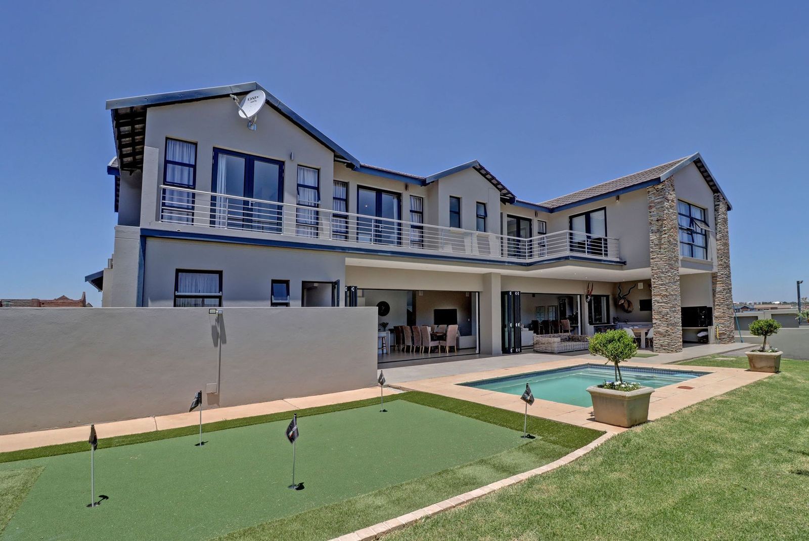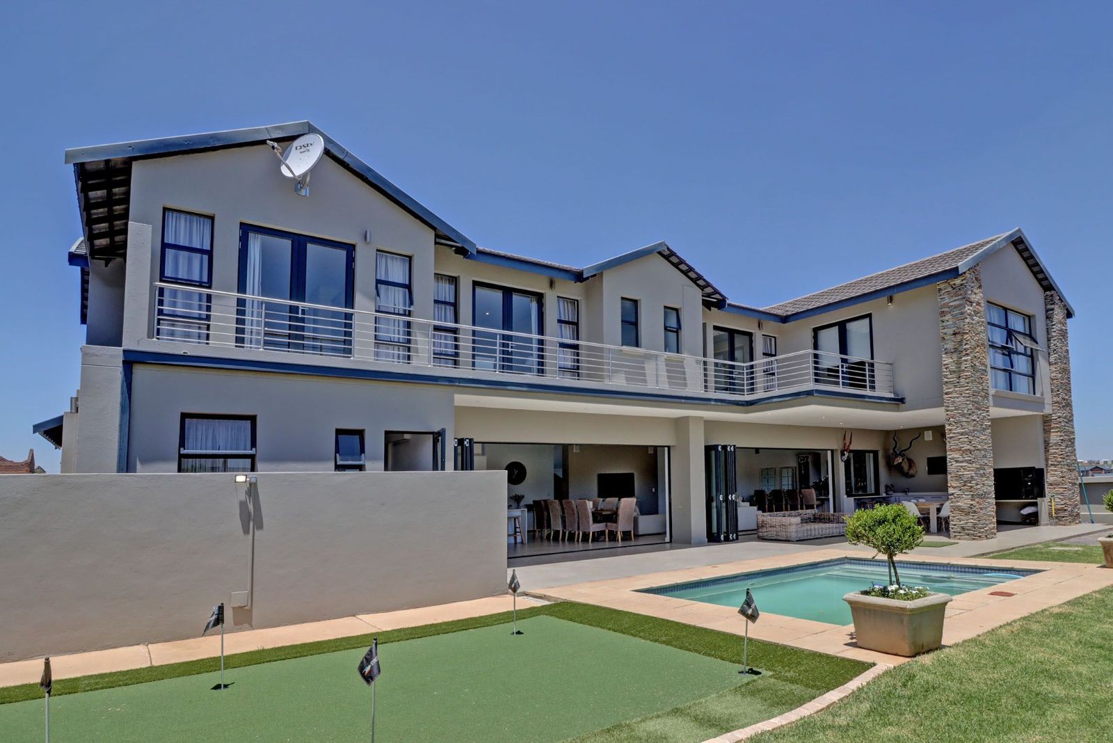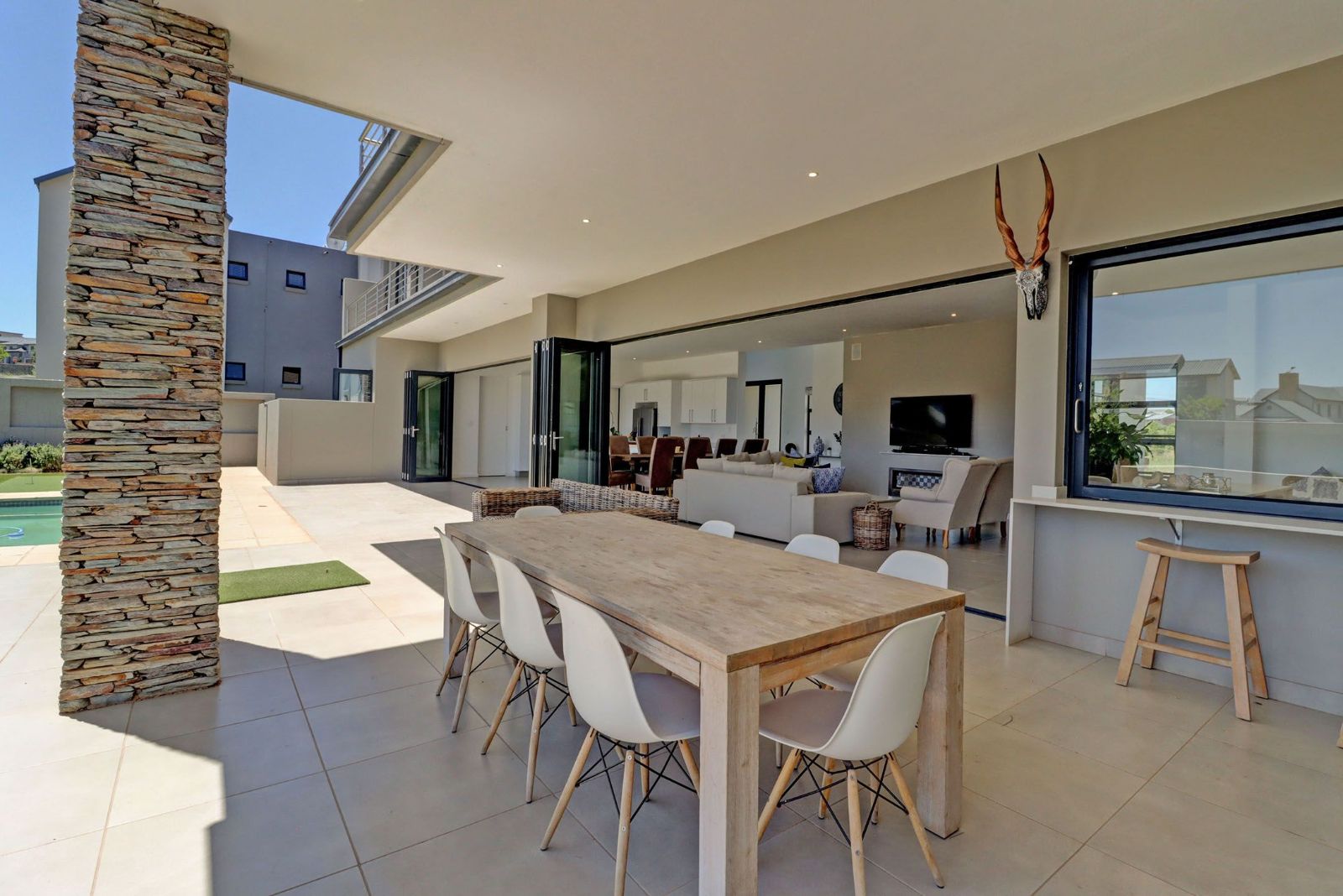 At the heart of the home lies a beautifully integrated open-plan living space. The designer kitchen, elegant dining area, expansive lounge with a feature gas fireplace form a cohesive and inviting hub. Stacking glass doors open this space entirely to a generous covered patio, thoughtfully designed for entertaining—with a built-in braai, ample prep space, storage, and distinct areas for dining and lounging. From here, the landscaped garden unfolds to reveal a boma, sparkling pool, and private putting green—perfect for relaxed family living and unforgettable gatherings.