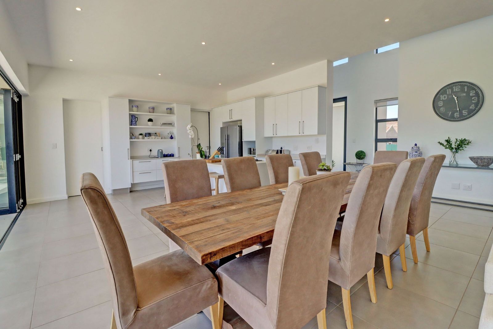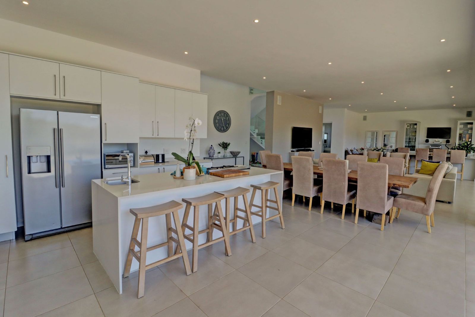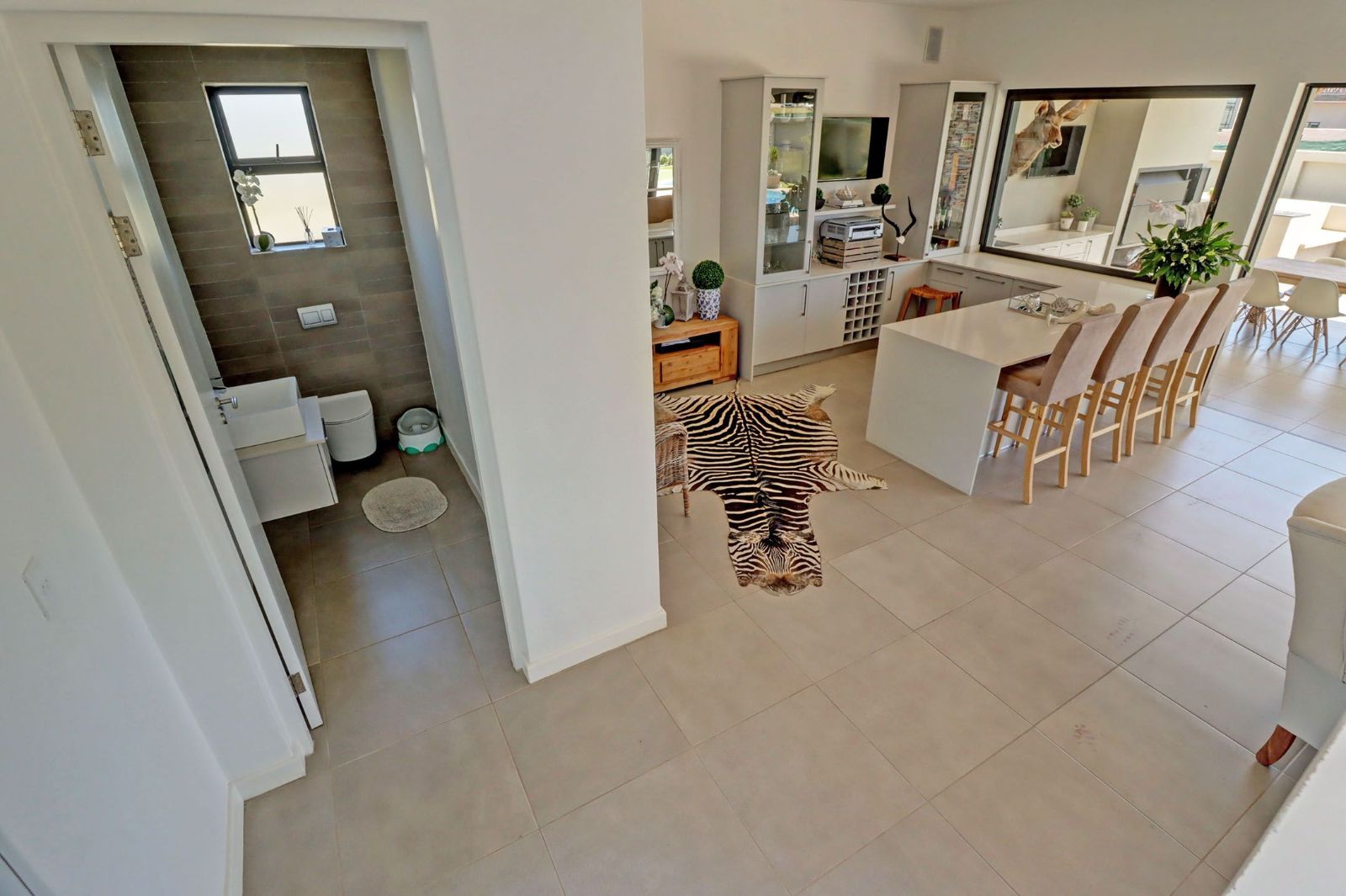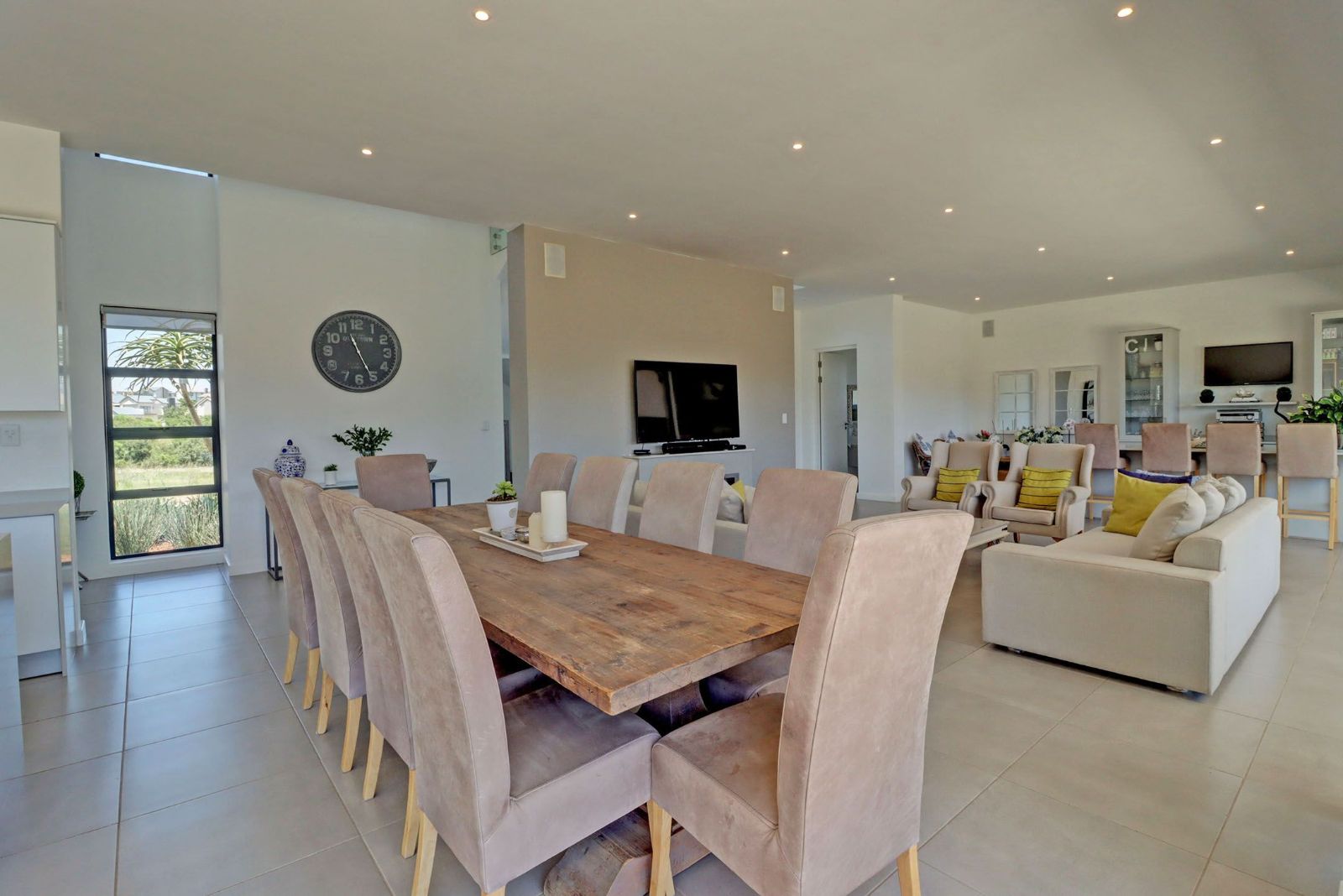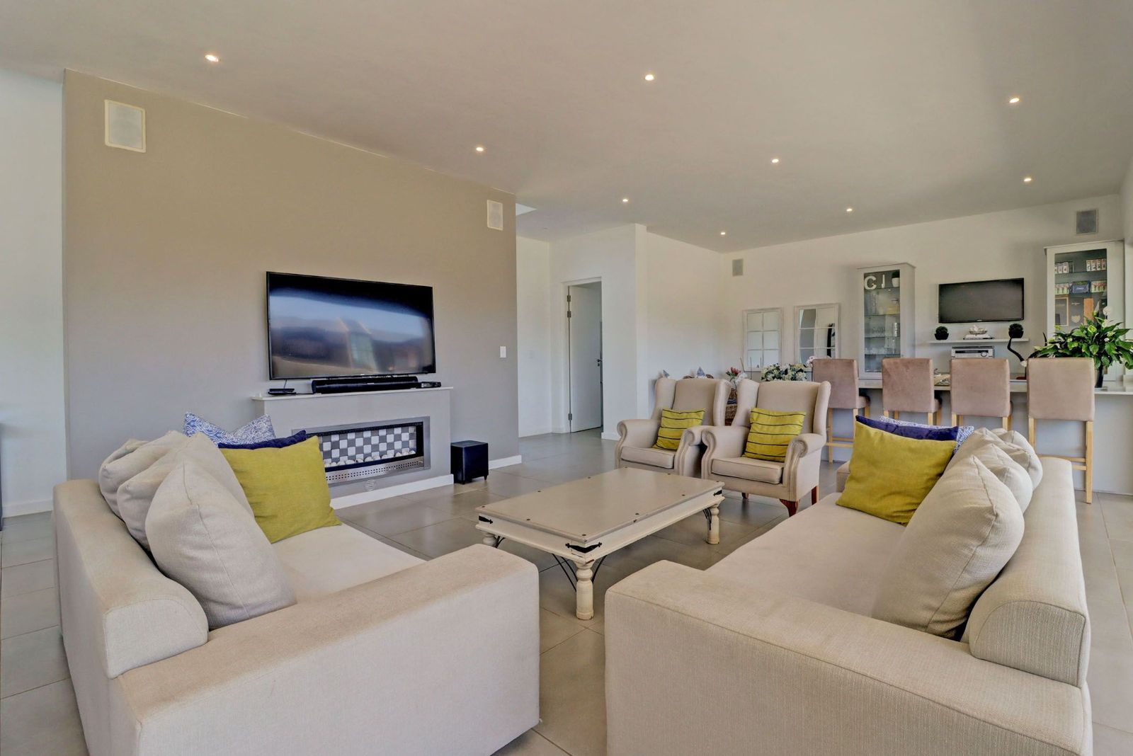 At the heart of the home lies a beautifully integrated open-plan living space. The designer kitchen, elegant dining area, expansive lounge with a feature gas fireplace form a cohesive and inviting hub. Stacking glass doors open this space entirely to a generous covered patio, thoughtfully designed for entertaining—with a built-in braai, ample prep space, storage, and distinct areas for dining and lounging. From here, the landscaped garden unfolds to reveal a boma, sparkling pool, and private putting green—perfect for relaxed family living and unforgettable gatherings.