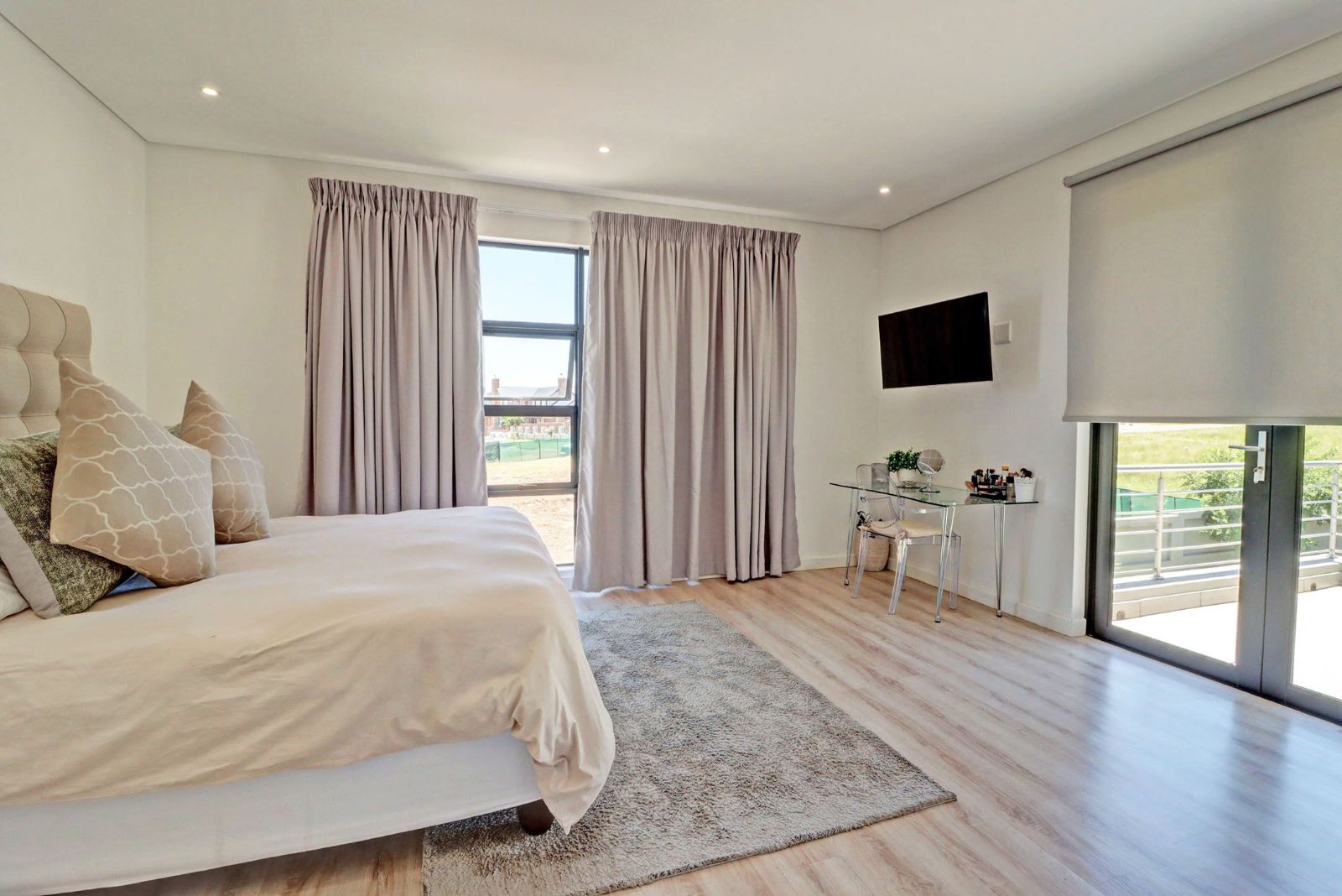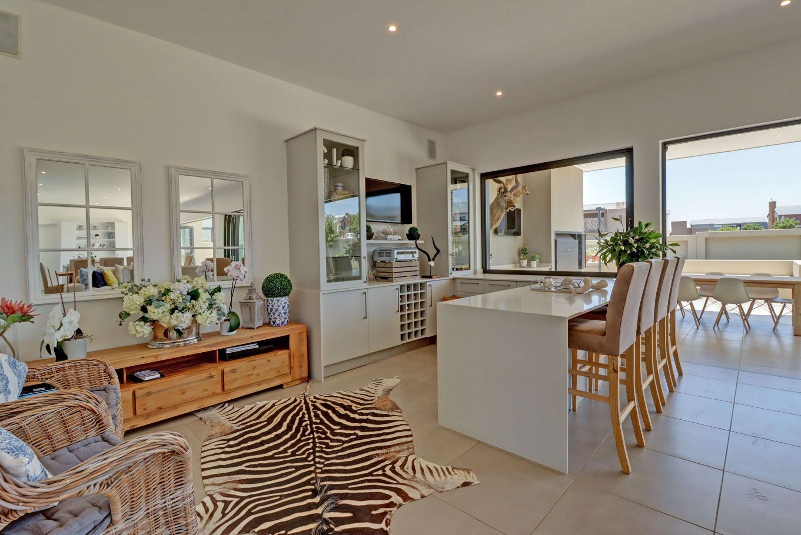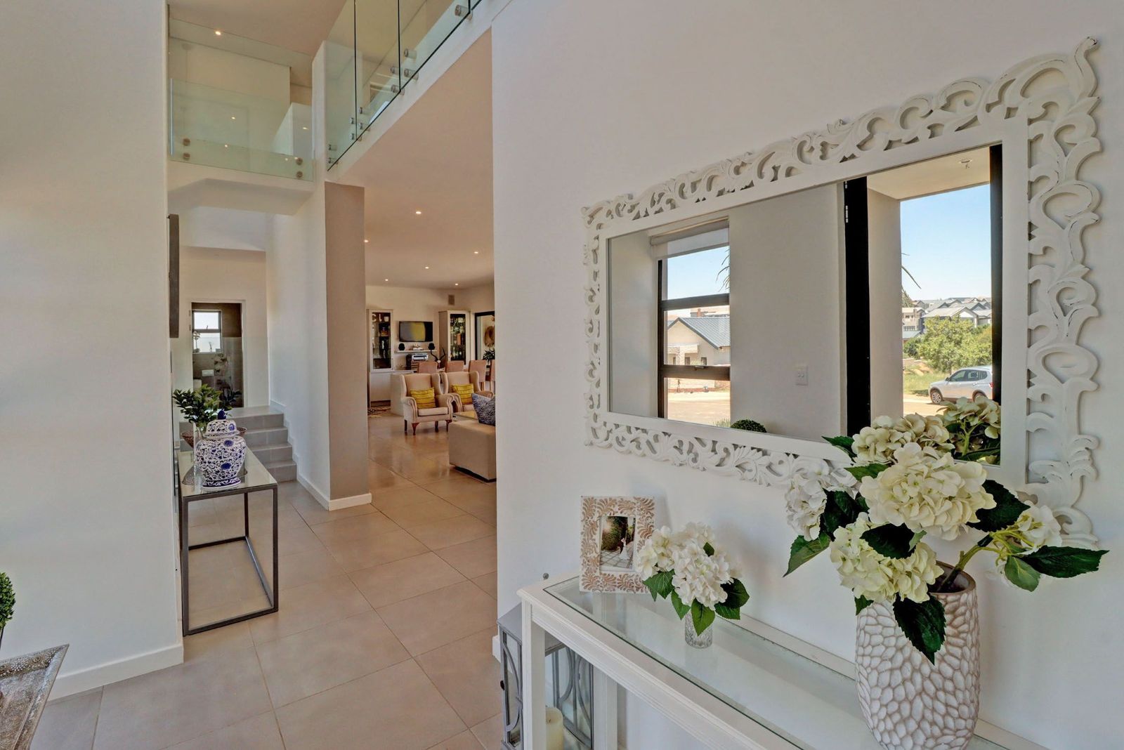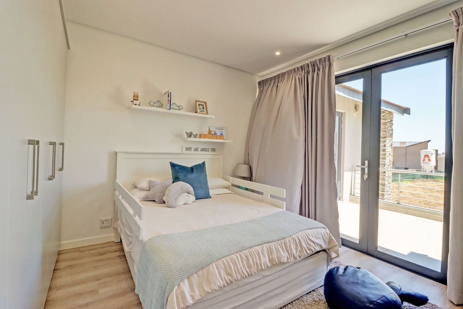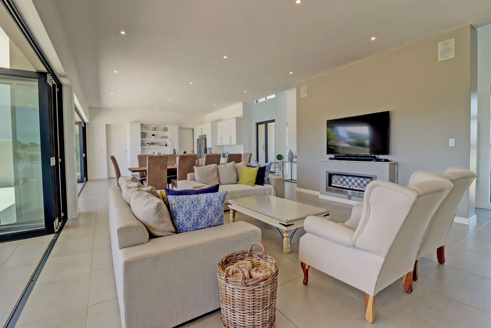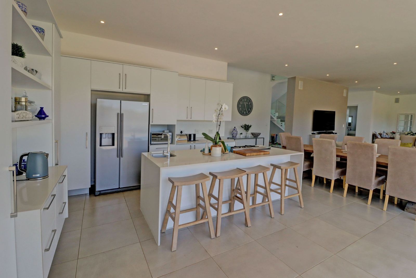 At the heart of the home lies a beautifully integrated open-plan living space. The designer kitchen, elegant dining area, expansive lounge with a feature gas fireplace form a cohesive and inviting hub. Stacking glass doors open this space entirely to a generous covered patio, thoughtfully designed for entertaining—with a built-in braai, ample prep space, storage, and distinct areas for dining and lounging. From here, the landscaped garden unfolds to reveal a boma, sparkling pool, and private putting green—perfect for relaxed family living and unforgettable gatherings.