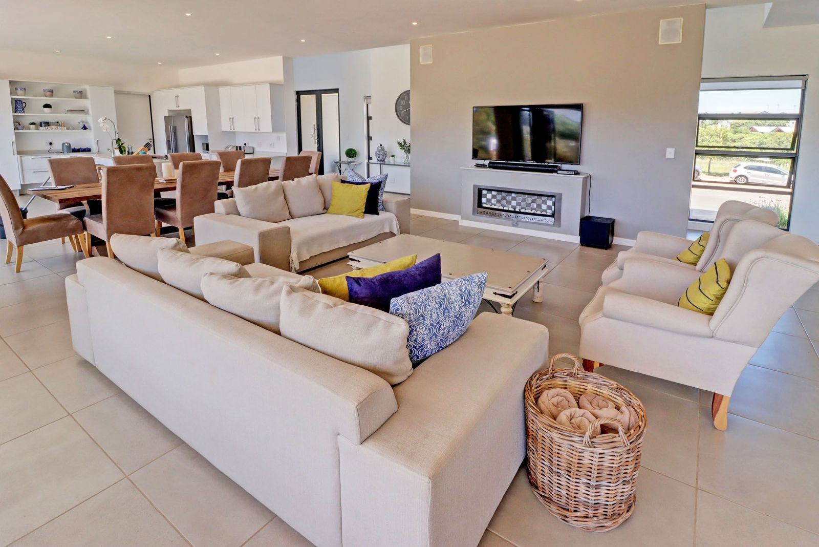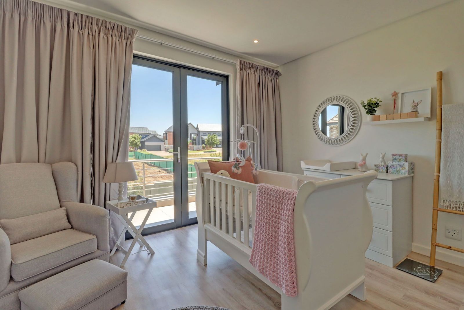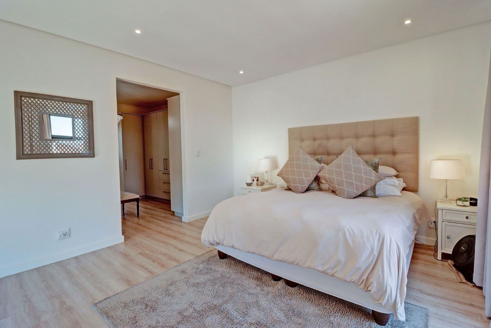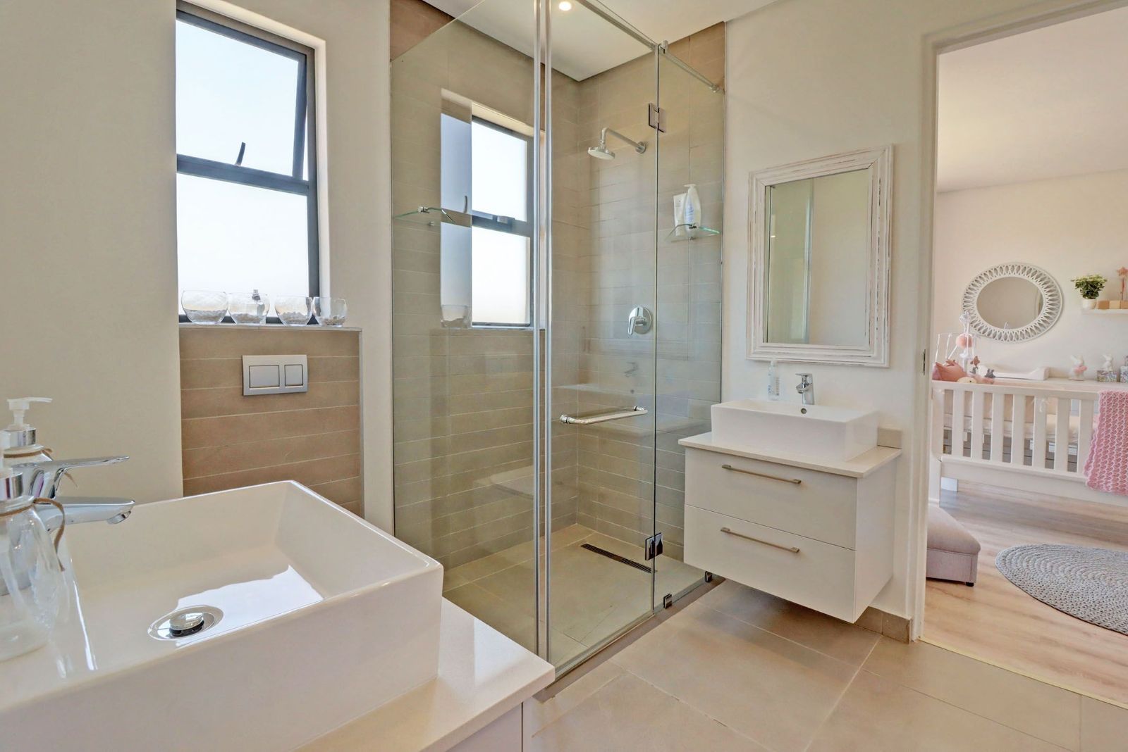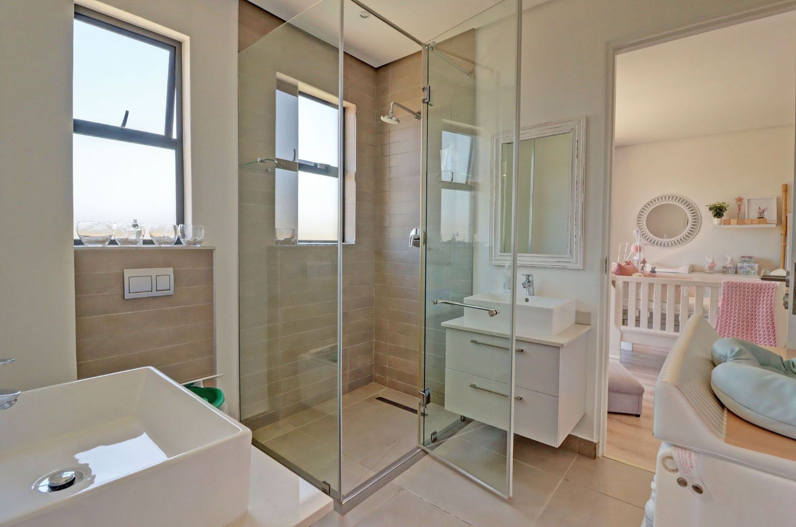 At the heart of the home lies a beautifully integrated open-plan living space. The designer kitchen, elegant dining area, expansive lounge with a feature gas fireplace form a cohesive and inviting hub. Stacking glass doors open this space entirely to a generous covered patio, thoughtfully designed for entertaining—with a built-in braai, ample prep space, storage, and distinct areas for dining and lounging. From here, the landscaped garden unfolds to reveal a boma, sparkling pool, and private putting green—perfect for relaxed family living and unforgettable gatherings.