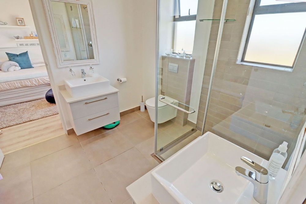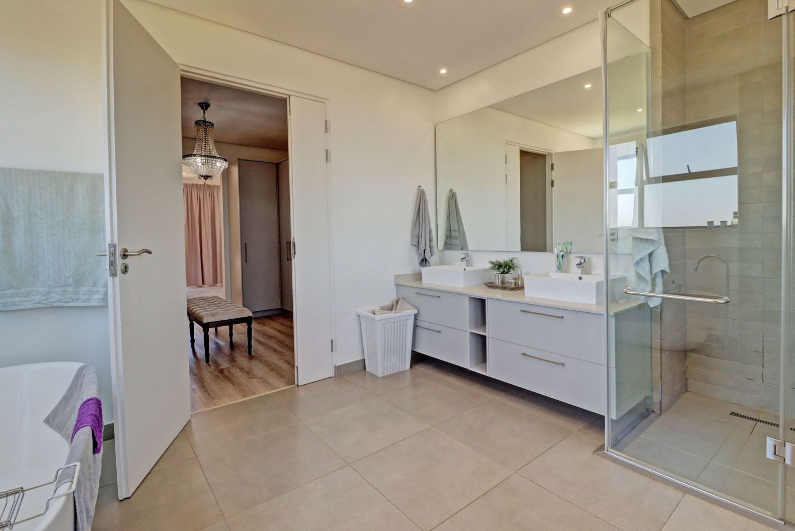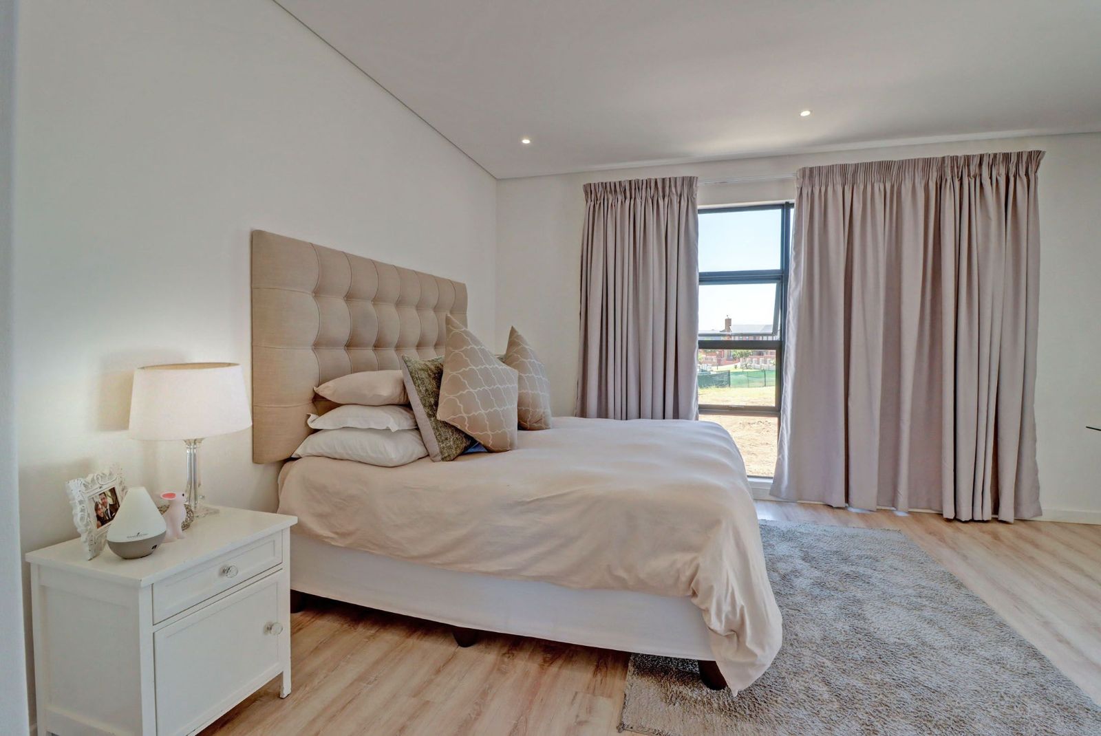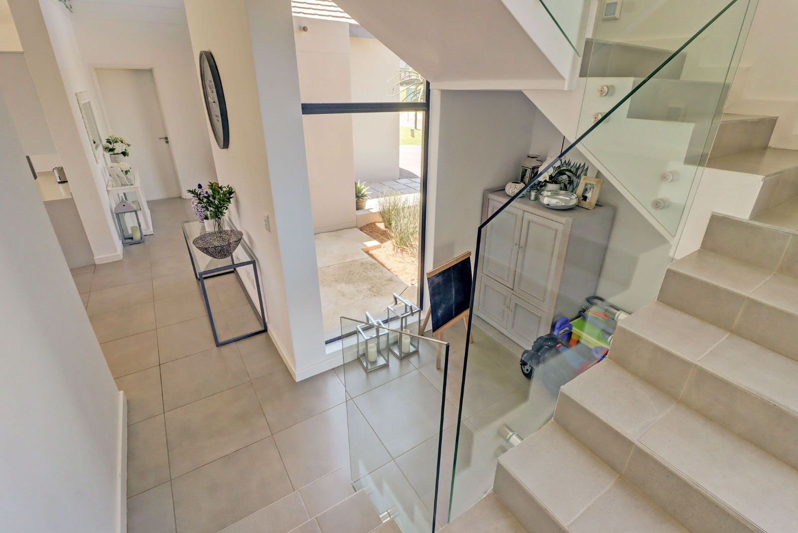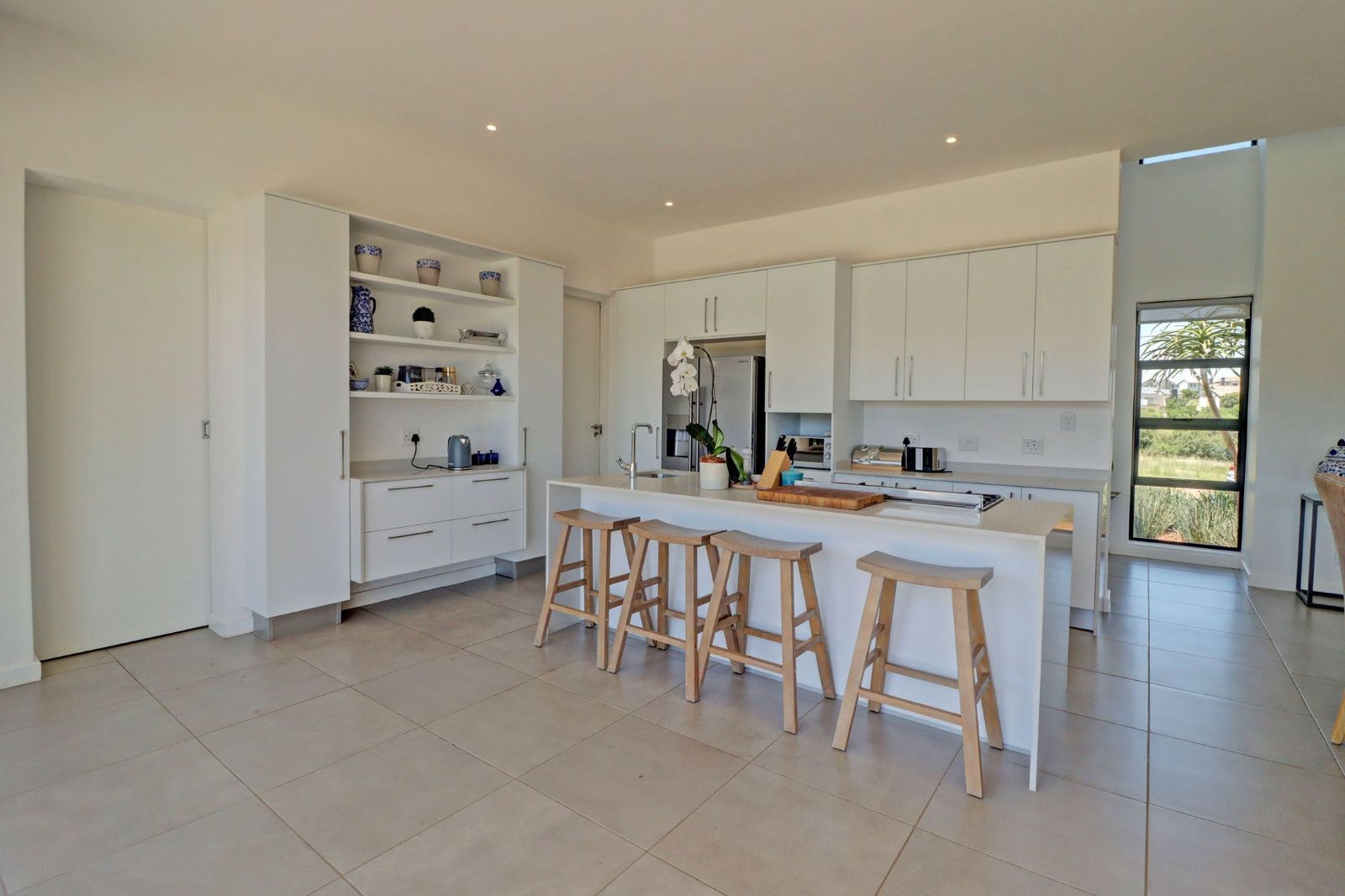 At the heart of the home lies a beautifully integrated open-plan living space. The designer kitchen, elegant dining area, expansive lounge with a feature gas fireplace form a cohesive and inviting hub. Stacking glass doors open this space entirely to a generous covered patio, thoughtfully designed for entertaining—with a built-in braai, ample prep space, storage, and distinct areas for dining and lounging. From here, the landscaped garden unfolds to reveal a boma, sparkling pool, and private putting green—perfect for relaxed family living and unforgettable gatherings.
