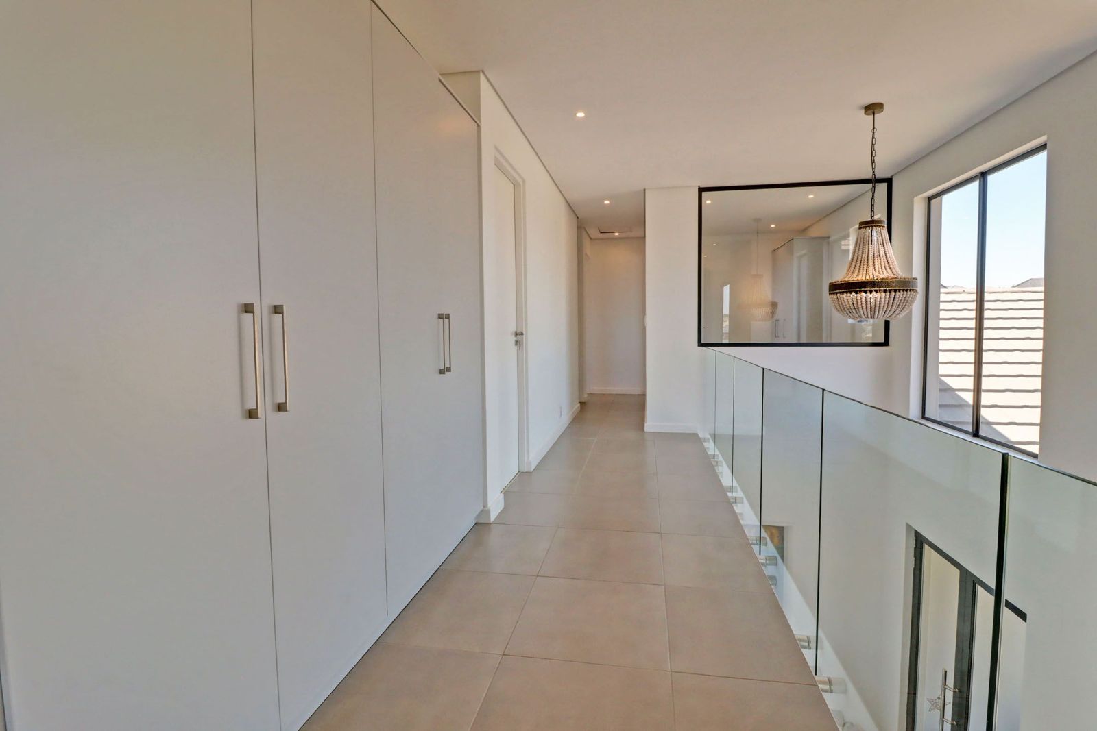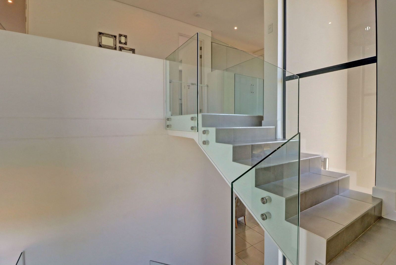A bespoke staircase with glass balustrades leads to the upper level, where a sunlit landing connects four spacious bedrooms. The home’s architecture allows natural light to pour through the upper level, creating a bright and inviting ambiance.