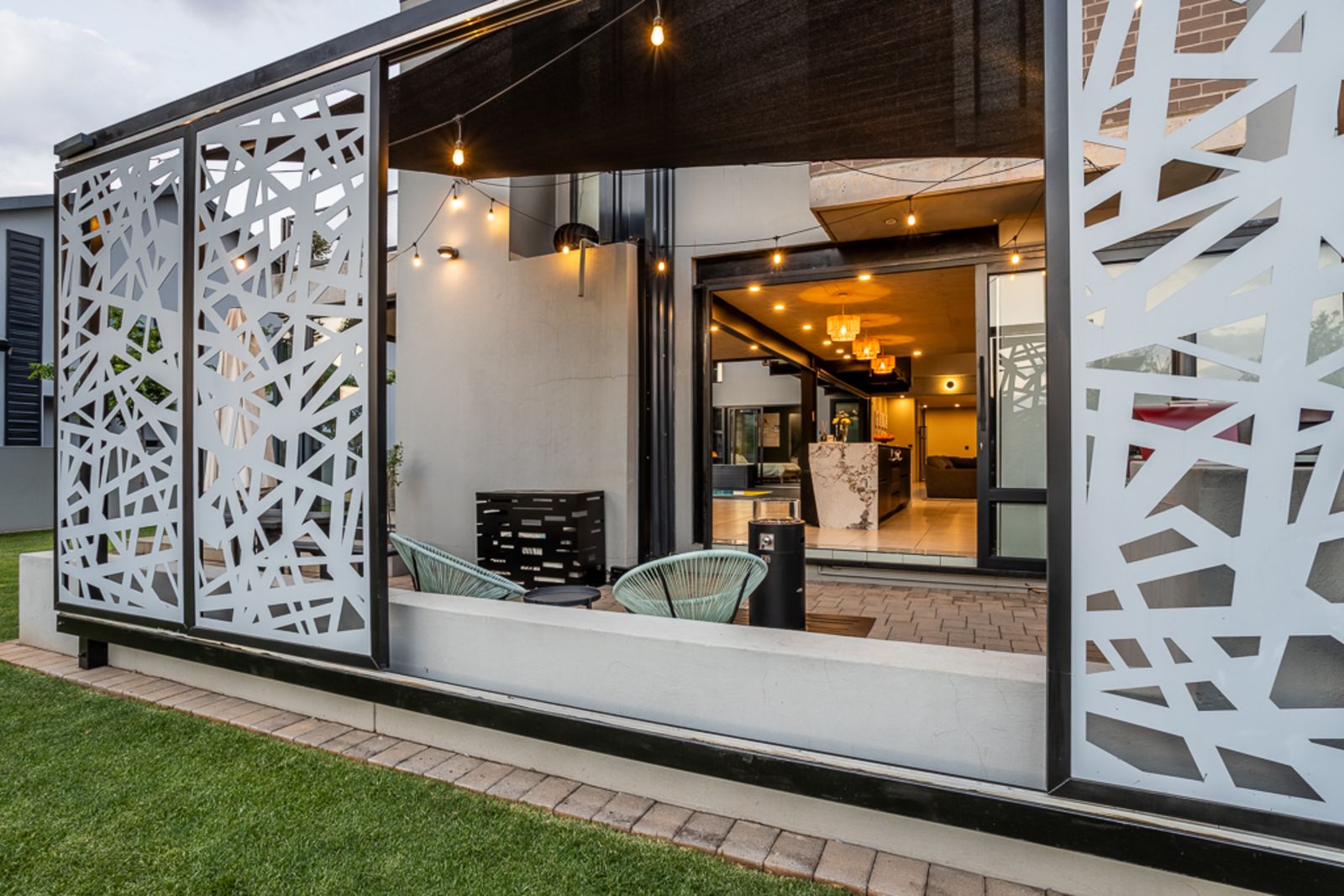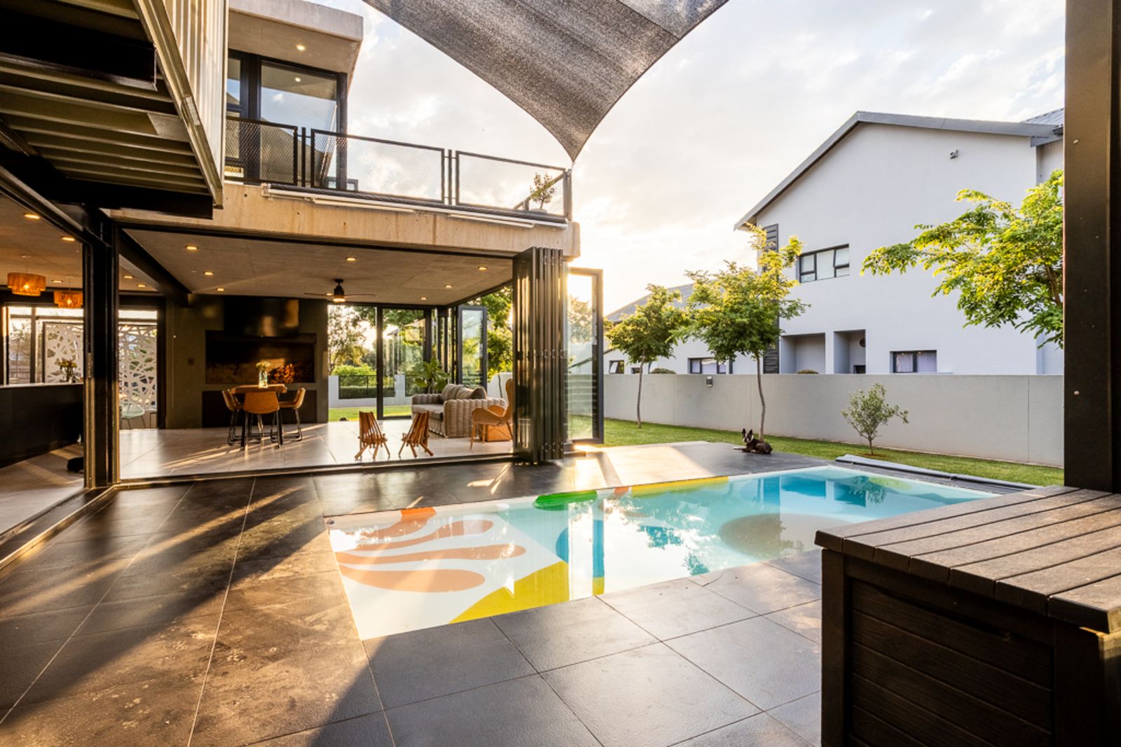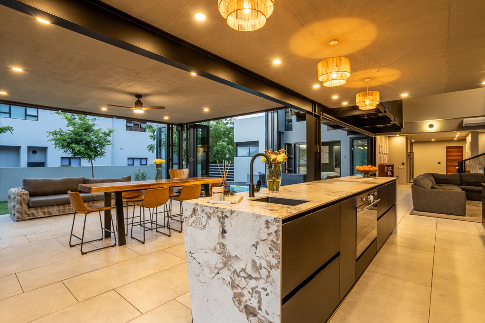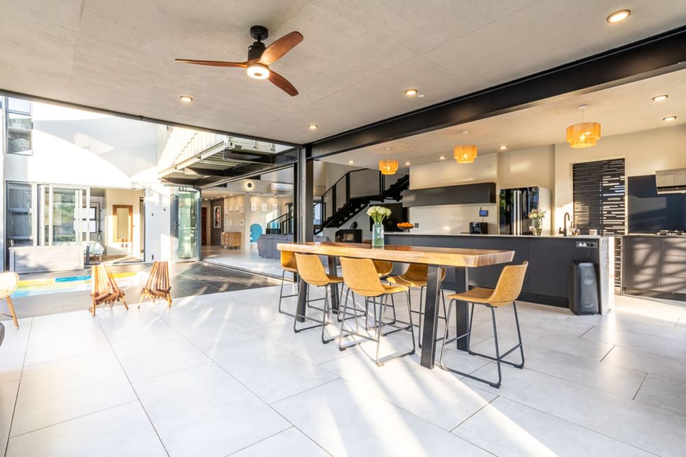 Step inside and be welcomed by light-filled open-plan living areas that blend modern elegance with functional design. The living, dining, and kitchen spaces flow effortlessly to a spacious covered patio with a built-in braai, overlooking a heated swimming pool (with solar panels and a heat pump), a boma, and a private putting green — all framed by the natural beauty of the surrounding greenbelt.