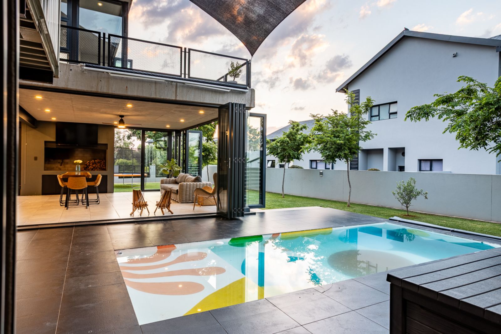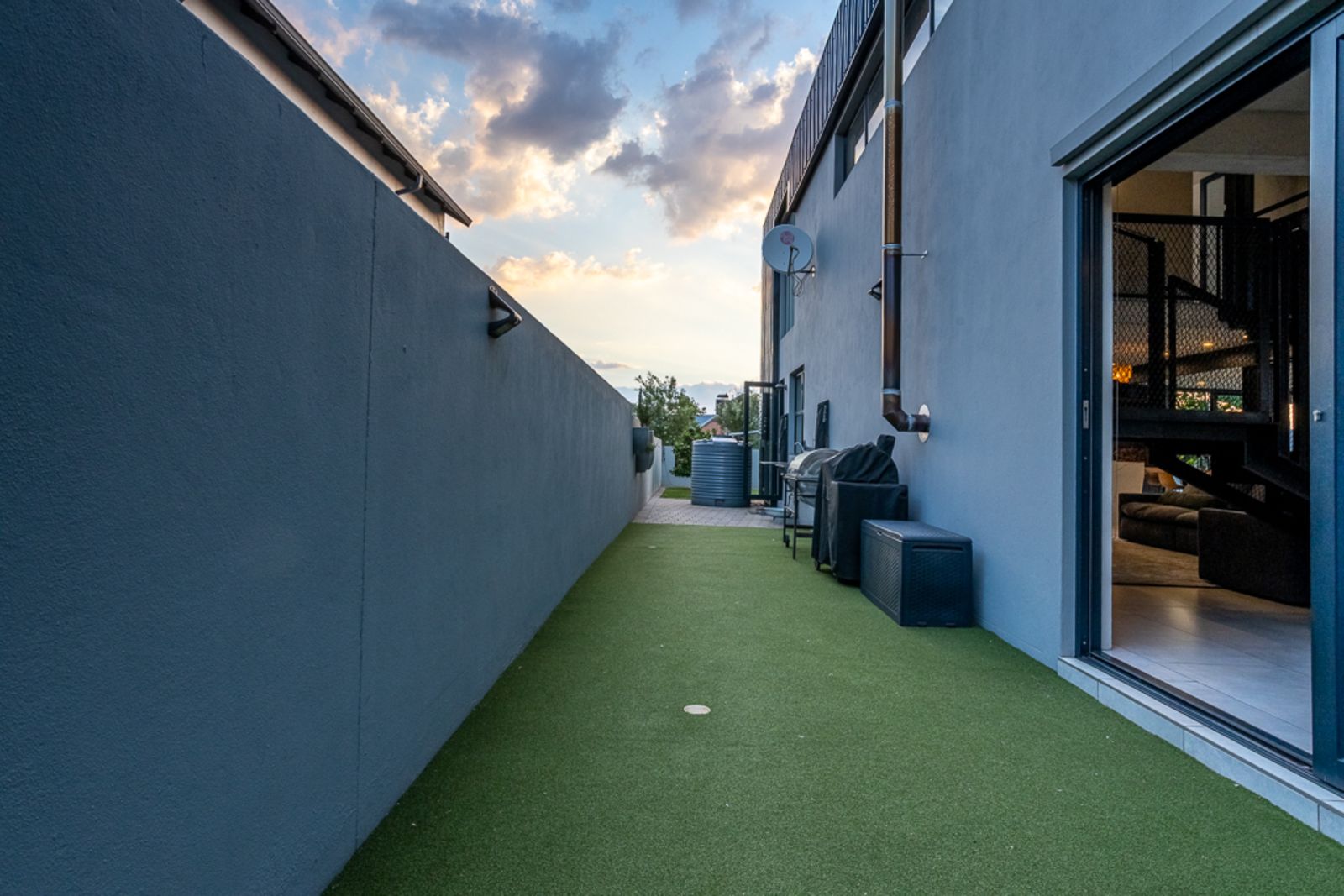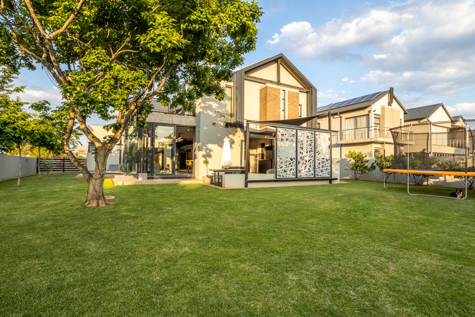 Step inside and be welcomed by light-filled open-plan living areas that blend modern elegance with functional design. The living, dining, and kitchen spaces flow effortlessly to a spacious covered patio with a built-in braai, overlooking a heated swimming pool (with solar panels and a heat pump), a boma, and a private putting green — all framed by the natural beauty of the surrounding greenbelt.