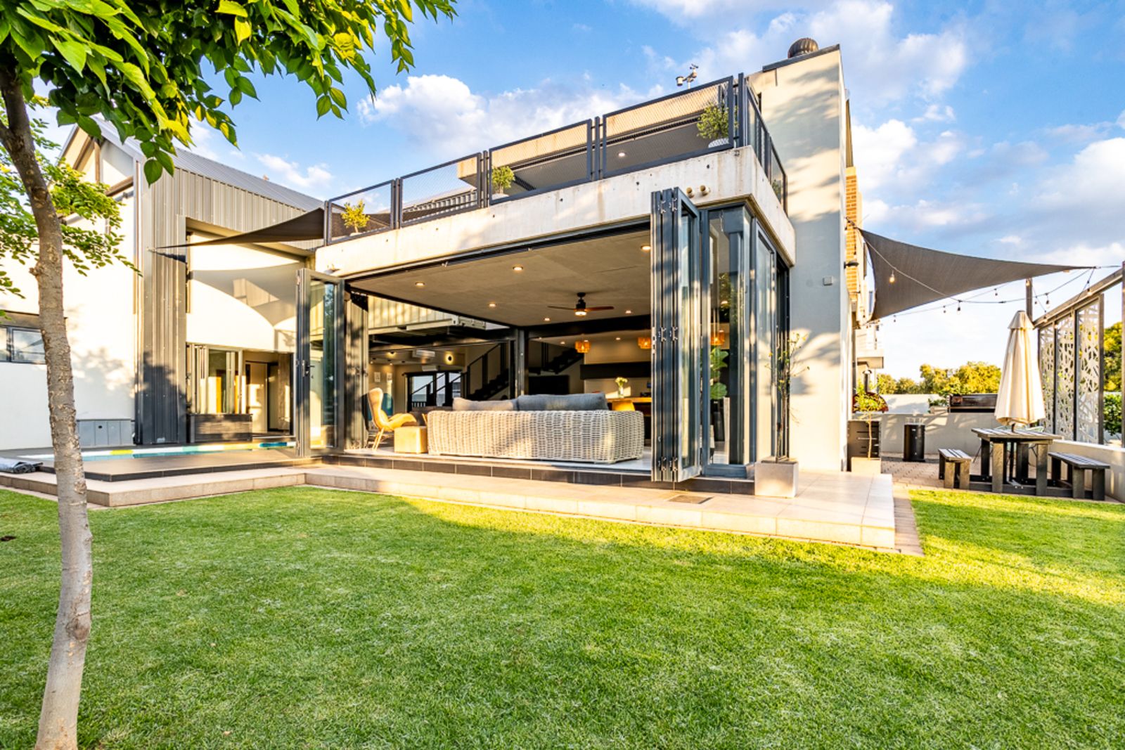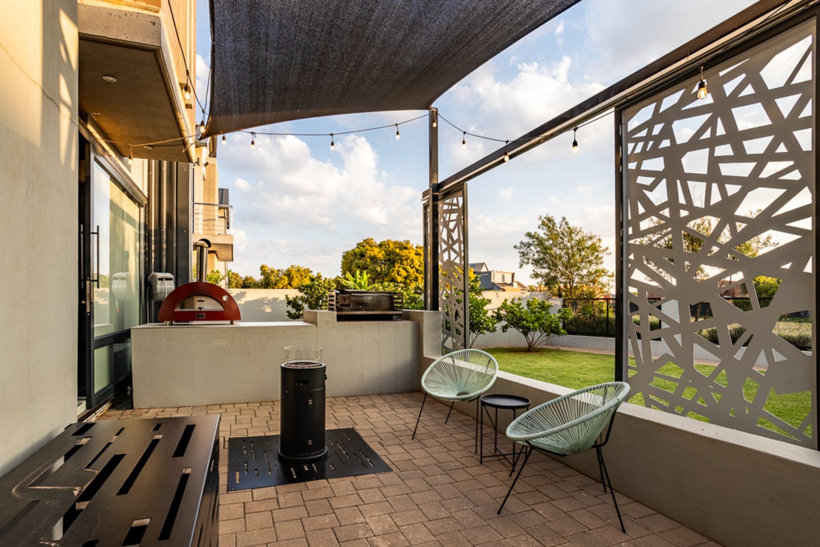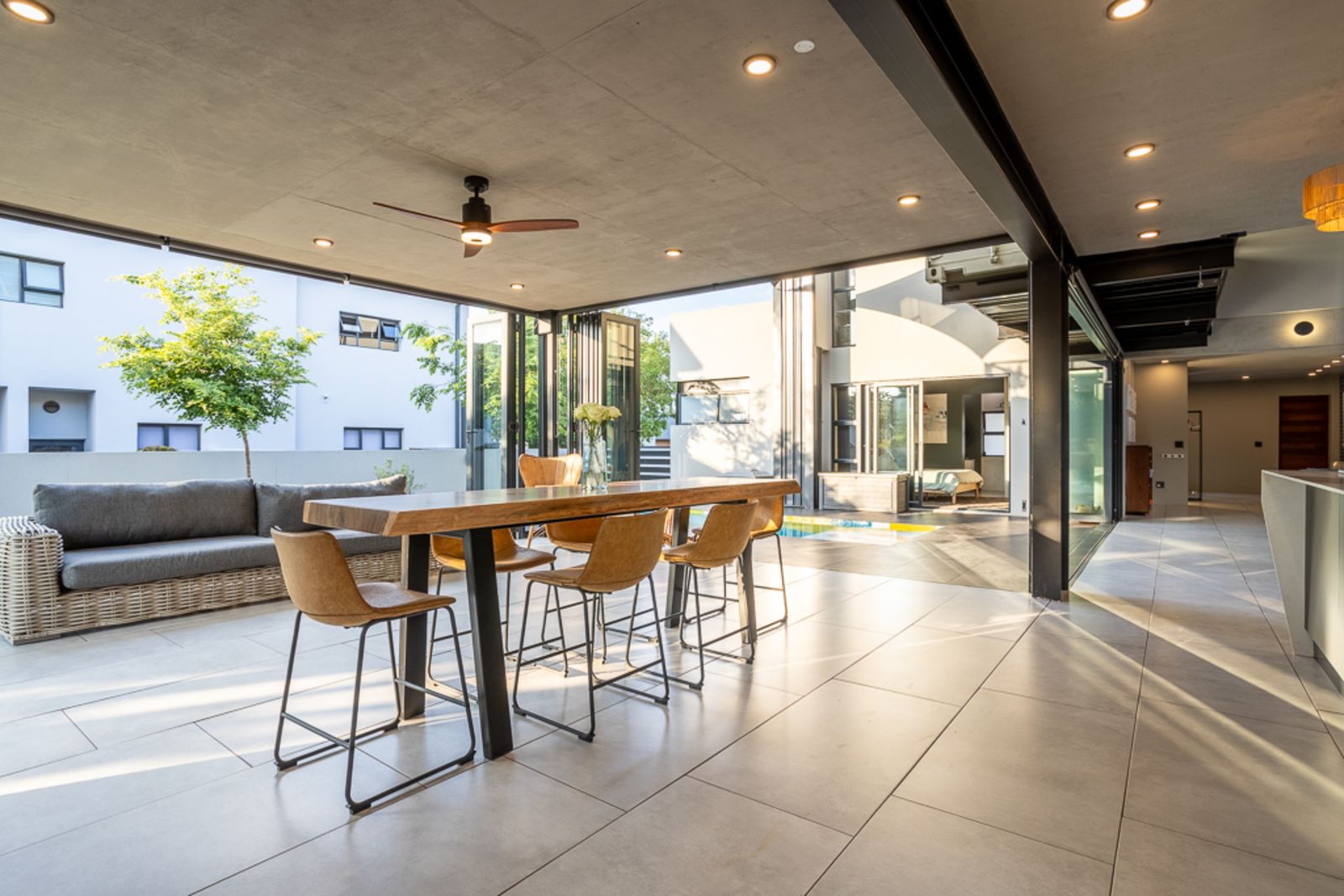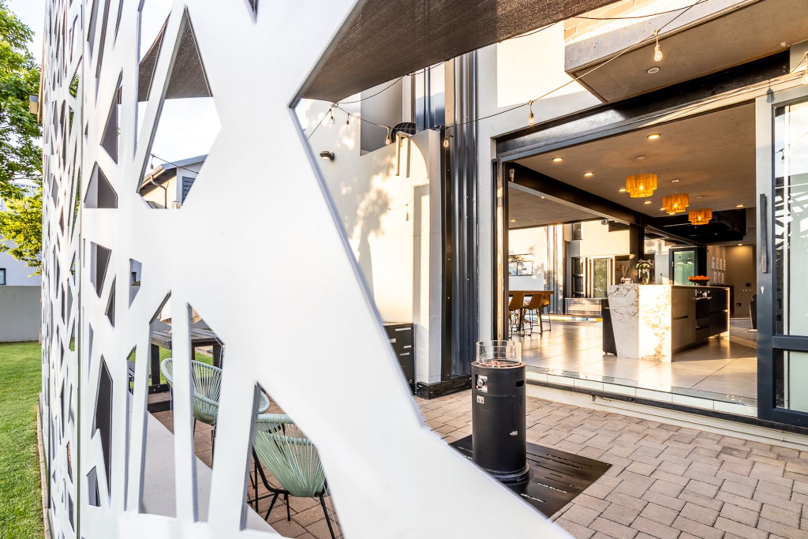 Step inside and be welcomed by light-filled open-plan living areas that blend modern elegance with functional design. The living, dining, and kitchen spaces flow effortlessly to a spacious covered patio with a built-in braai, overlooking a heated swimming pool (with solar panels and a heat pump), a boma, and a private putting green — all framed by the natural beauty of the surrounding greenbelt.
