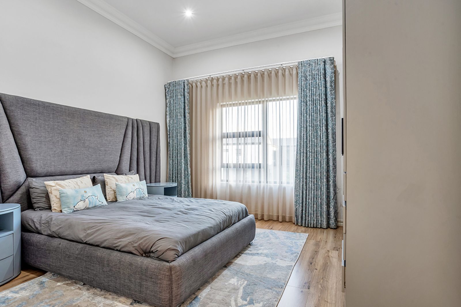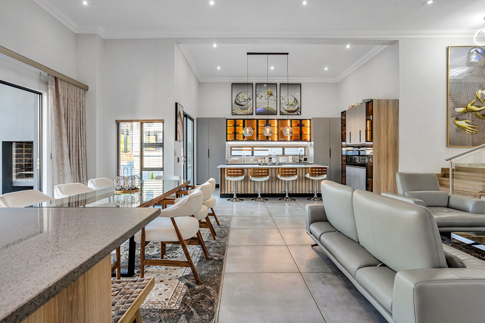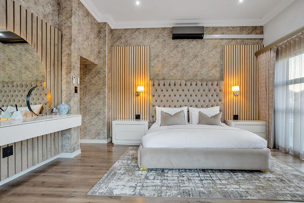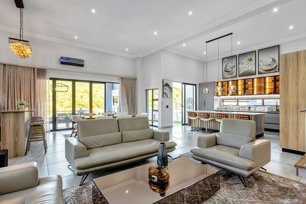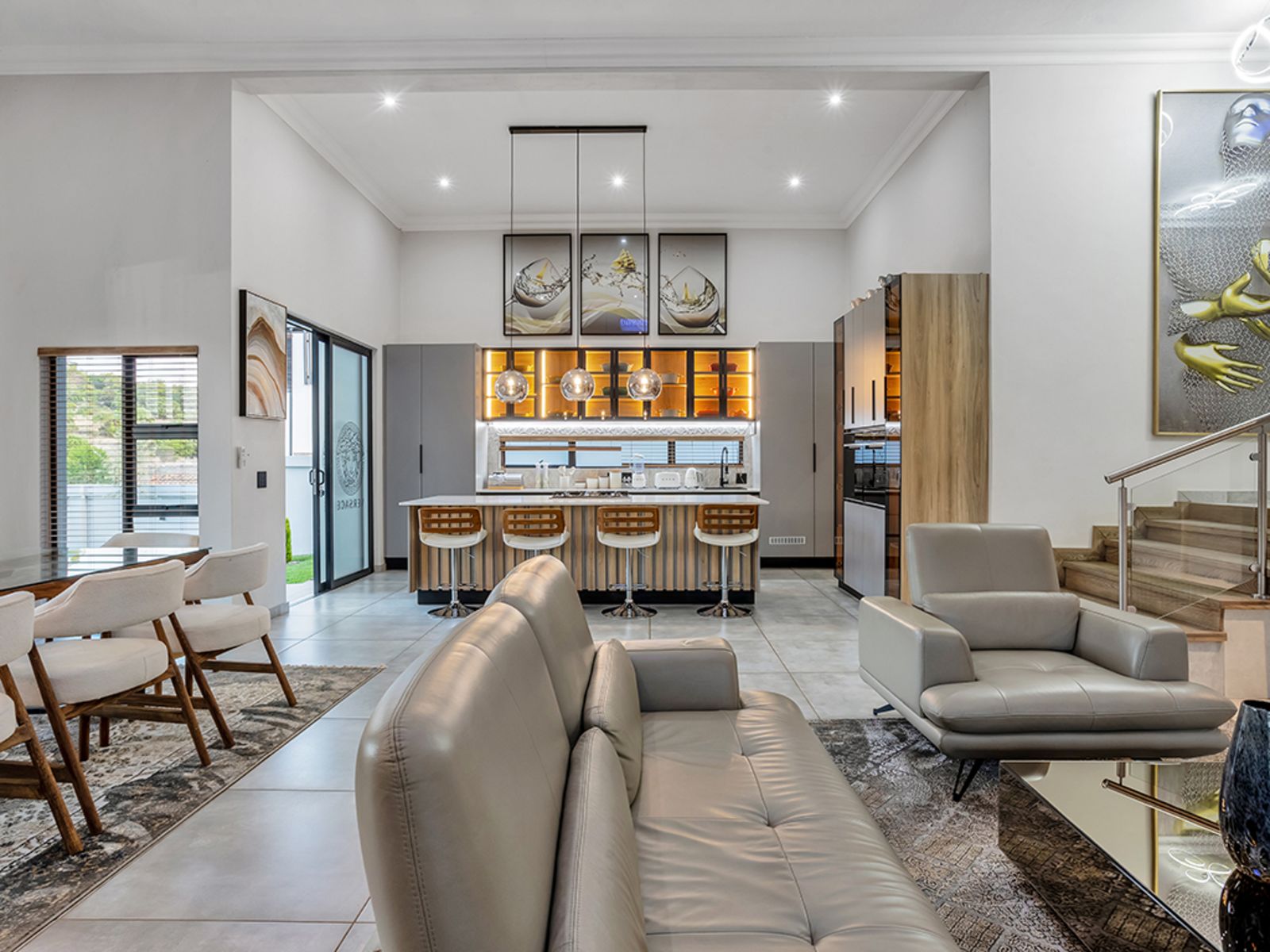 Step through the grand entrance hall, complete with a stylish waiting area, and be welcomed into a home where every detail reflects quality and contemporary design. The modern open-plan kitchen is a chef’s delight, featuring high-end finishes, an integrated fridge, a walk-in pantry, and a convenient scullery. The kitchen flows effortlessly into the dining and family/TV rooms, both fitted with air conditioning for year-round comfort.