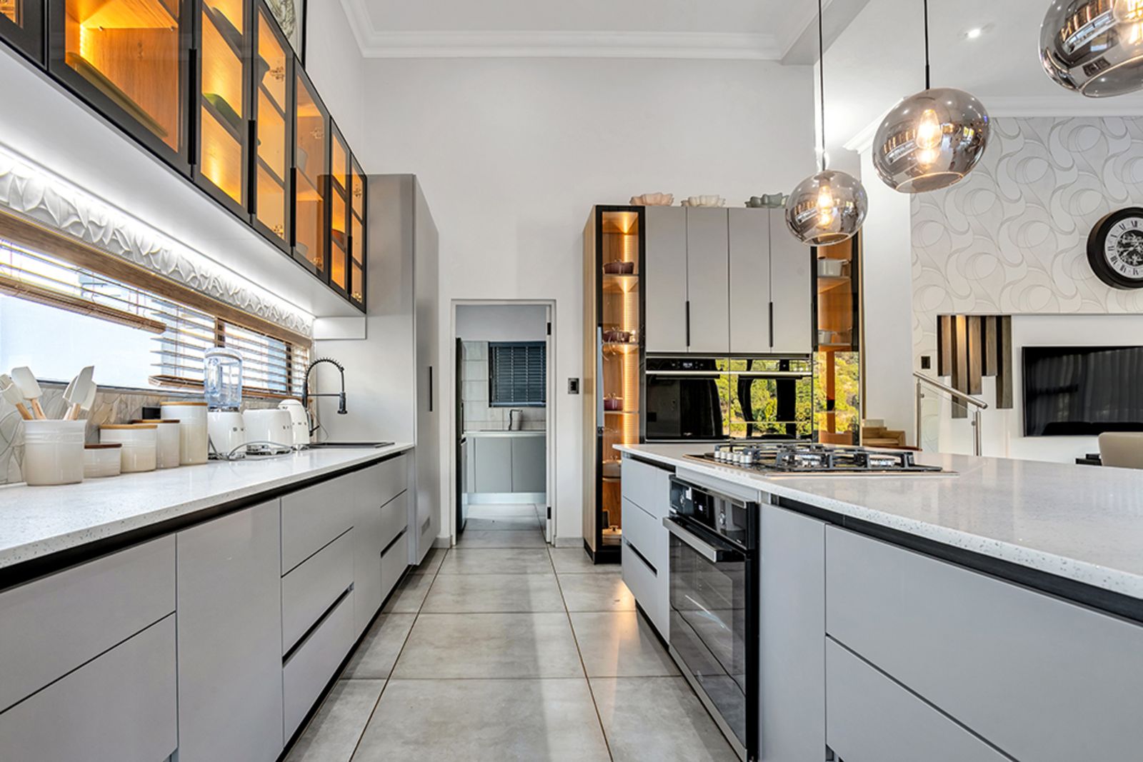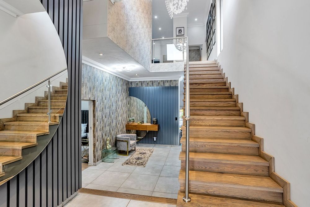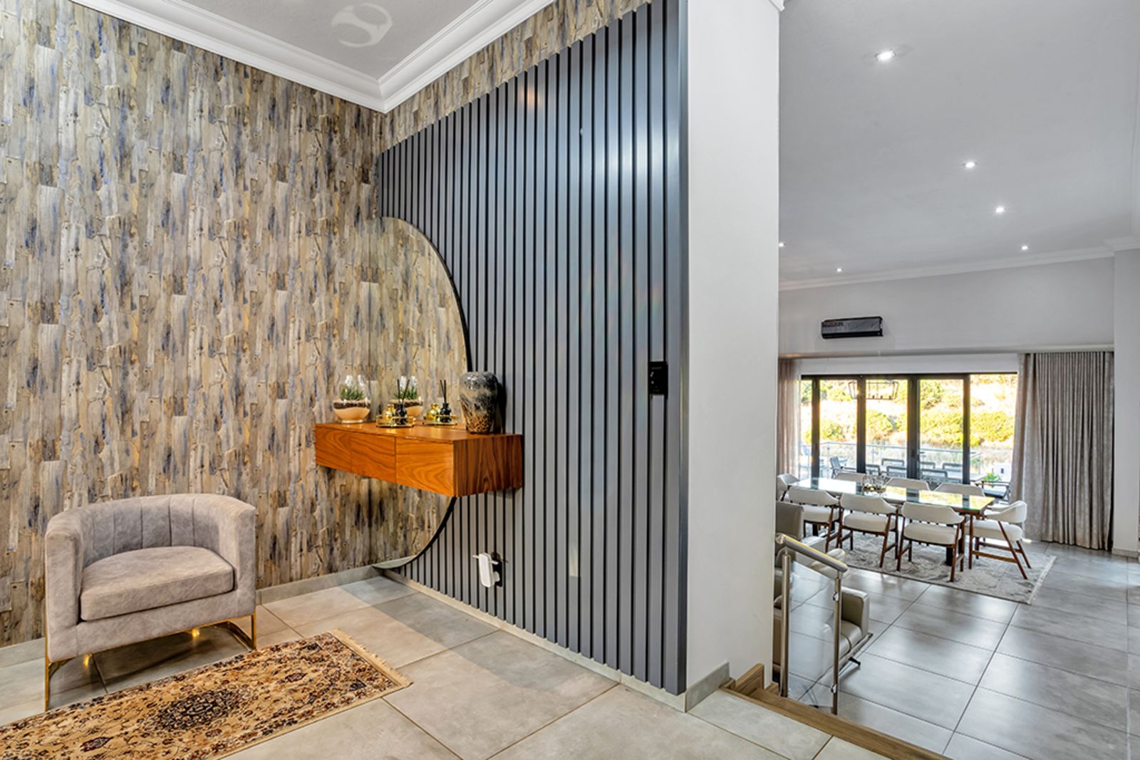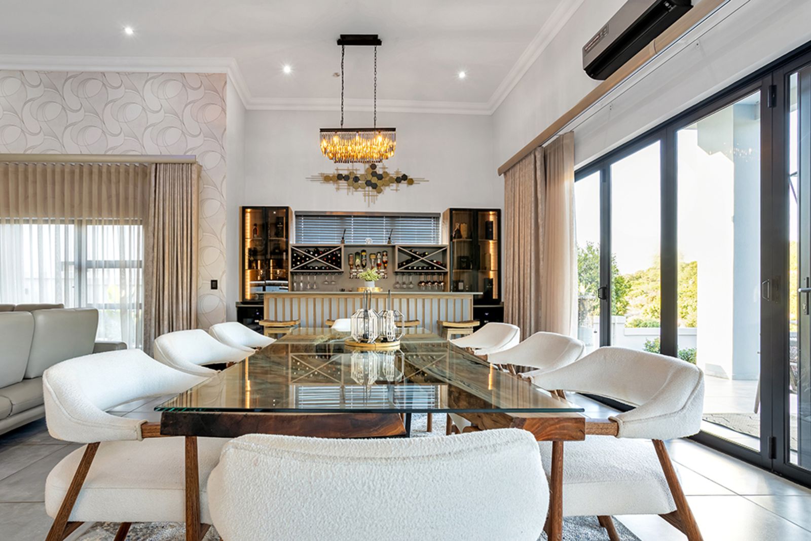 Step through the grand entrance hall, complete with a stylish waiting area, and be welcomed into a home where every detail reflects quality and contemporary design. The modern open-plan kitchen is a chef’s delight, featuring high-end finishes, an integrated fridge, a walk-in pantry, and a convenient scullery. The kitchen flows effortlessly into the dining and family/TV rooms, both fitted with air conditioning for year-round comfort.