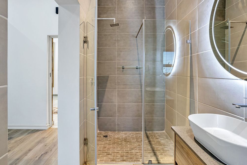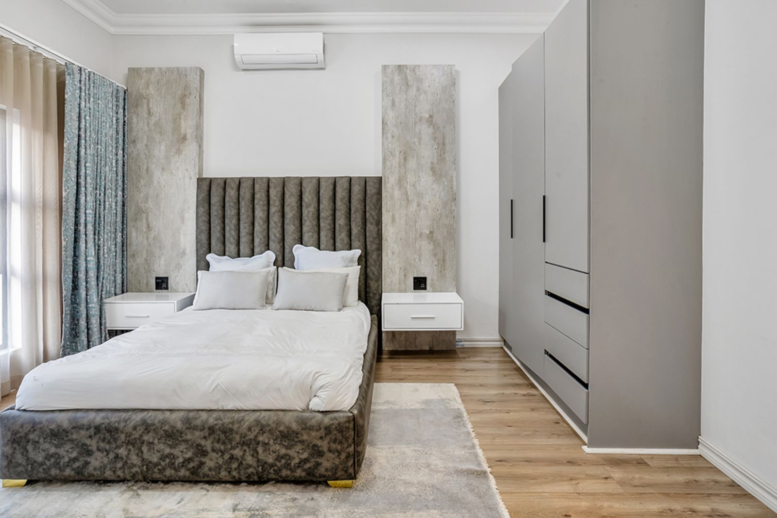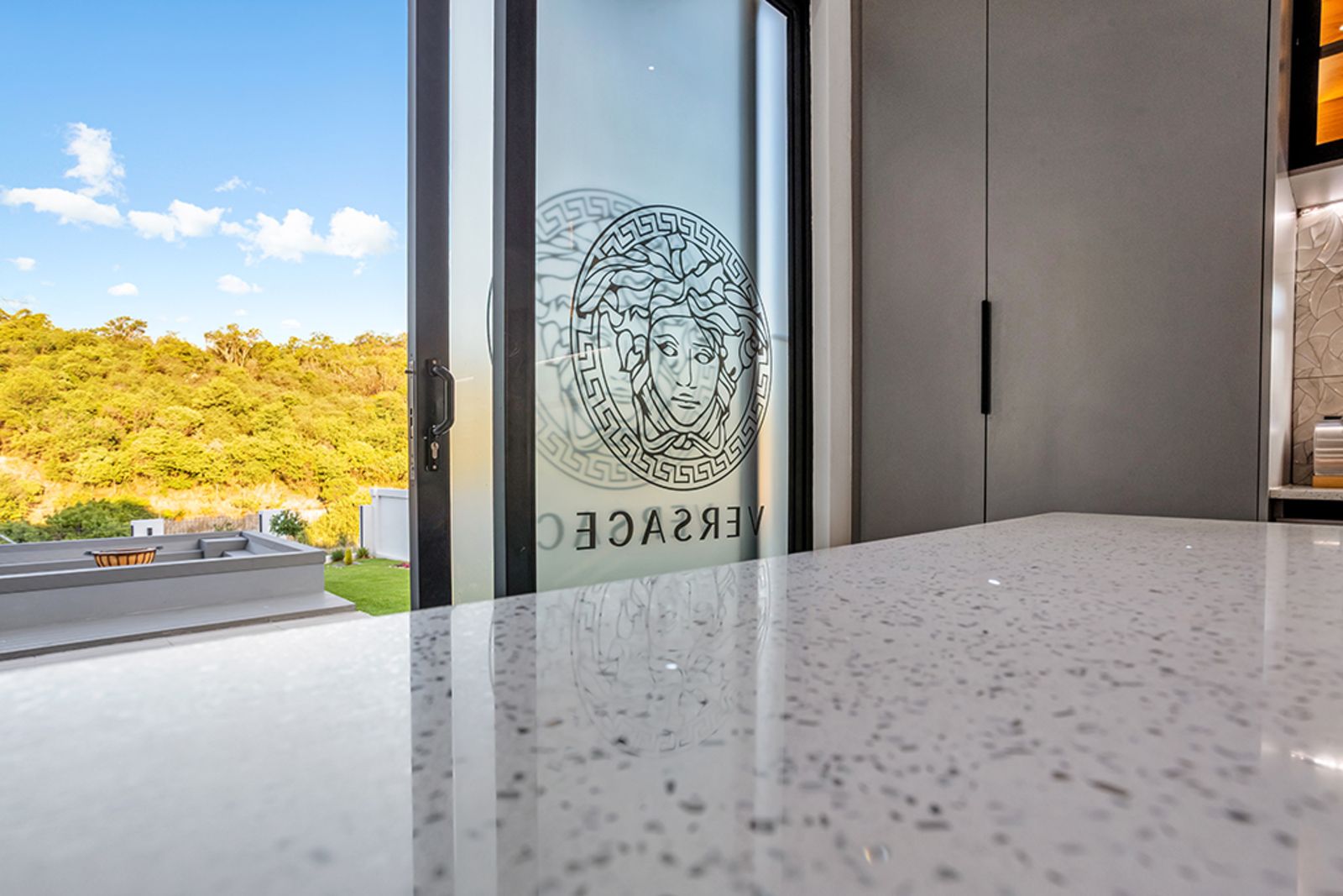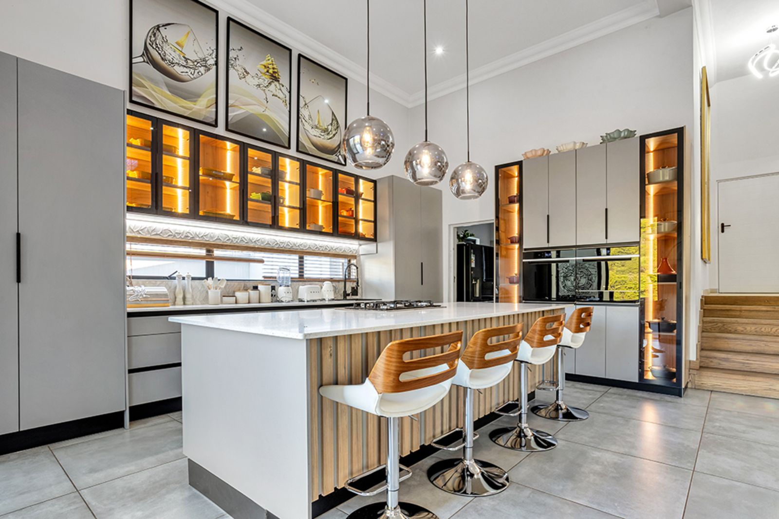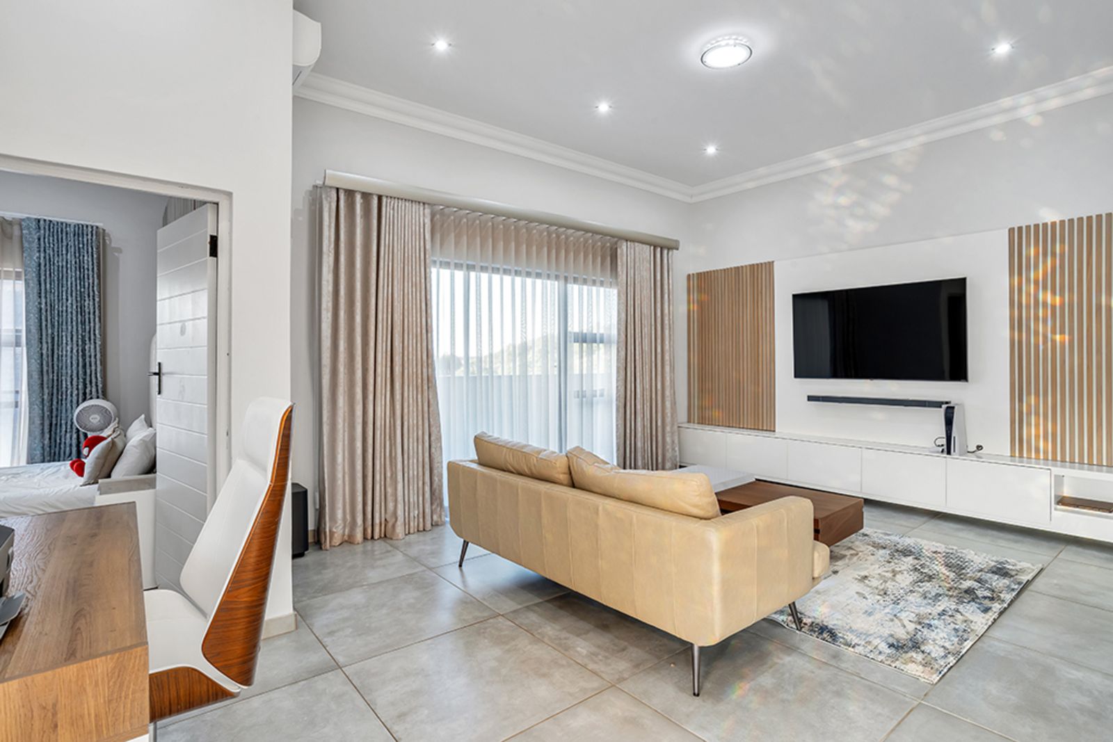 Step through the grand entrance hall, complete with a stylish waiting area, and be welcomed into a home where every detail reflects quality and contemporary design. The modern open-plan kitchen is a chef’s delight, featuring high-end finishes, an integrated fridge, a walk-in pantry, and a convenient scullery. The kitchen flows effortlessly into the dining and family/TV rooms, both fitted with air conditioning for year-round comfort.
