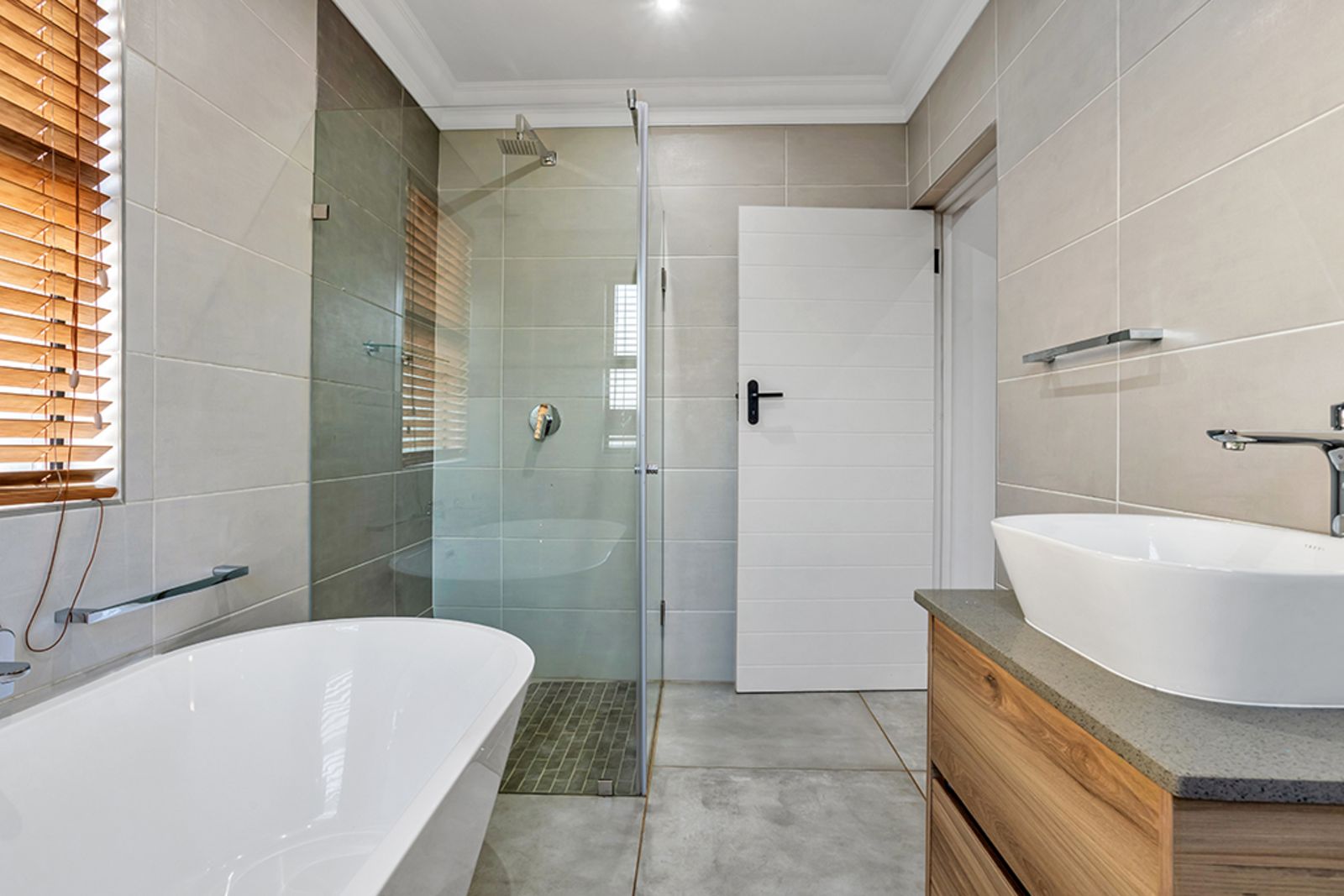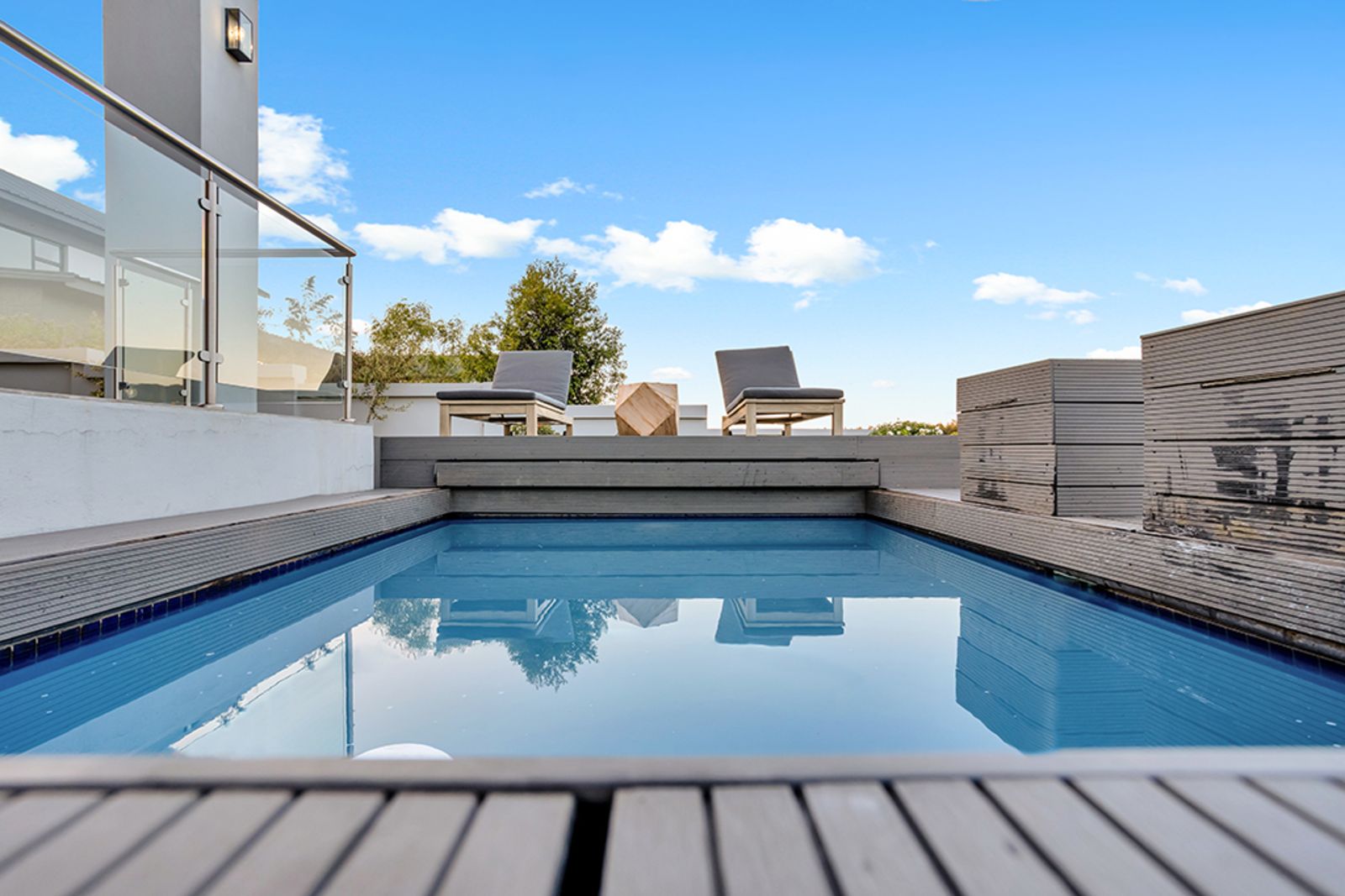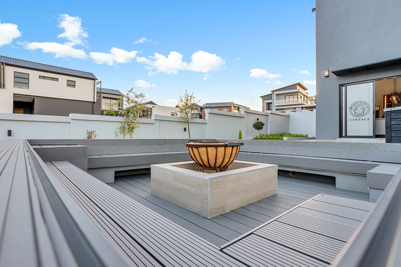 The heart of the home opens onto a sun-drenched outdoor entertainment area that captures the essence of refined living. Overlooking the lush greenbelt, the sparkling swimming pool features an innovative decking system that can be seamlessly pushed over the pool, transforming the space into an extended entertainment area or safely enclosing the pool when not in use. The built-in braai and cosy boma, both positioned to take full advantage of the greenbelt views, create the perfect setting for relaxed gatherings and sunset entertaining.