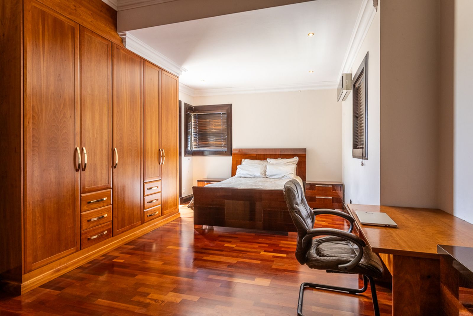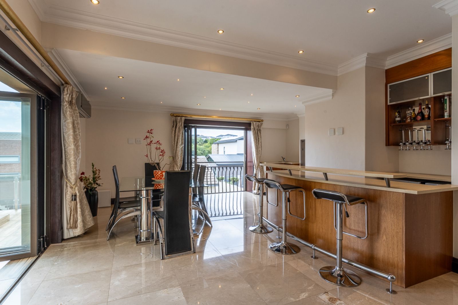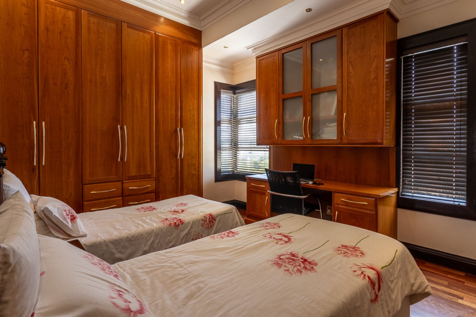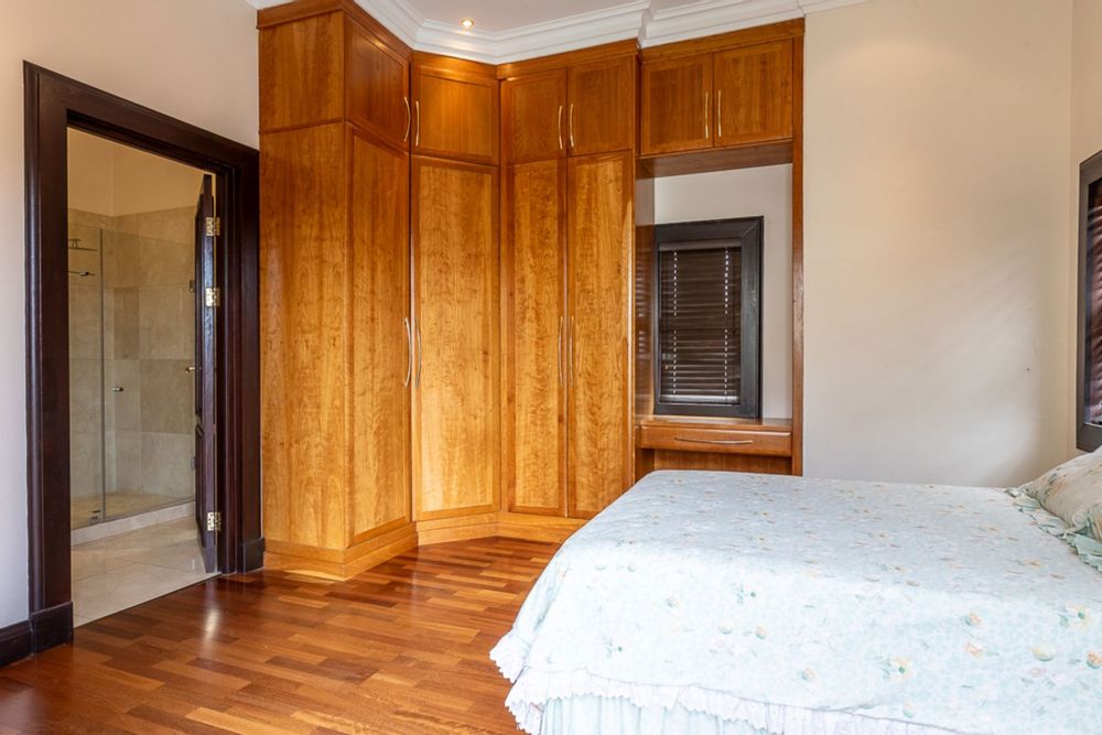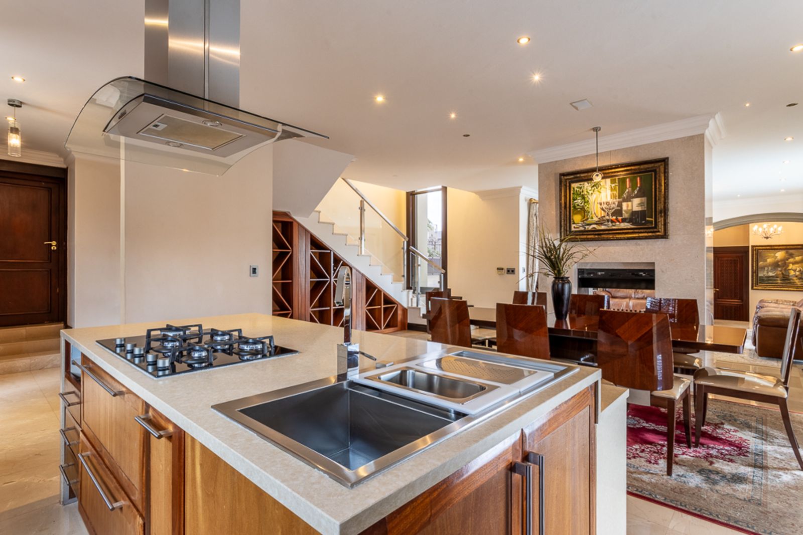 The ground floor offers a seamless flow for everyday living and effortless entertaining. You’re welcomed by an elegant entrance hall leading into generous living areas, two dining spaces, and a solid-wood kitchen fitted with Caesarstone tops, an integrated coffee machine, eye-level ovens, pantry, scullery, and laundry. This level also includes two large bedrooms, a TV room, a fitted bar, and a guest toilet. Sliding doors open to the patio with a built-in gas braai, overlooking the heated pool with clever storage built beneath the wooden deck.