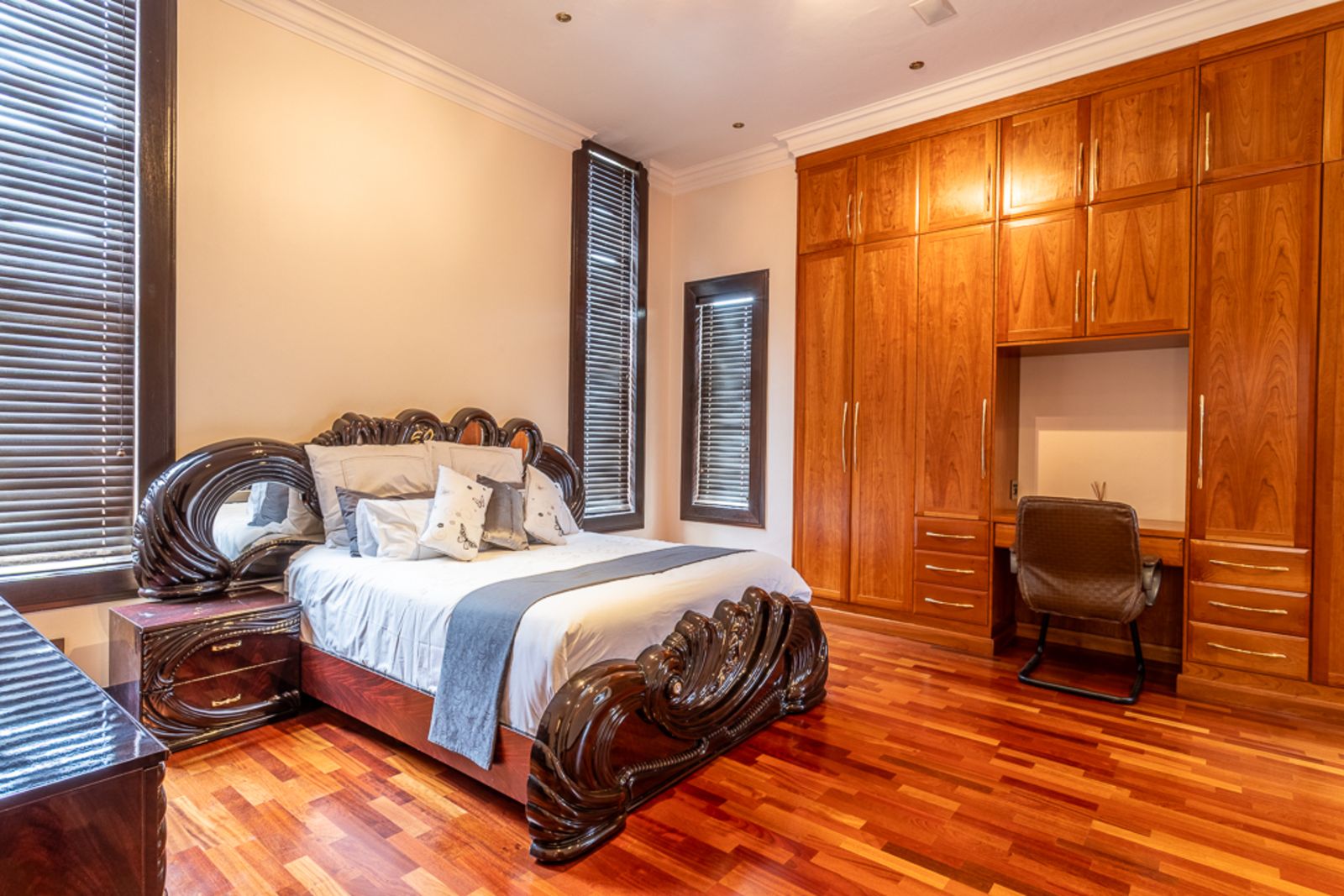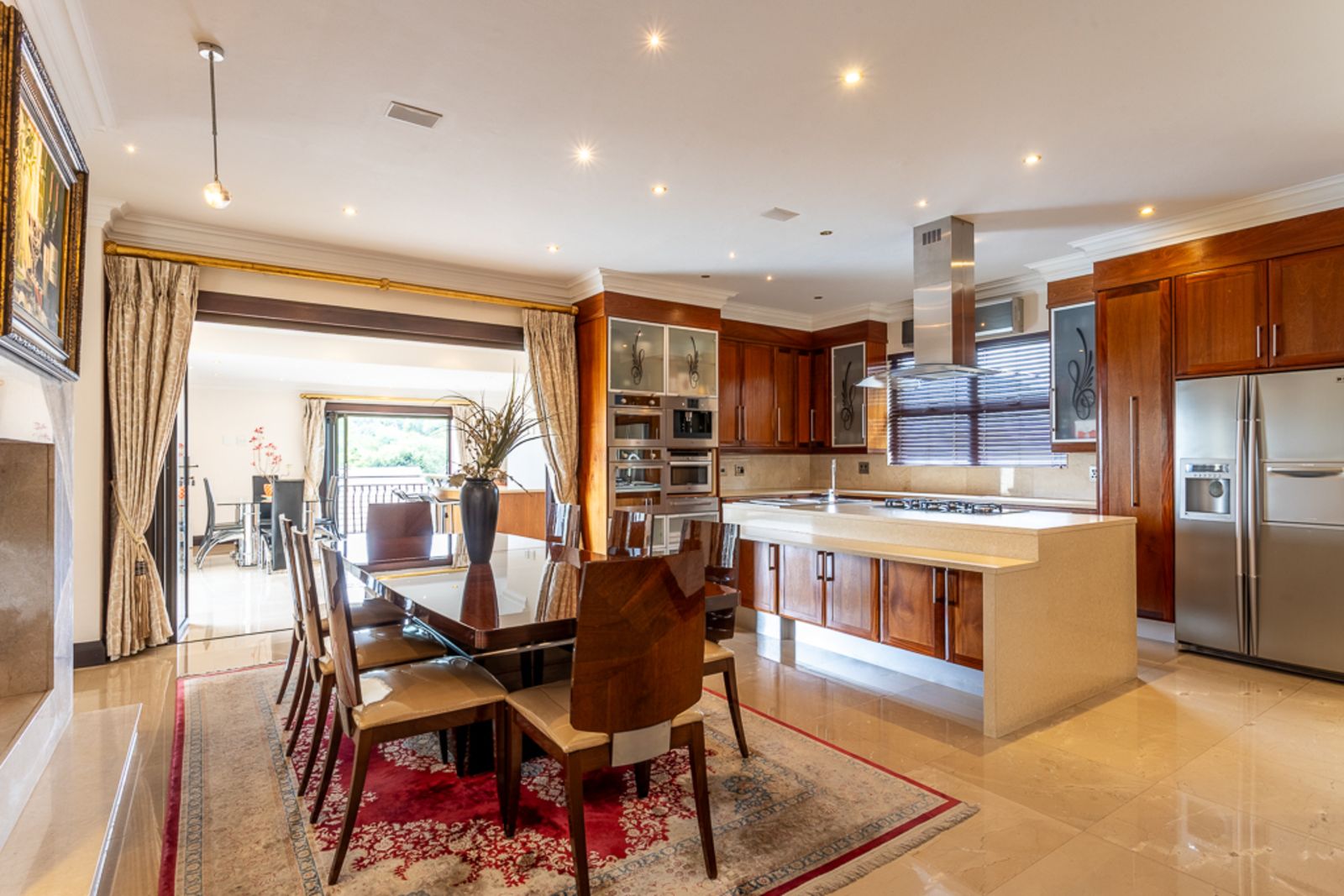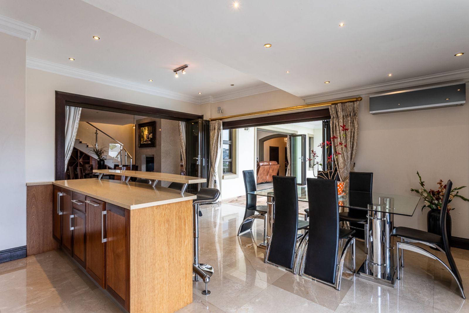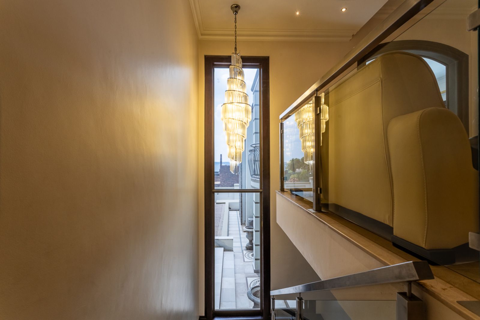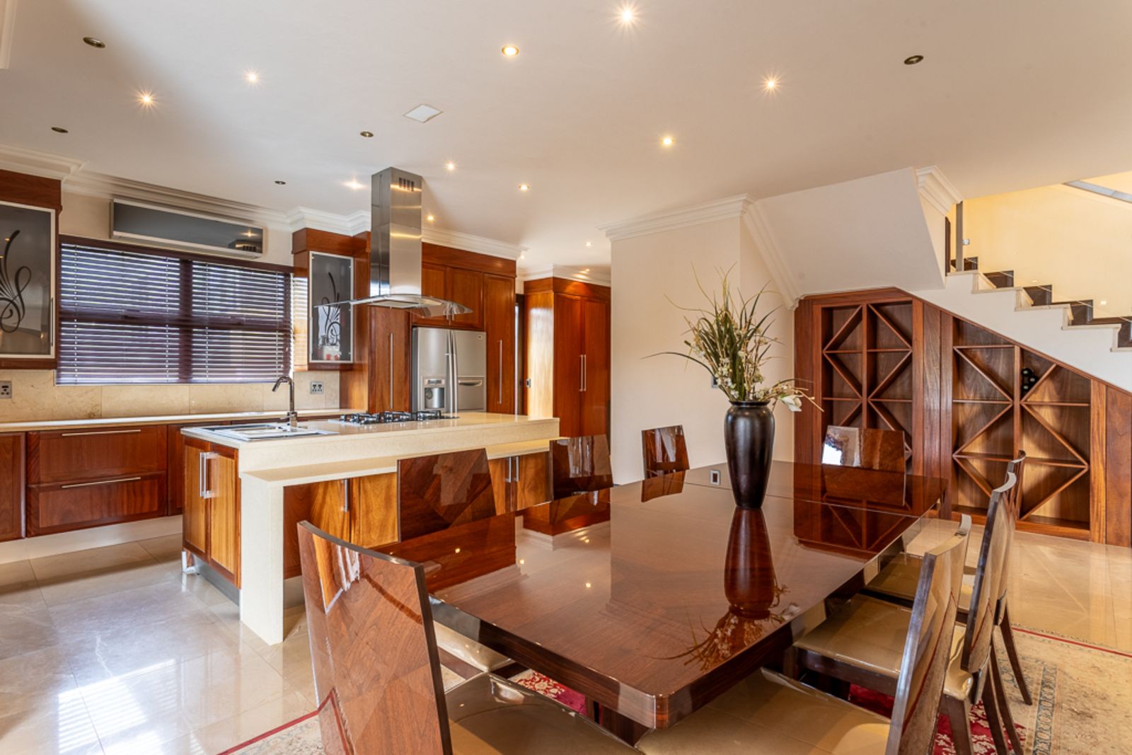 The ground floor offers a seamless flow for everyday living and effortless entertaining. You’re welcomed by an elegant entrance hall leading into generous living areas, two dining spaces, and a solid-wood kitchen fitted with Caesarstone tops, an integrated coffee machine, eye-level ovens, pantry, scullery, and laundry. This level also includes two large bedrooms, a TV room, a fitted bar, and a guest toilet. Sliding doors open to the patio with a built-in gas braai, overlooking the heated pool with clever storage built beneath the wooden deck.