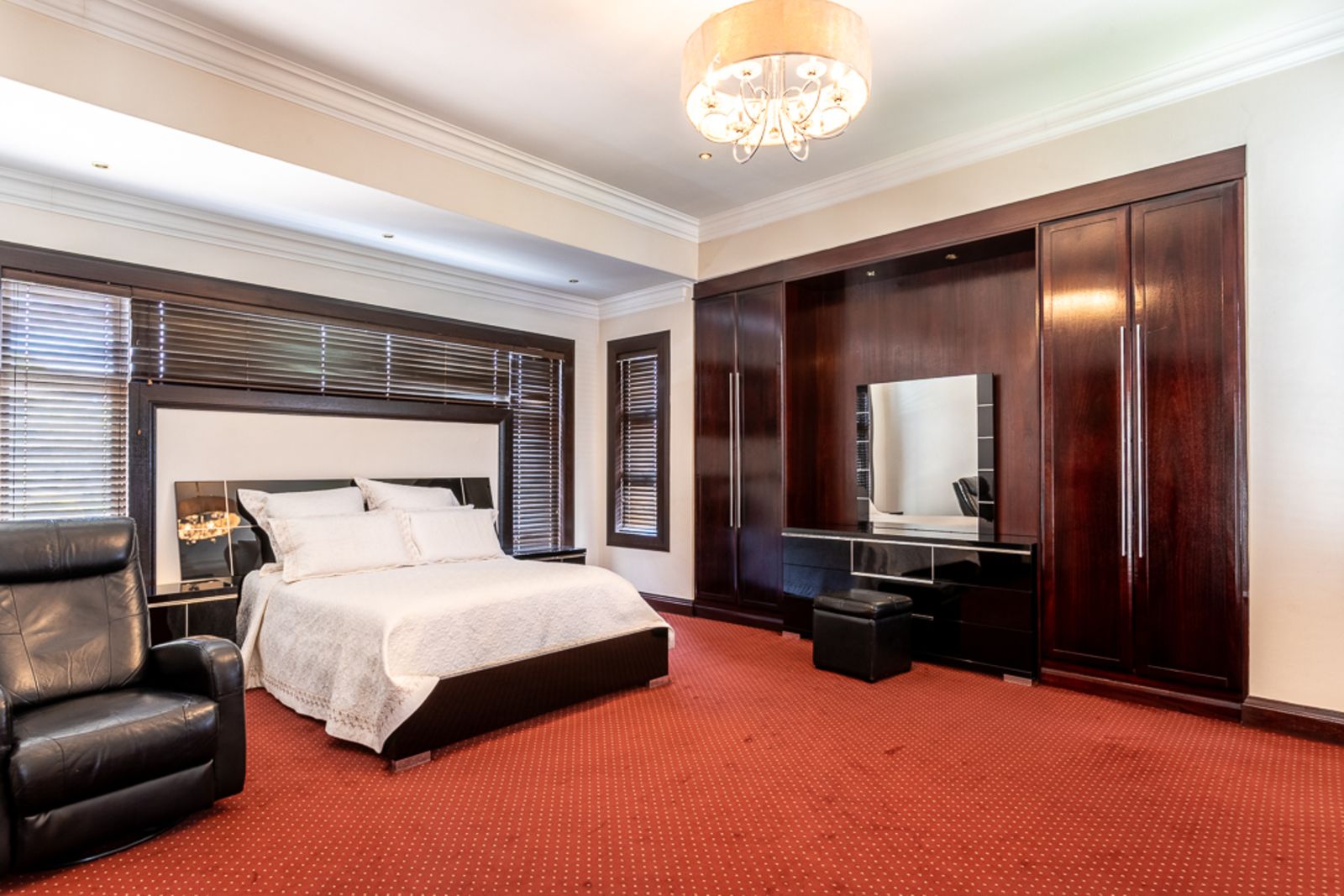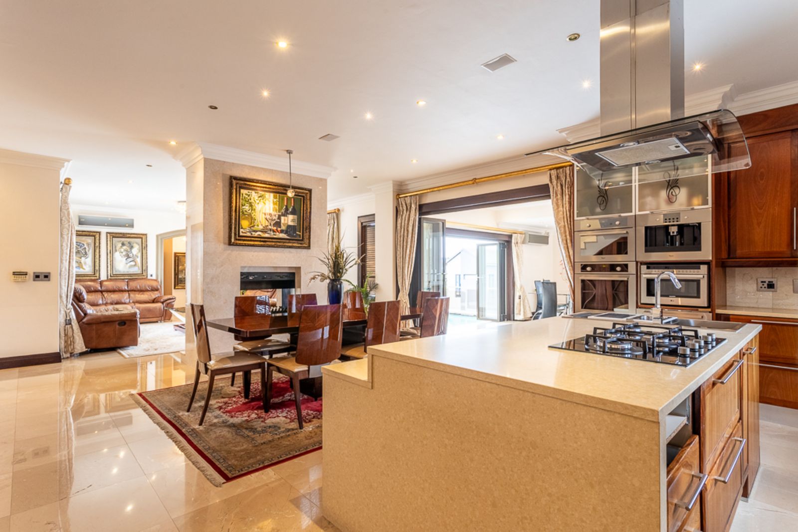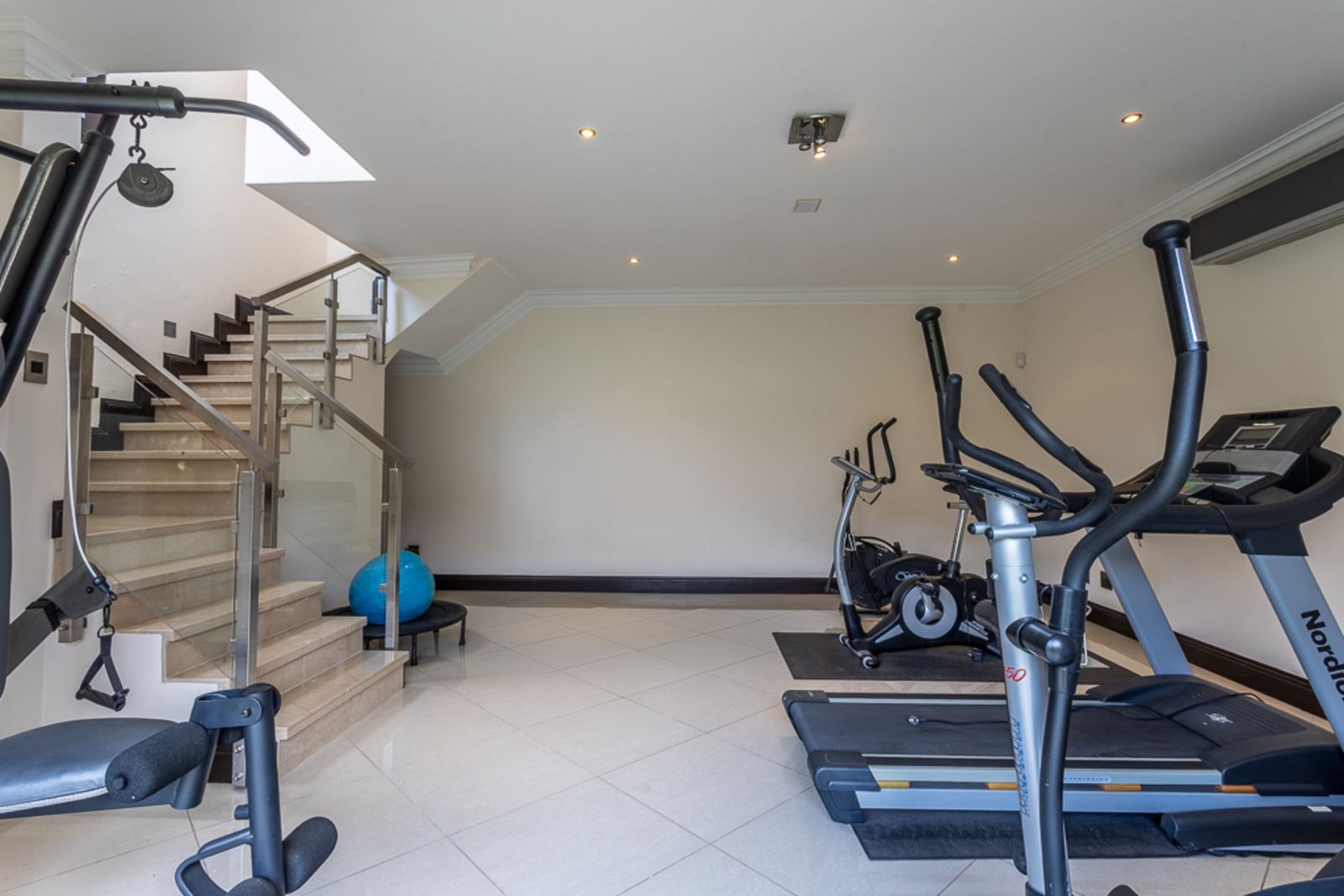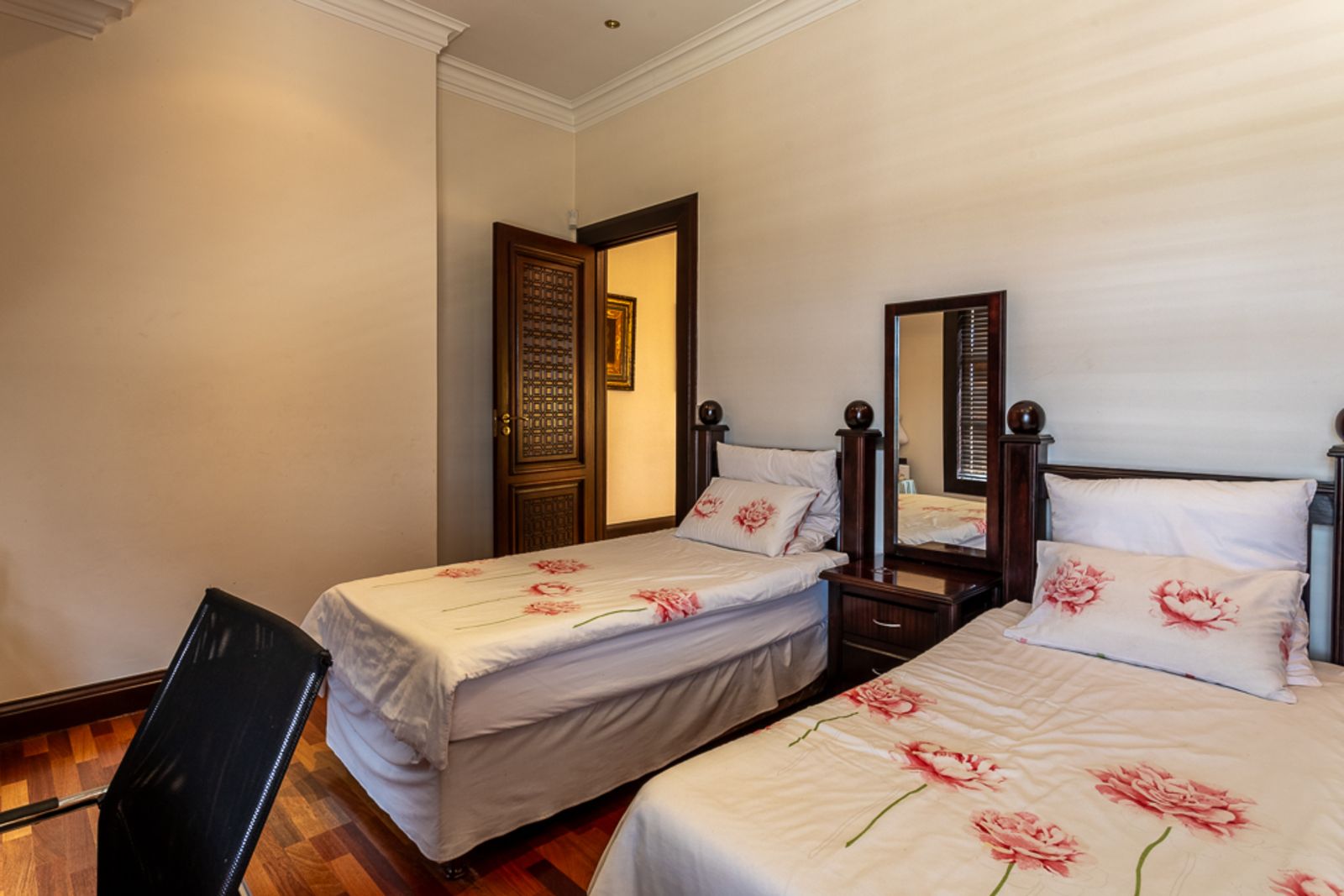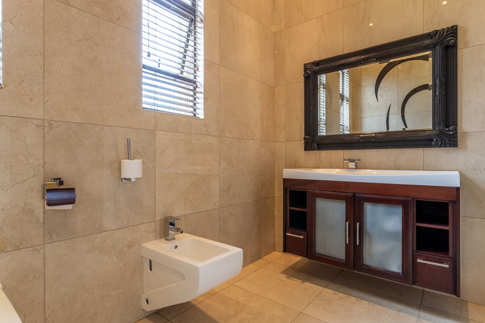 The ground floor offers a seamless flow for everyday living and effortless entertaining. You’re welcomed by an elegant entrance hall leading into generous living areas, two dining spaces, and a solid-wood kitchen fitted with Caesarstone tops, an integrated coffee machine, eye-level ovens, pantry, scullery, and laundry. This level also includes two large bedrooms, a TV room, a fitted bar, and a guest toilet. Sliding doors open to the patio with a built-in gas braai, overlooking the heated pool with clever storage built beneath the wooden deck.