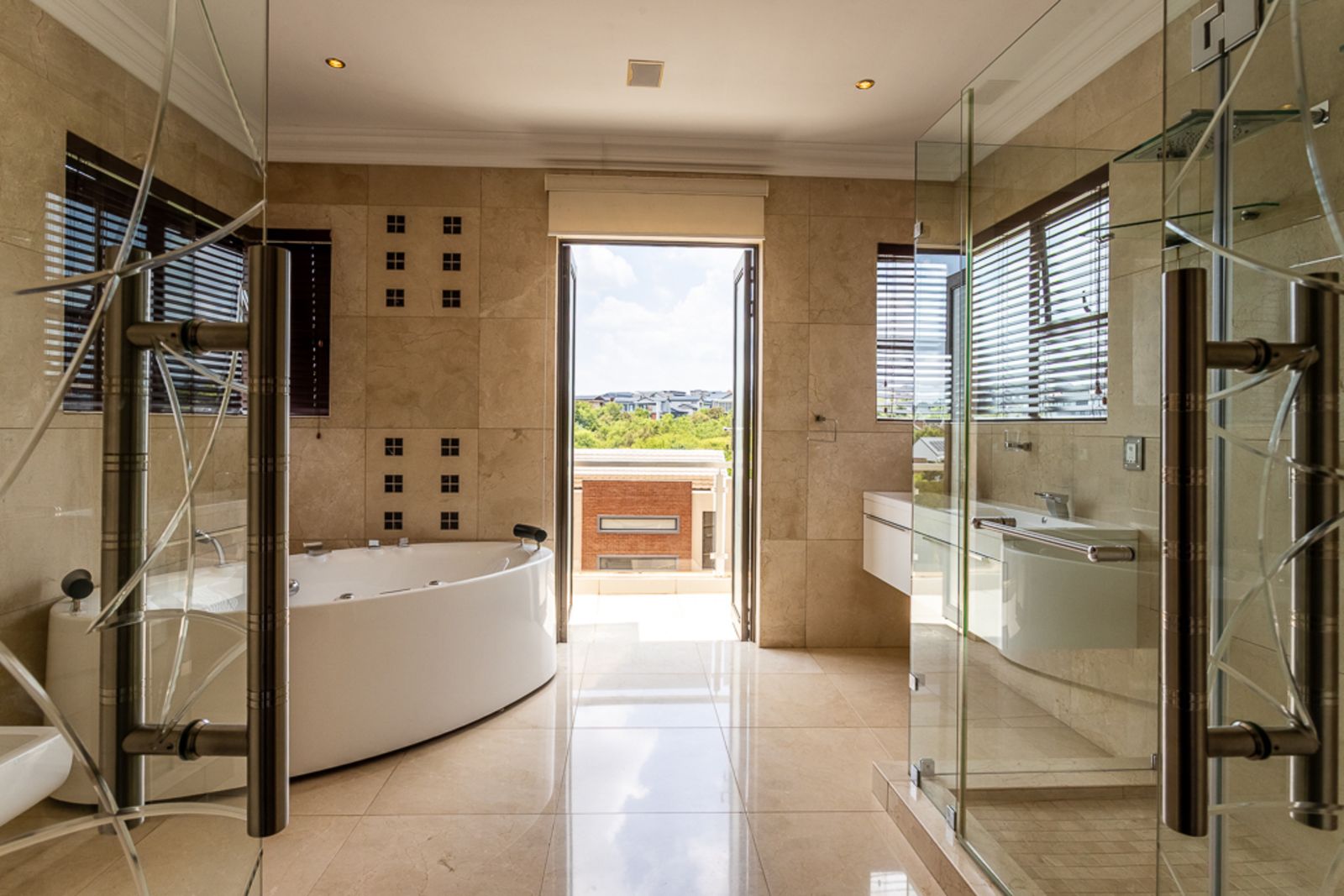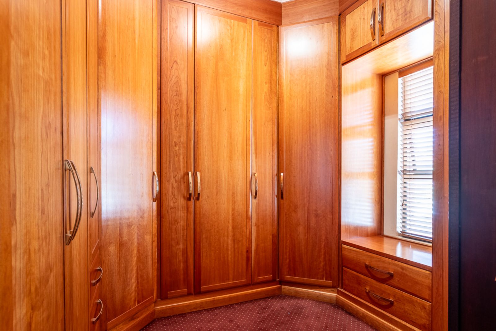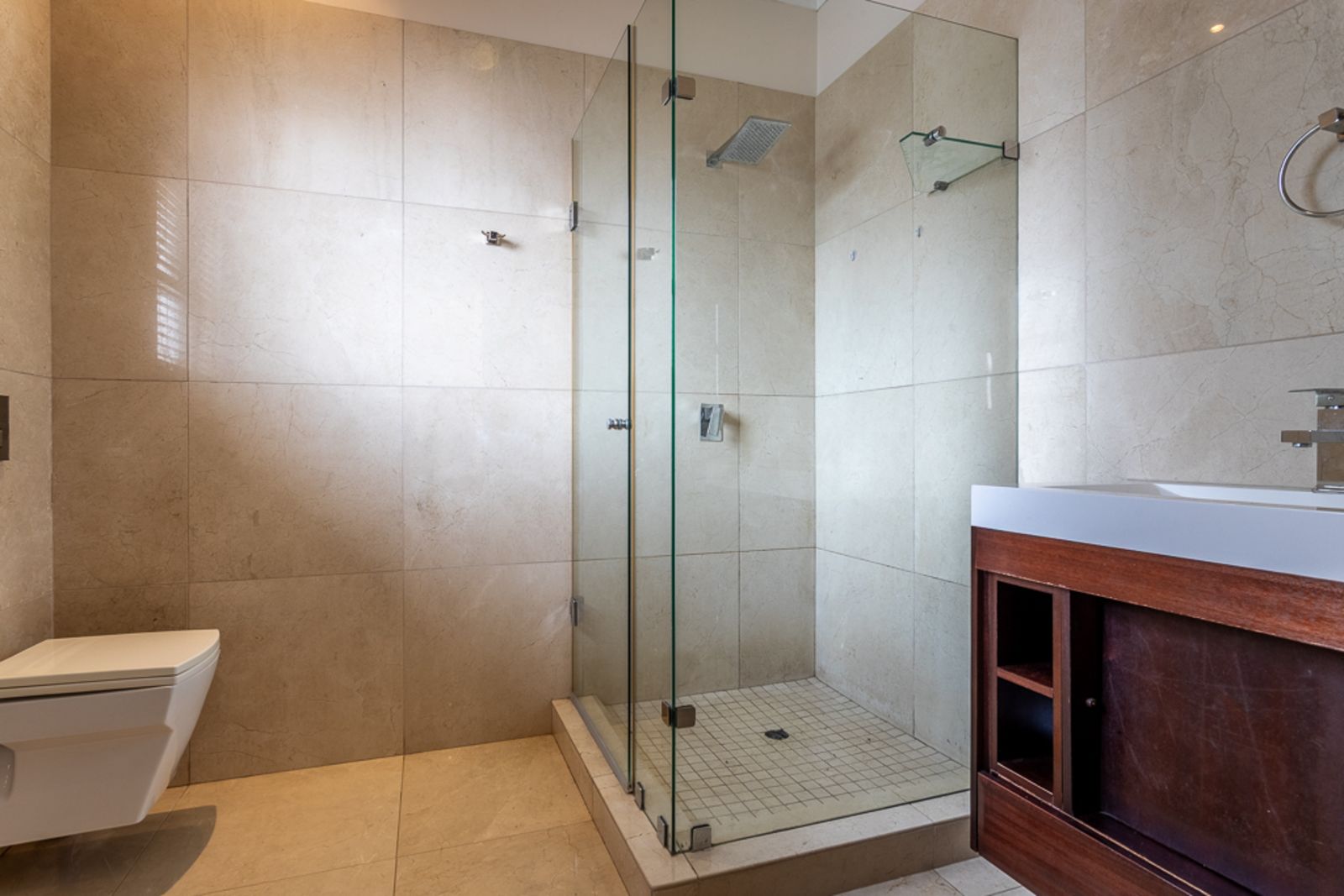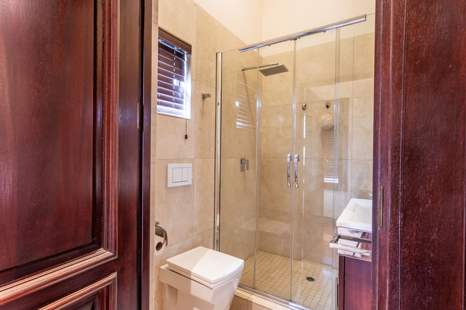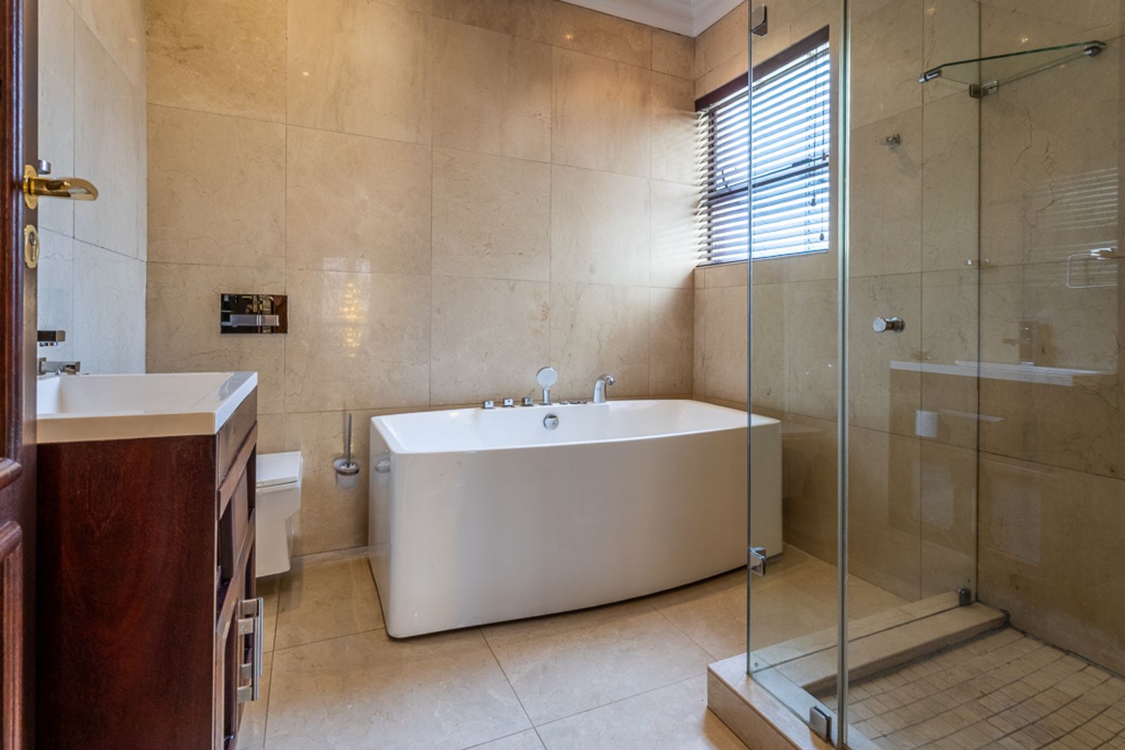 The ground floor offers a seamless flow for everyday living and effortless entertaining. You’re welcomed by an elegant entrance hall leading into generous living areas, two dining spaces, and a solid-wood kitchen fitted with Caesarstone tops, an integrated coffee machine, eye-level ovens, pantry, scullery, and laundry. This level also includes two large bedrooms, a TV room, a fitted bar, and a guest toilet. Sliding doors open to the patio with a built-in gas braai, overlooking the heated pool with clever storage built beneath the wooden deck.