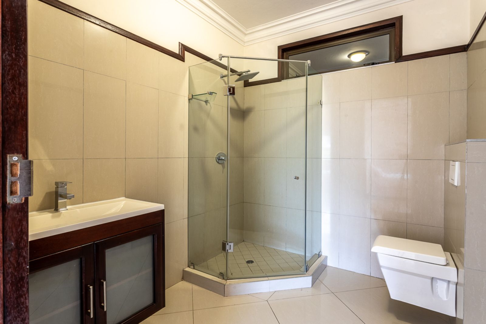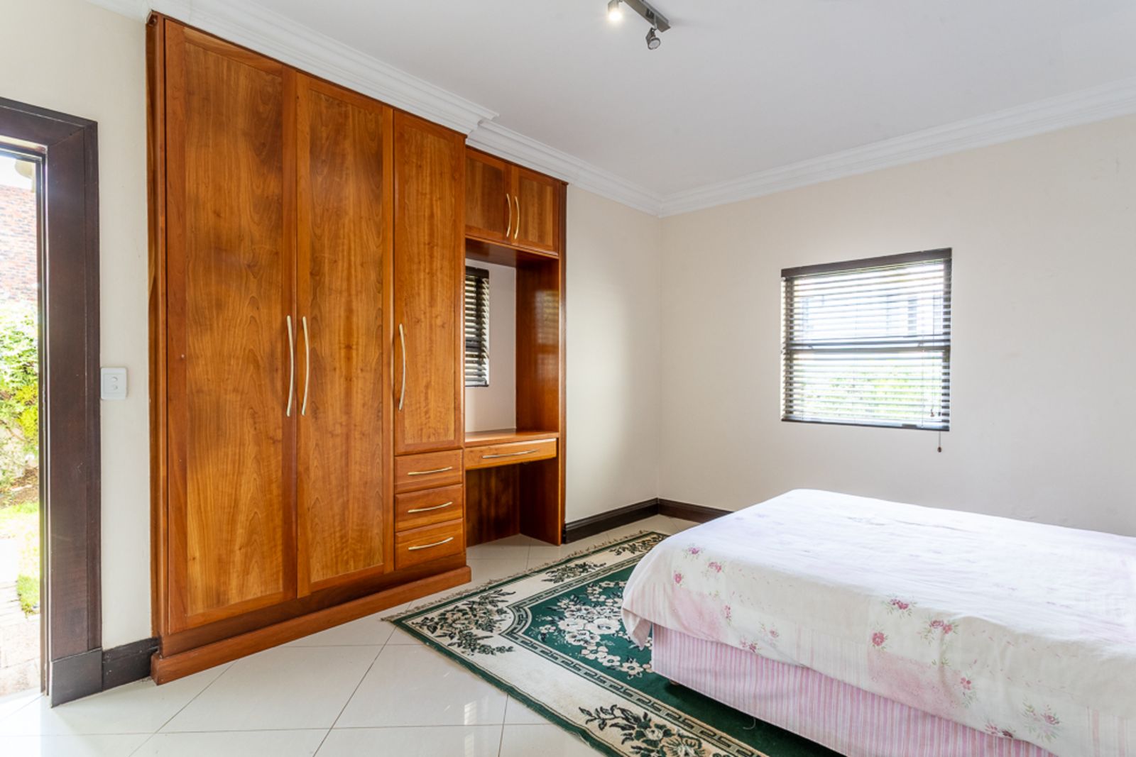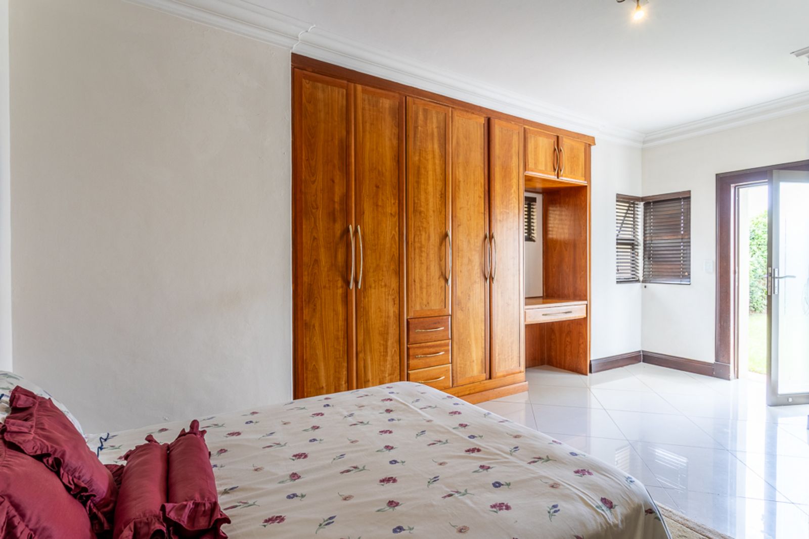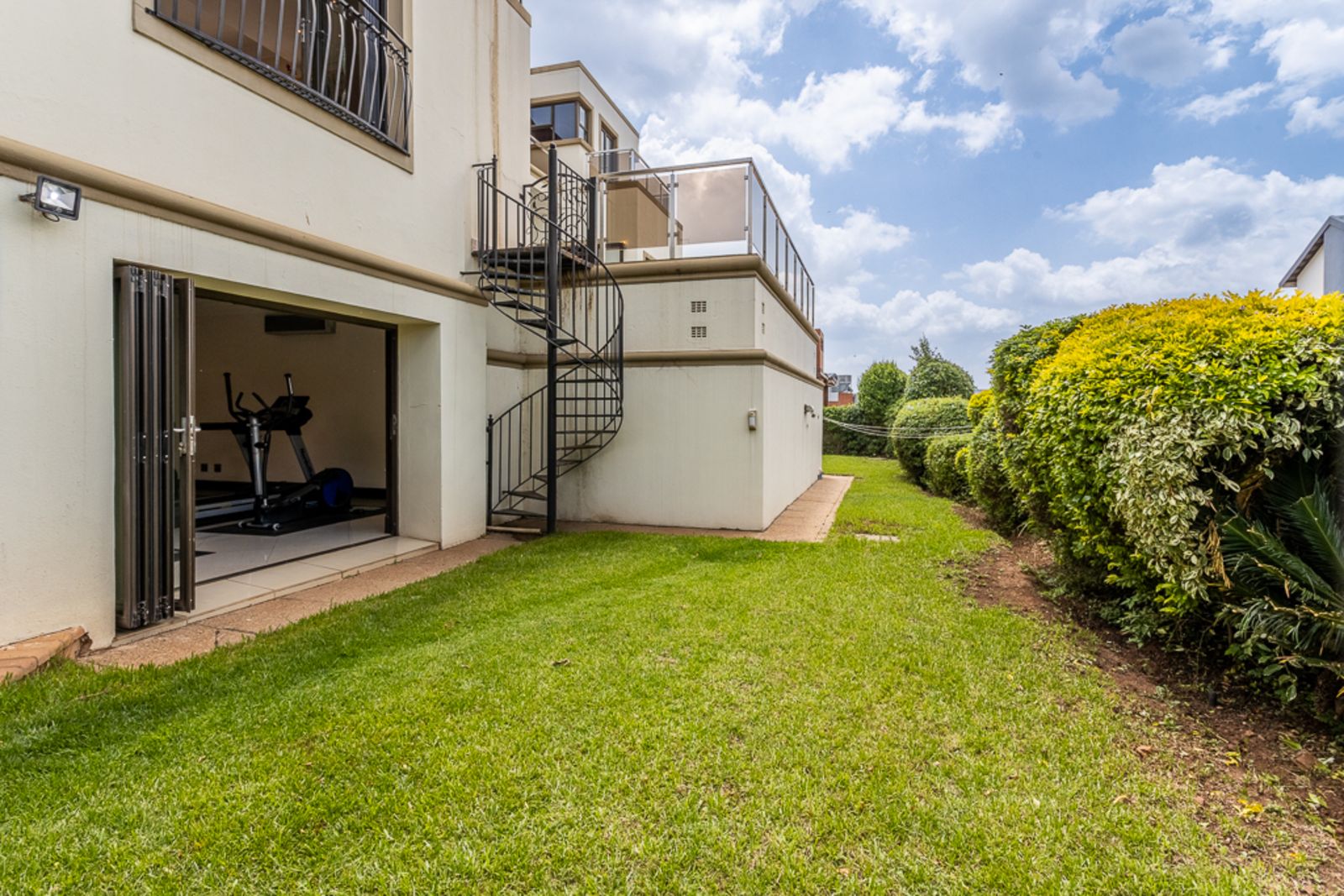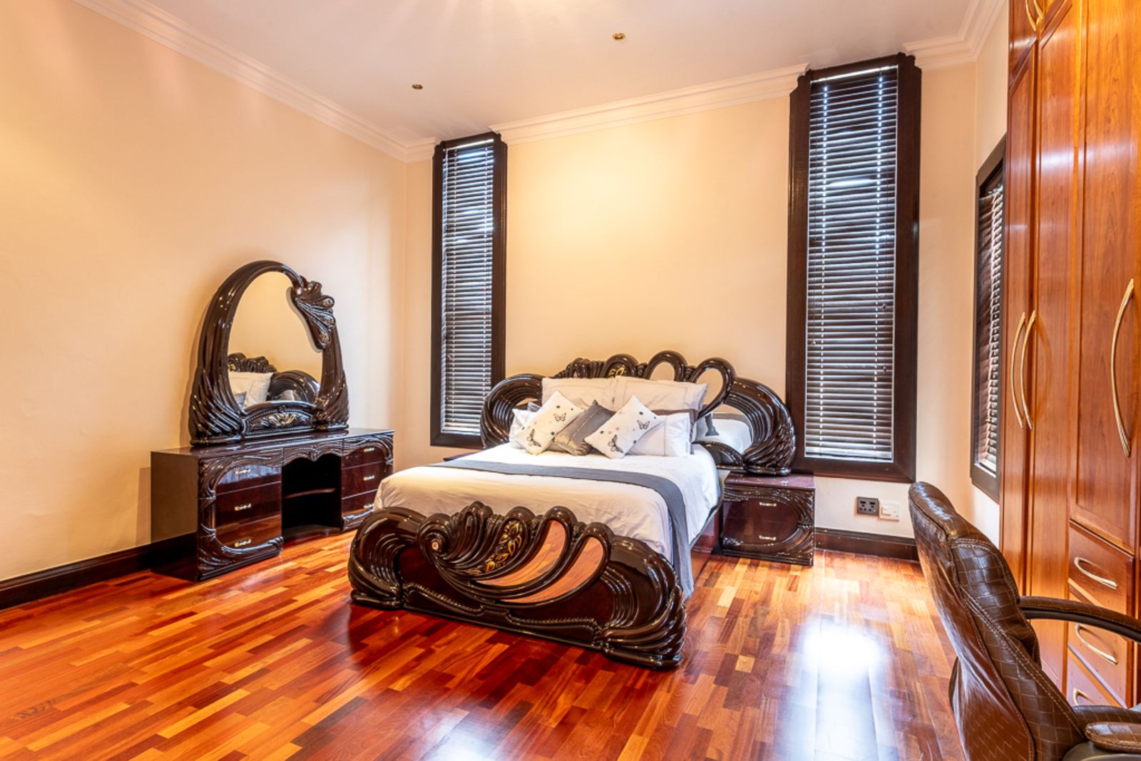 The ground floor offers a seamless flow for everyday living and effortless entertaining. You’re welcomed by an elegant entrance hall leading into generous living areas, two dining spaces, and a solid-wood kitchen fitted with Caesarstone tops, an integrated coffee machine, eye-level ovens, pantry, scullery, and laundry. This level also includes two large bedrooms, a TV room, a fitted bar, and a guest toilet. Sliding doors open to the patio with a built-in gas braai, overlooking the heated pool with clever storage built beneath the wooden deck.