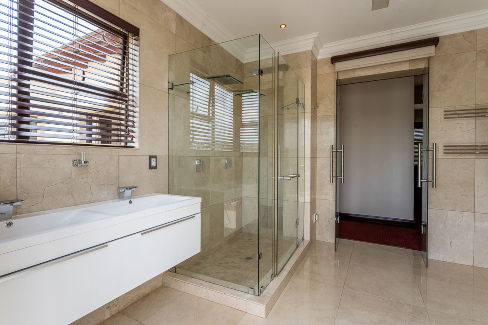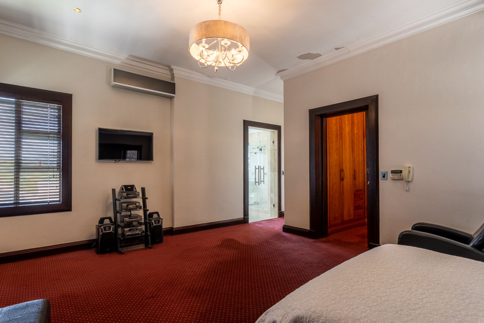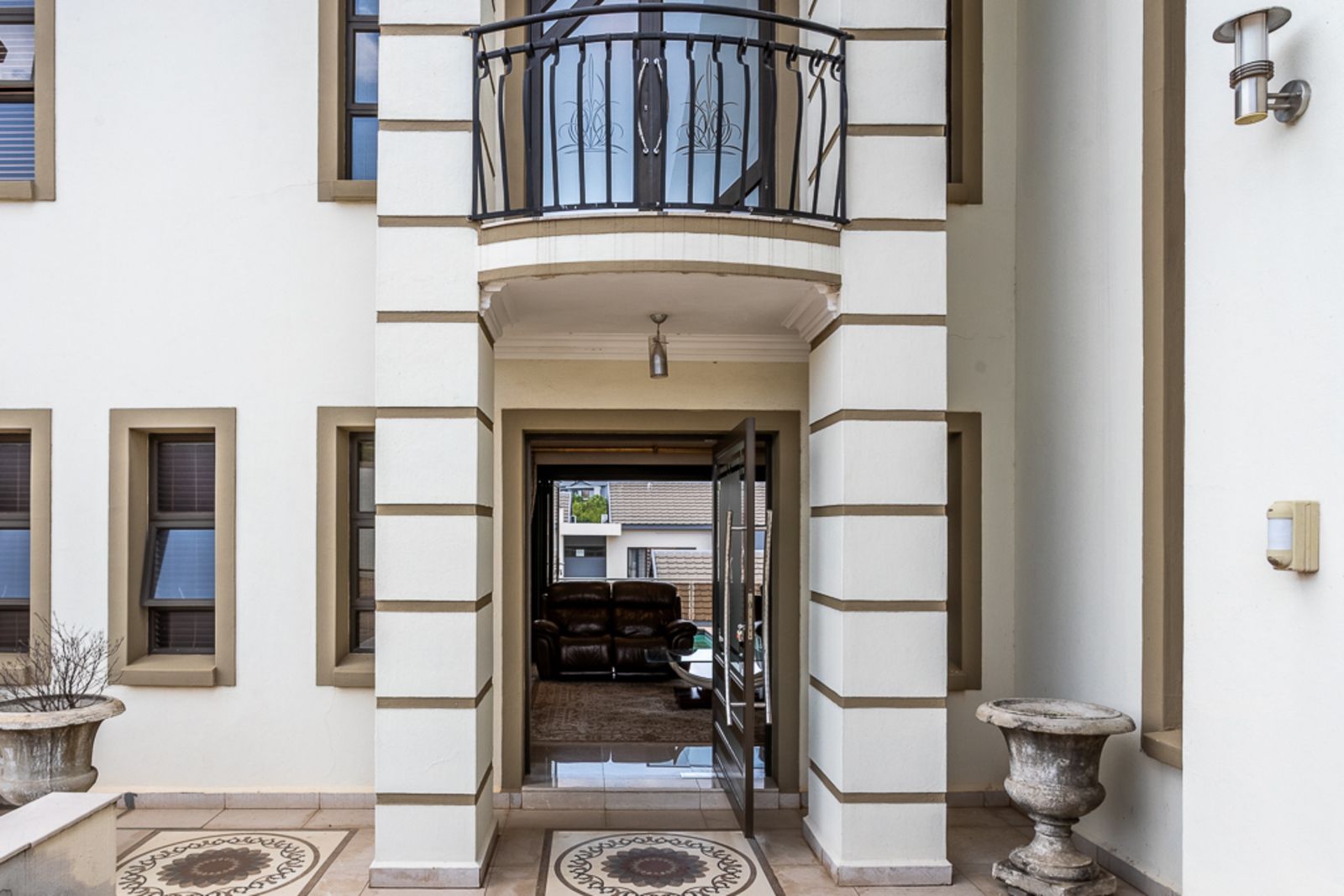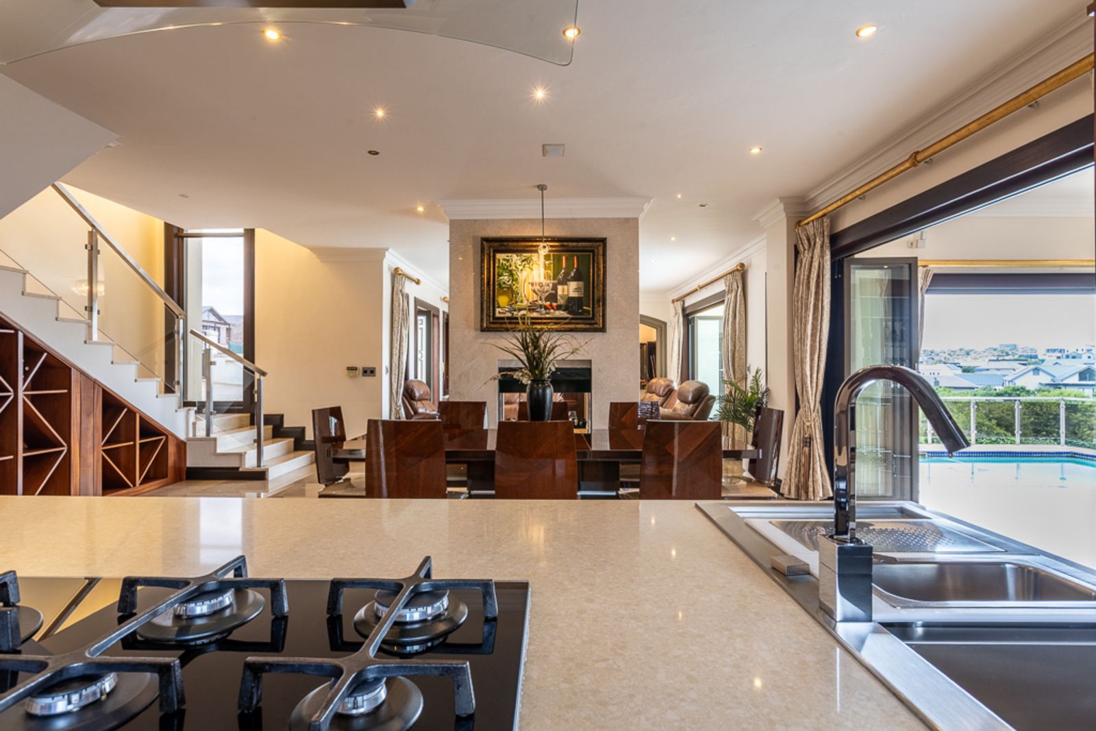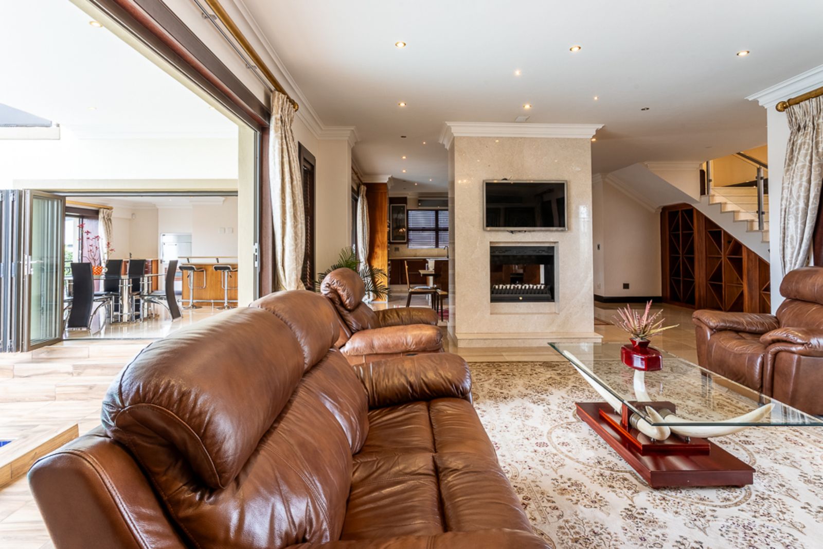 Additional features include air-conditioning in most rooms, two gas fireplaces, underfloor heating in selected areas, two geysers, automated irrigation, storage under the staircase, staff quarters, three garages, and a balcony with beautiful open views.