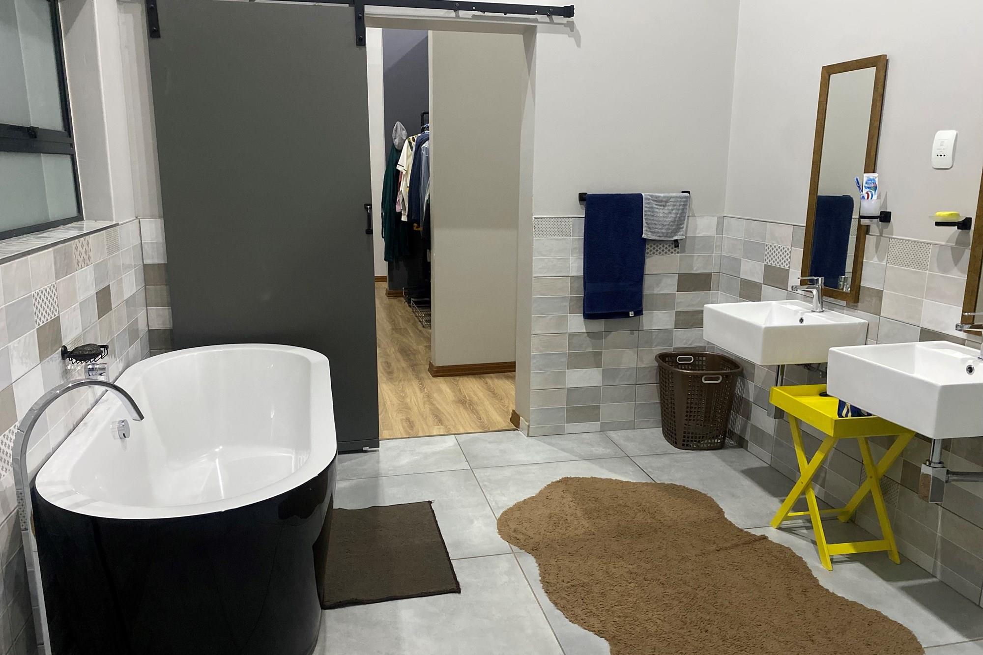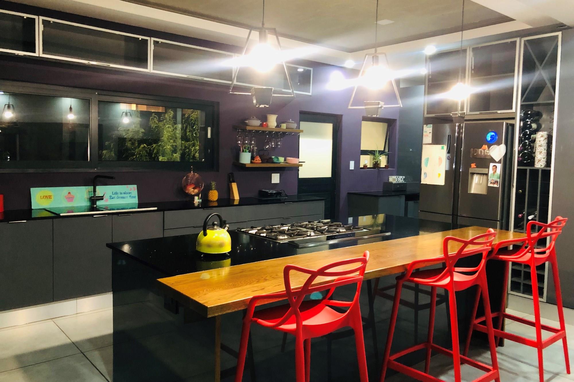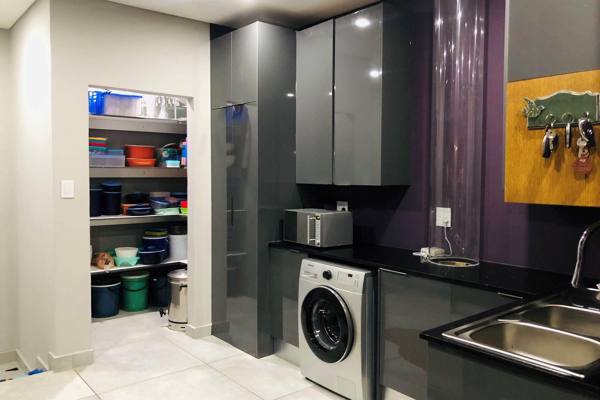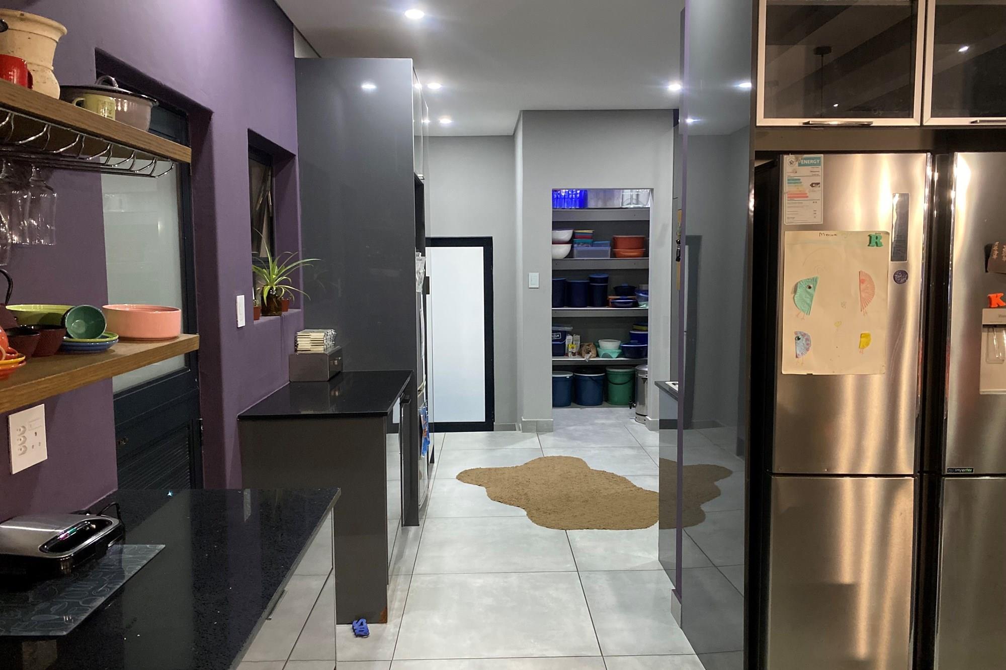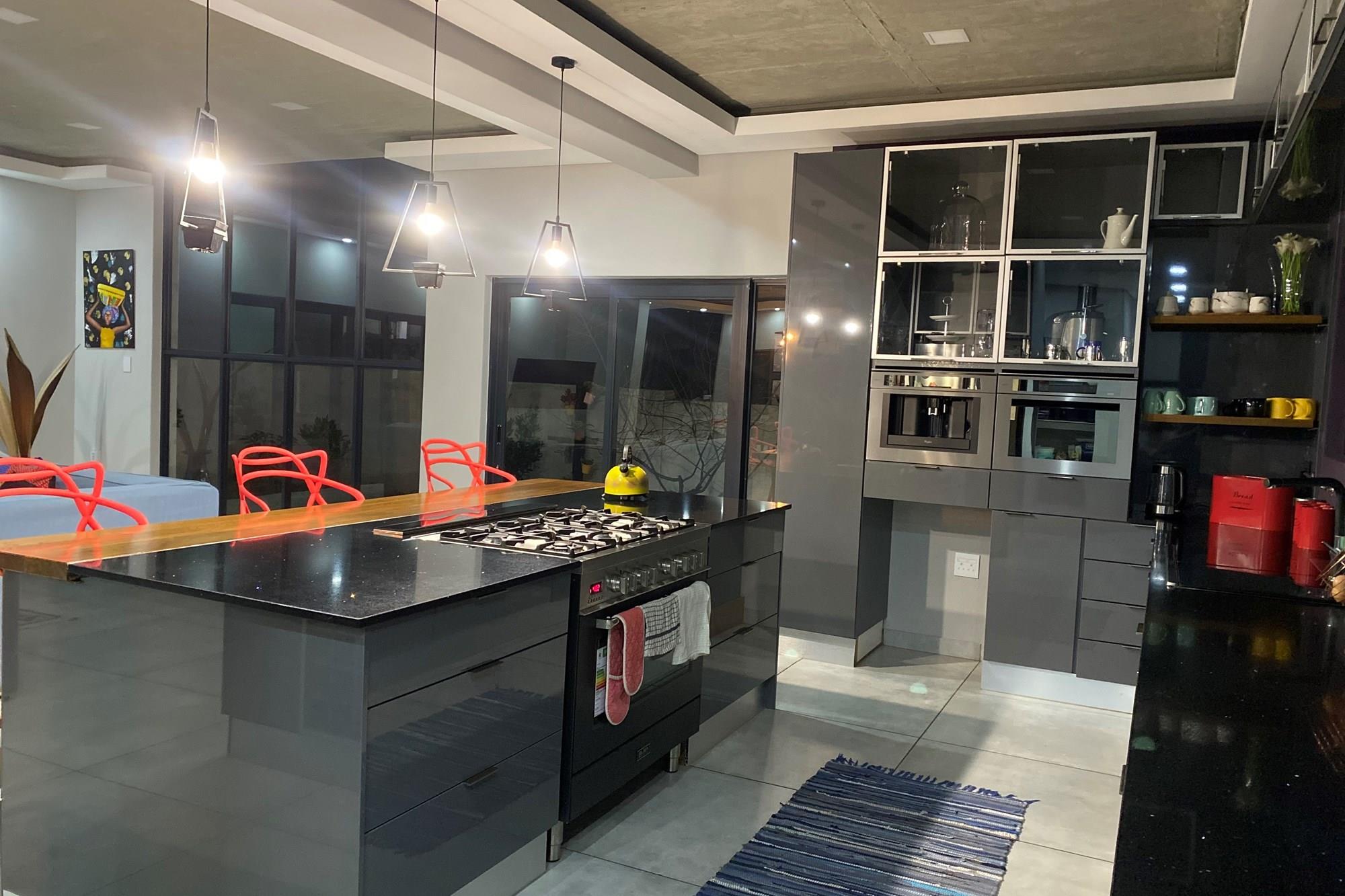 The house boasts a beautifully designed open plan kitchen, complete with a 5 burner gas stove, glass display cupboards and built in ovens, providing the perfect setting for culinary enthusiasts. Additionally, a spacious scullery with a laundry tube and 2 solar geysers of which one is solar powered, promoting energy efficiency and sustainability.