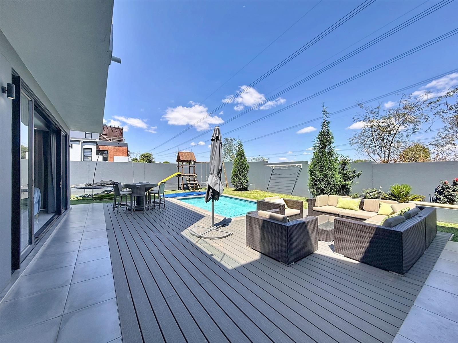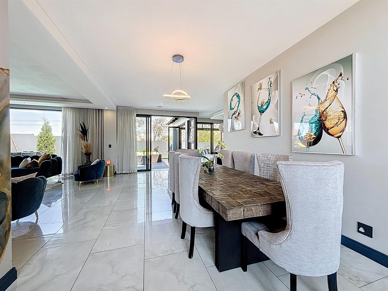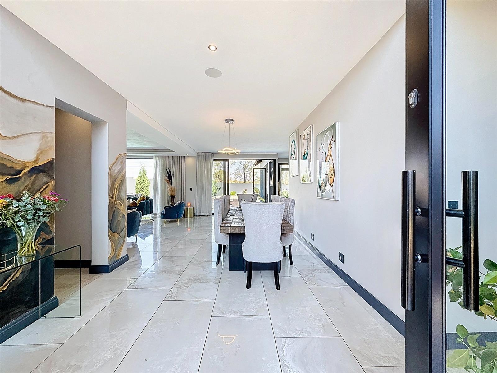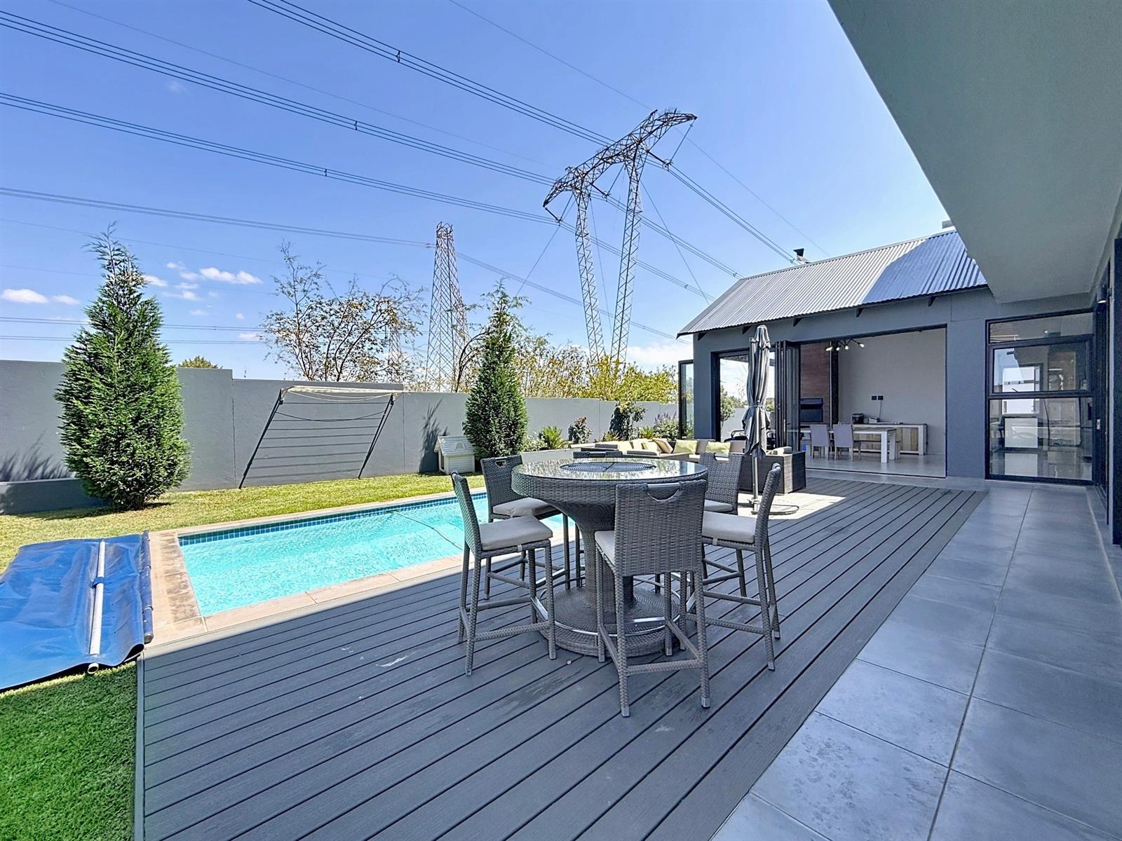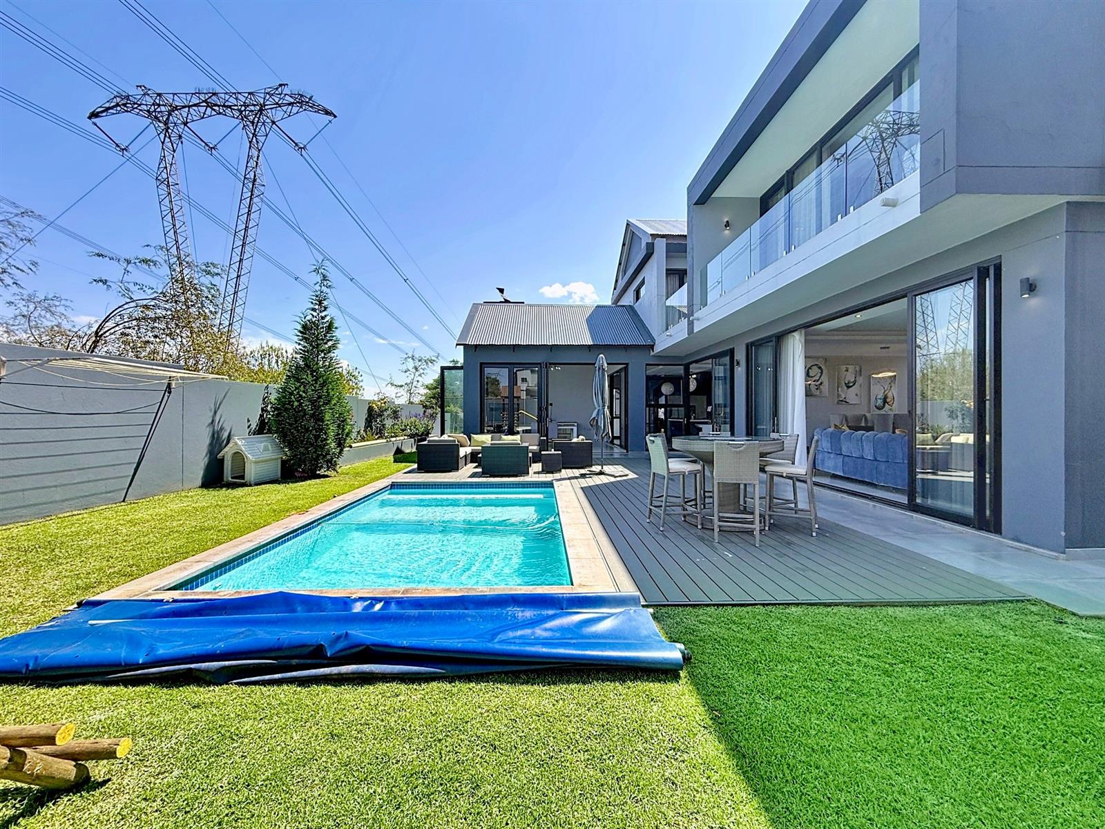 Step inside to discover expansive open-plan living areas that flow effortlessly from a contemporary lounge and dining space into a beautifully appointed gourmet kitchen, complete with scullery and pantry and laundry room. The separate study is ideal for working from home, while the entertainment area and dedicated braai room open onto a manicured garden with a sparkling pool — a perfect space for family gatherings and summer evenings.