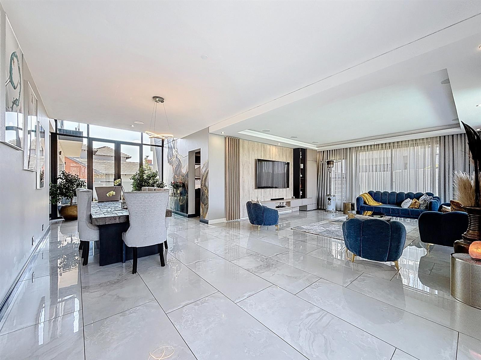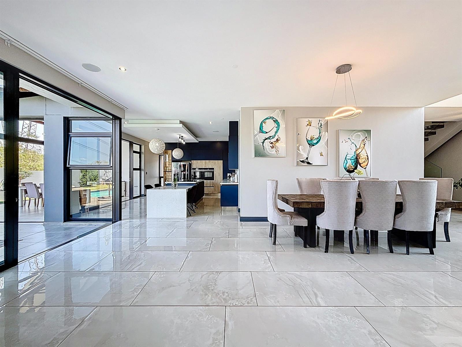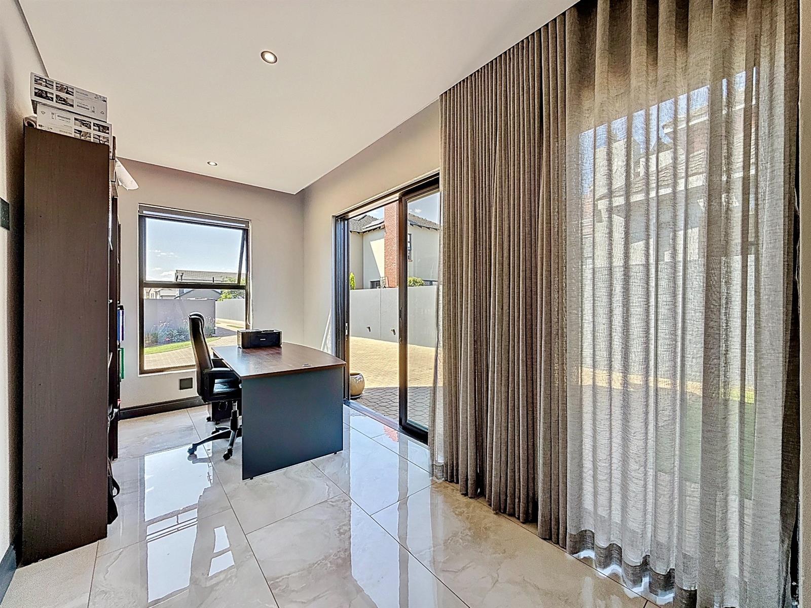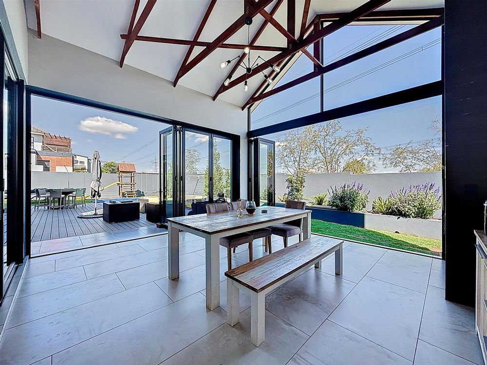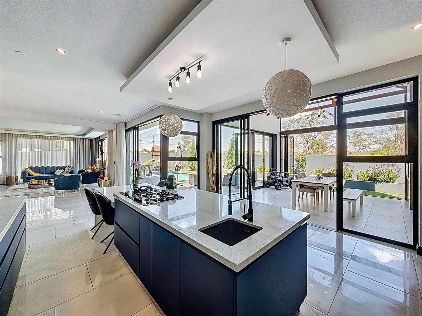 Step inside to discover expansive open-plan living areas that flow effortlessly from a contemporary lounge and dining space into a beautifully appointed gourmet kitchen, complete with scullery and pantry and laundry room. The separate study is ideal for working from home, while the entertainment area and dedicated braai room open onto a manicured garden with a sparkling pool — a perfect space for family gatherings and summer evenings.