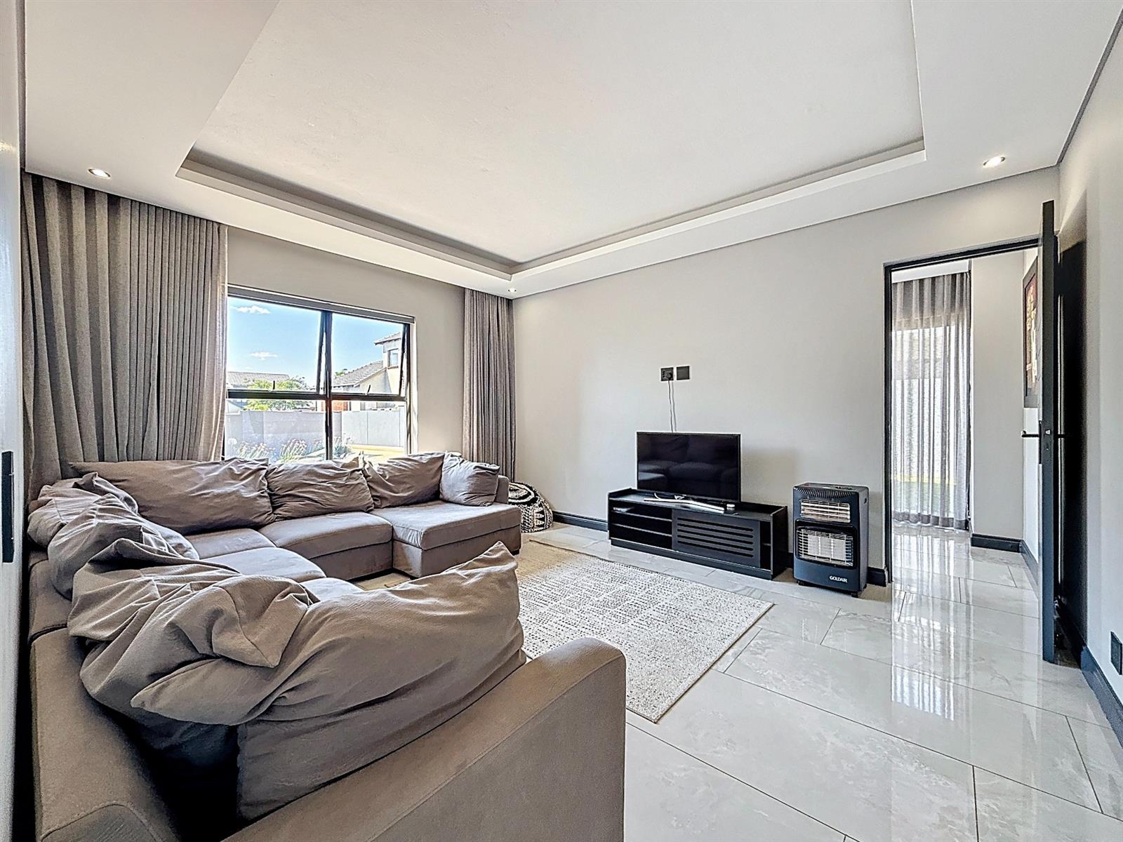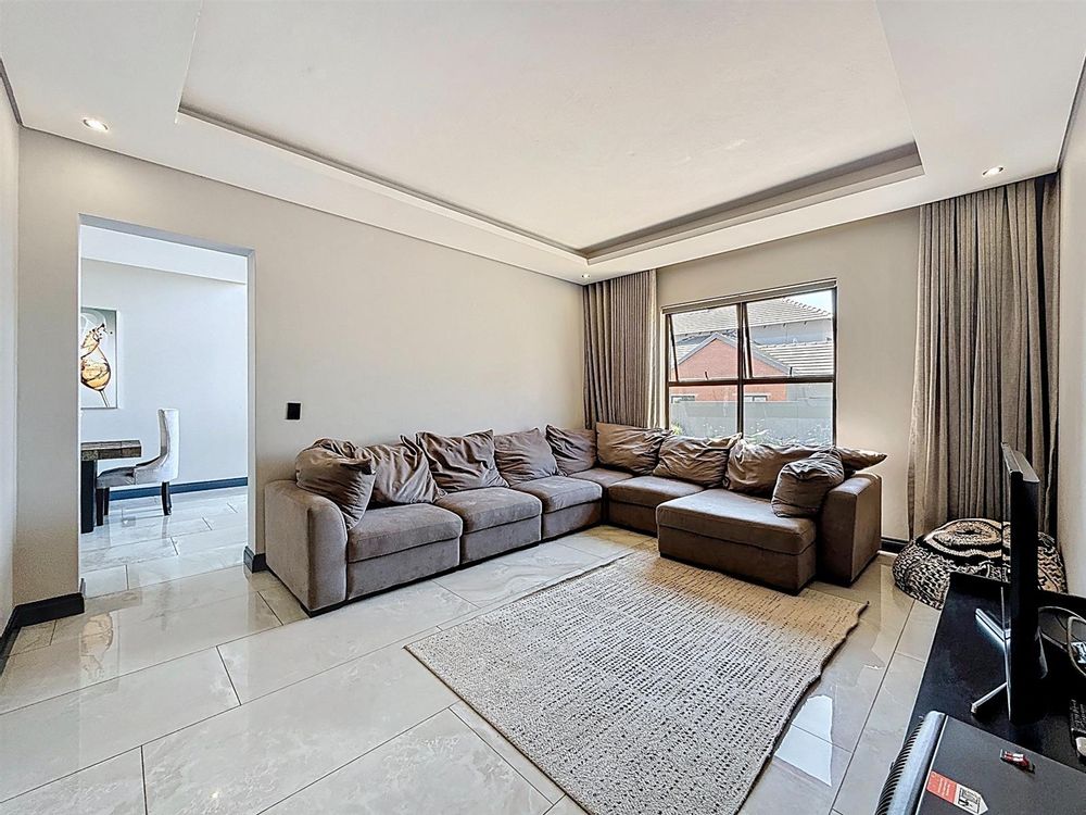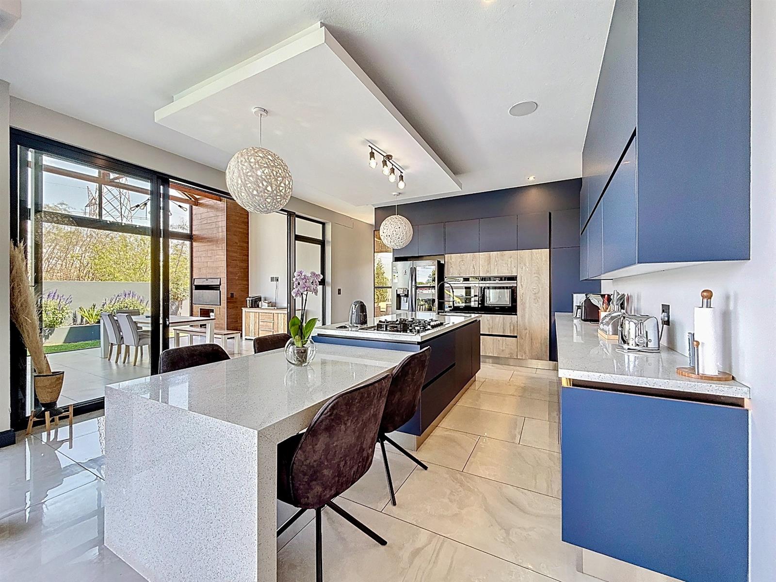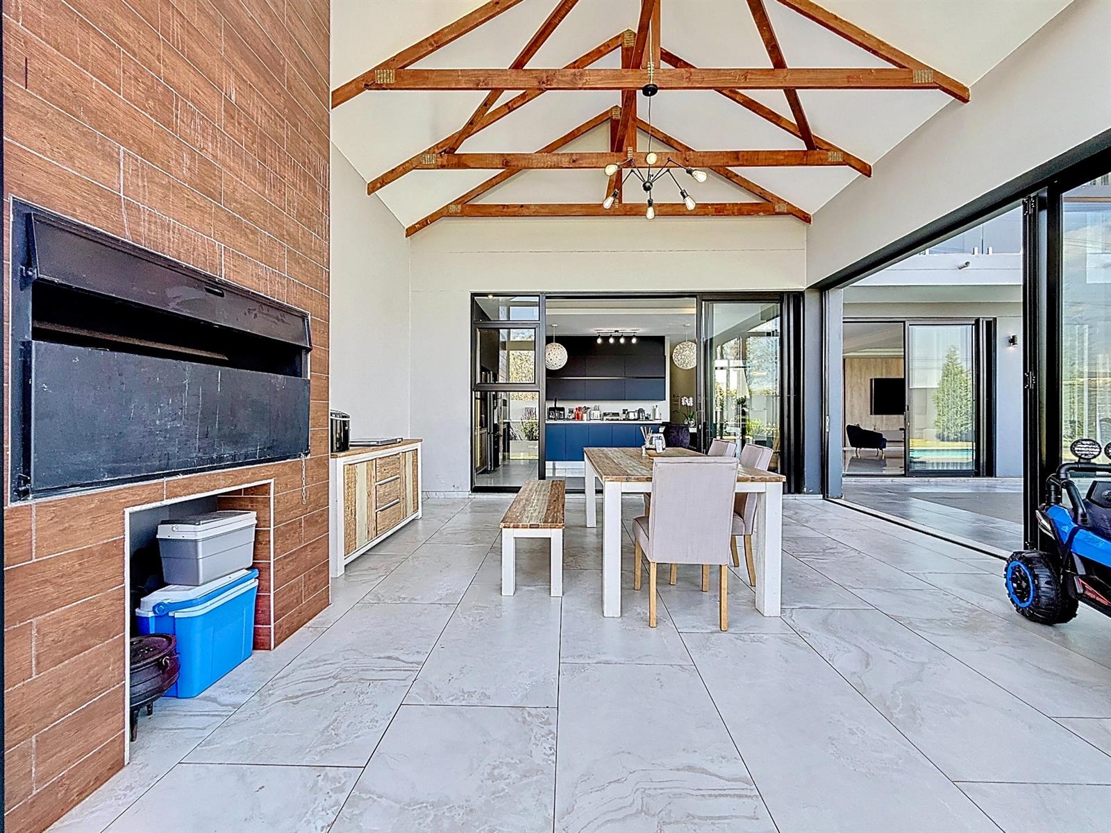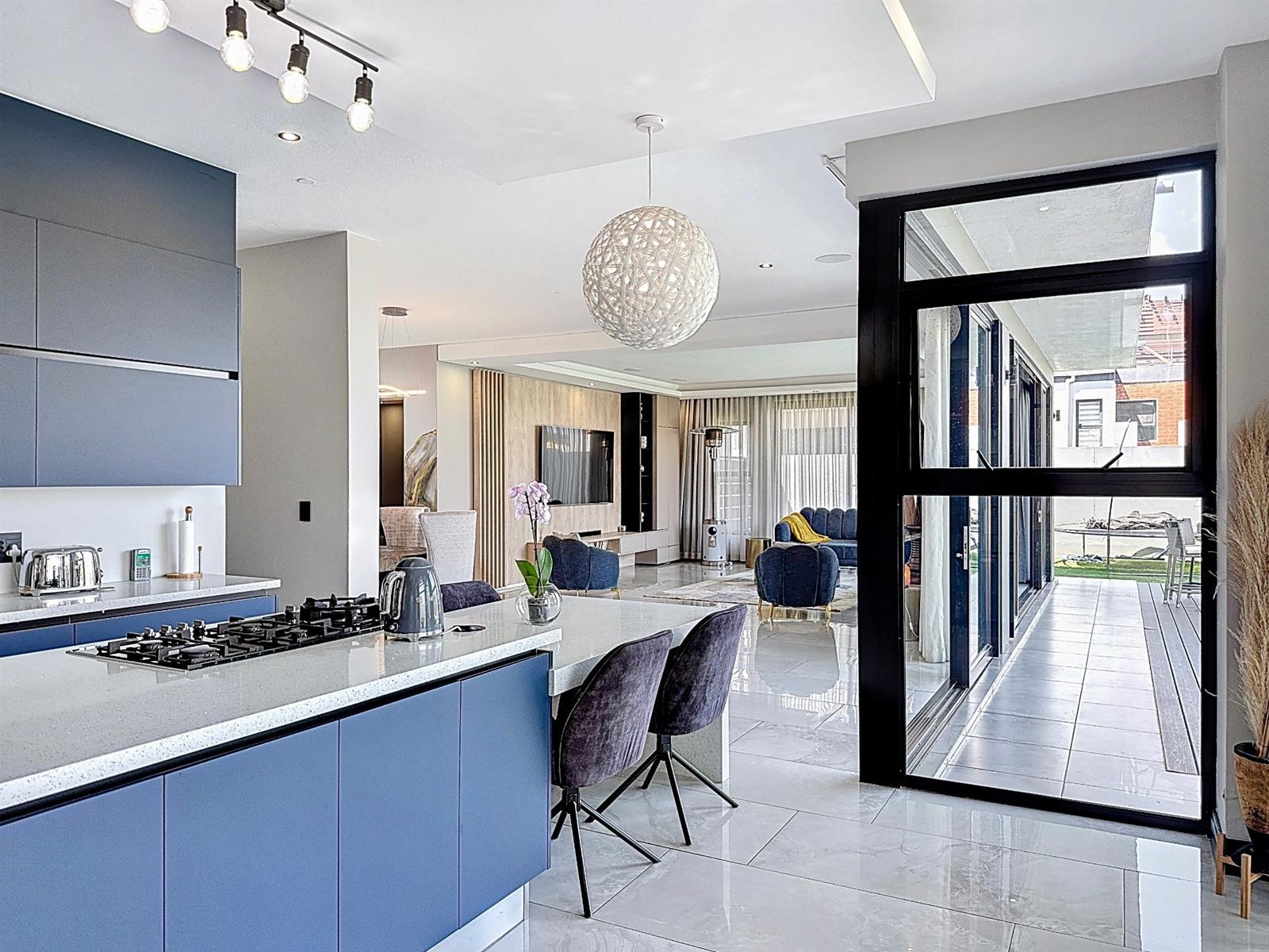 Step inside to discover expansive open-plan living areas that flow effortlessly from a contemporary lounge and dining space into a beautifully appointed gourmet kitchen, complete with scullery and pantry and laundry room. The separate study is ideal for working from home, while the entertainment area and dedicated braai room open onto a manicured garden with a sparkling pool — a perfect space for family gatherings and summer evenings.