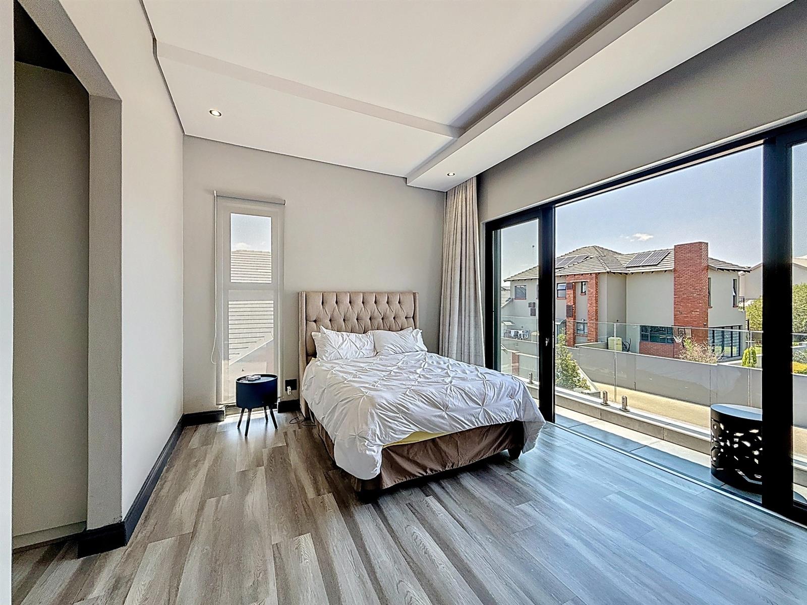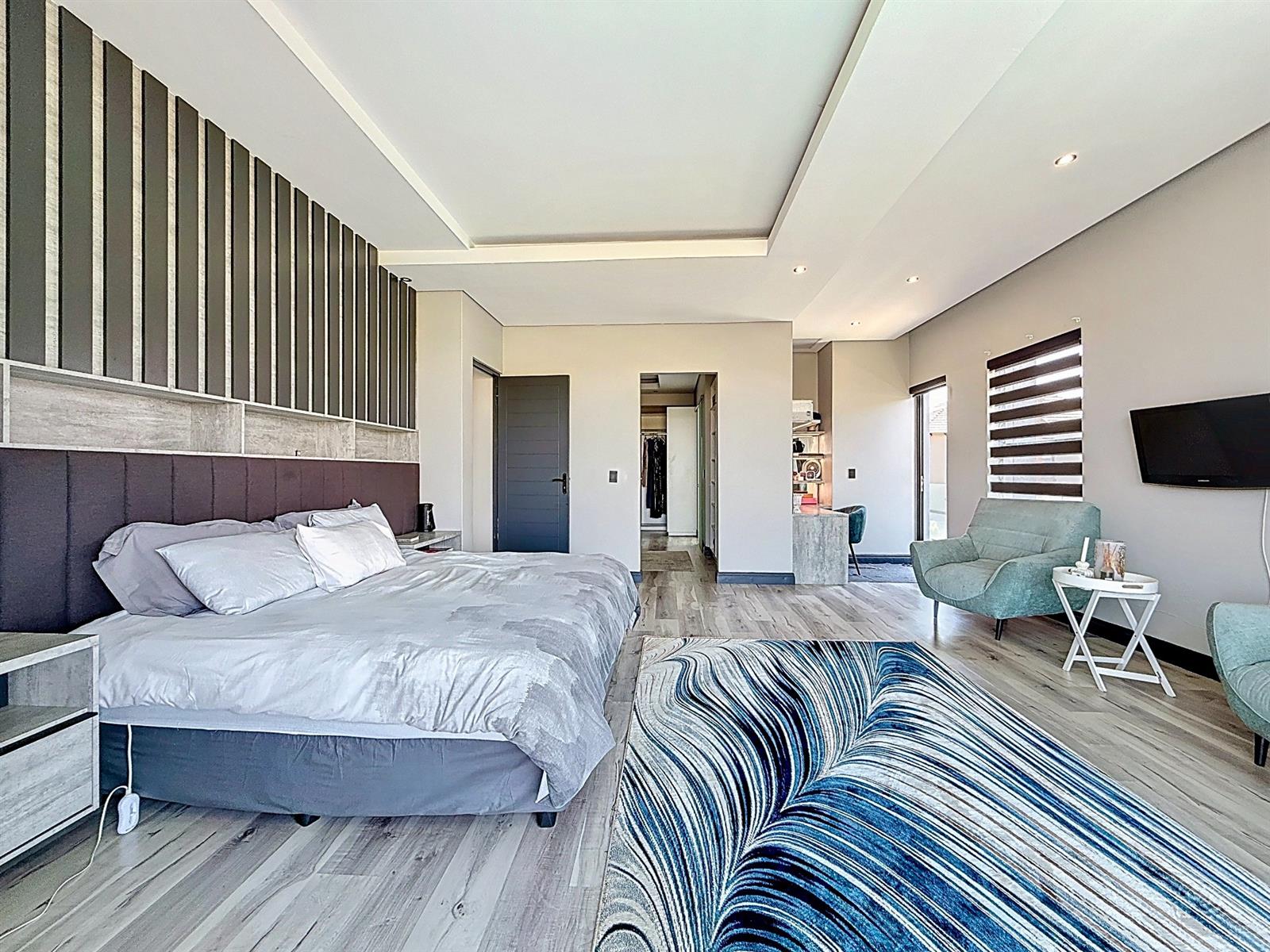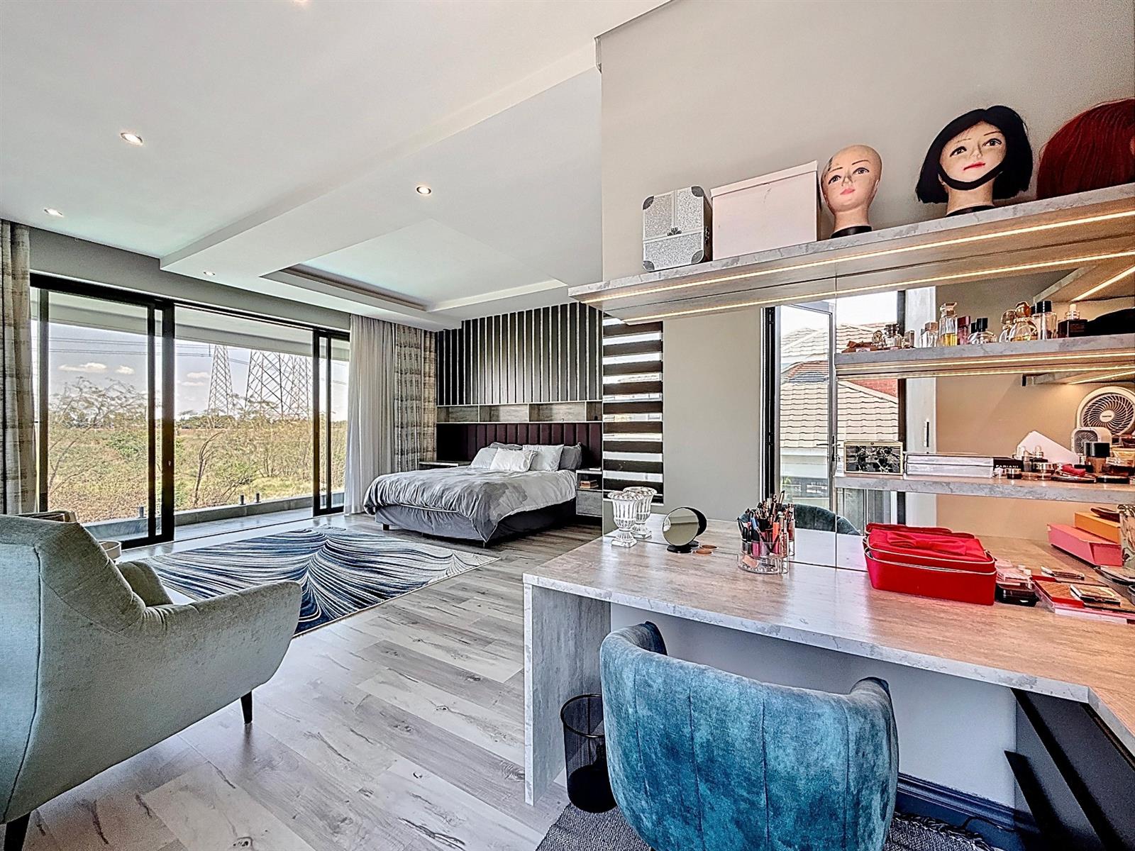 Upstairs, four spacious bedrooms each boast en-suite bathrooms. The master suite is a peaceful retreat with expansive walk in cupboards, a dressing table area, a patio with views over the estate and an elegant full bathroom. Every detail has been designed with comfort, practicality, and effortless living in mind.