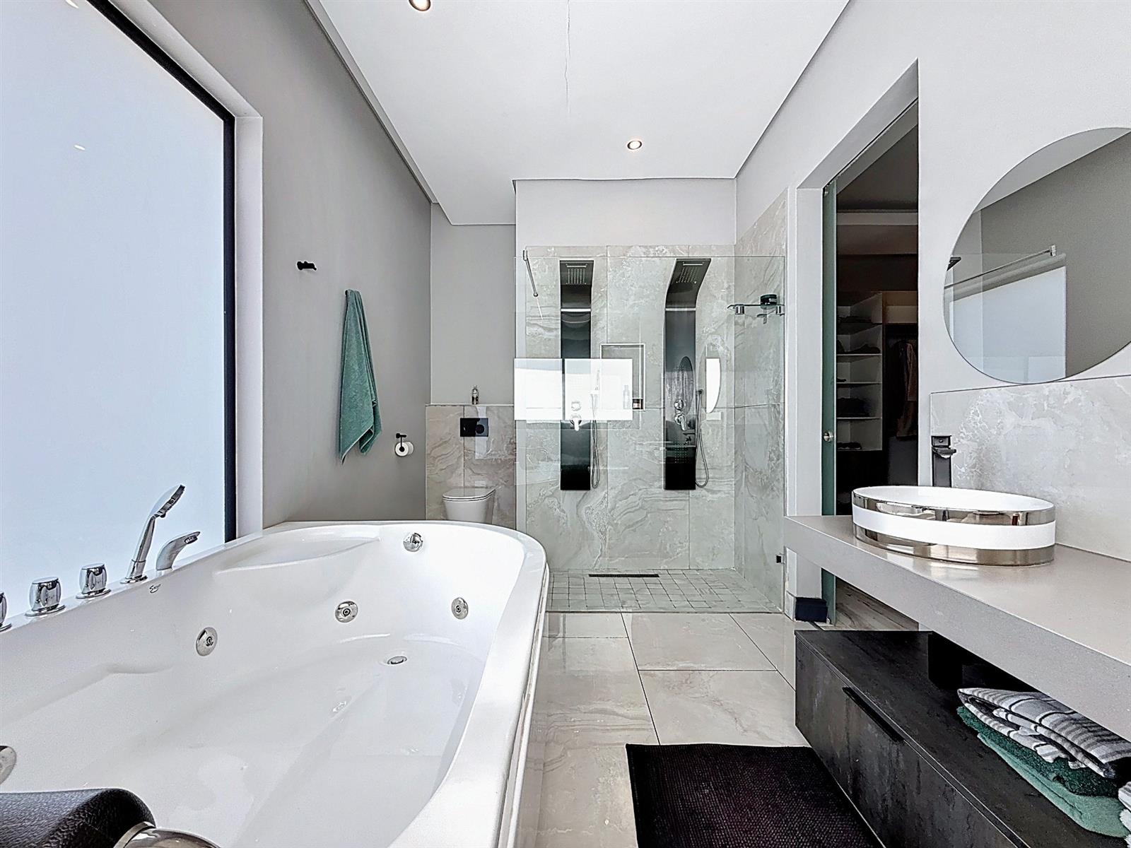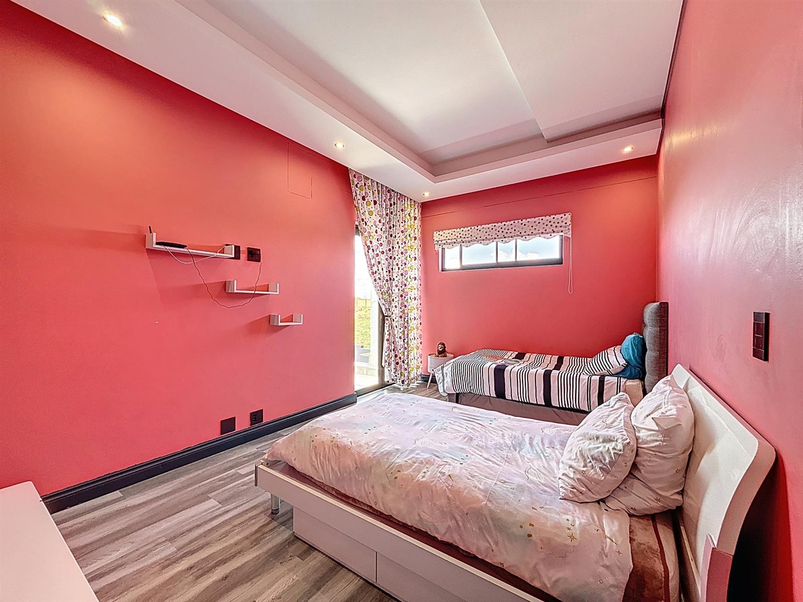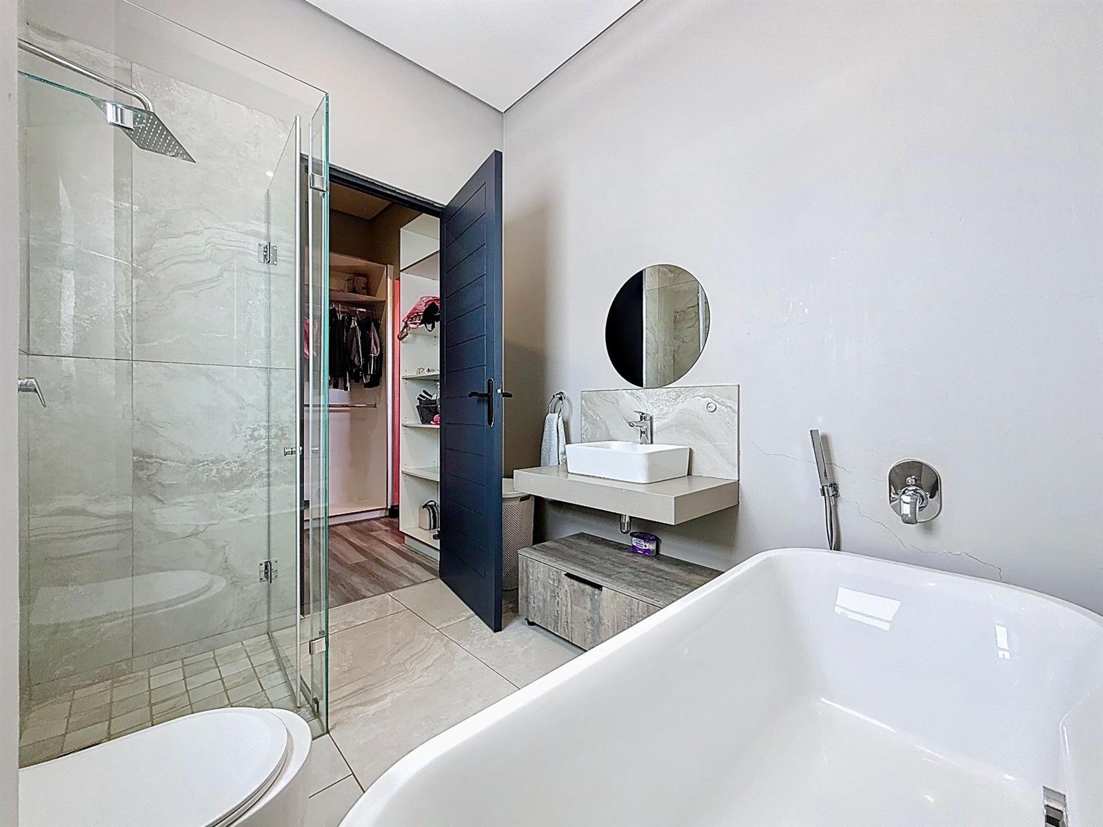 Upstairs, four spacious bedrooms each boast en-suite bathrooms. The master suite is a peaceful retreat with expansive walk in cupboards, a dressing table area, a patio with views over the estate and an elegant full bathroom. Every detail has been designed with comfort, practicality, and effortless living in mind.