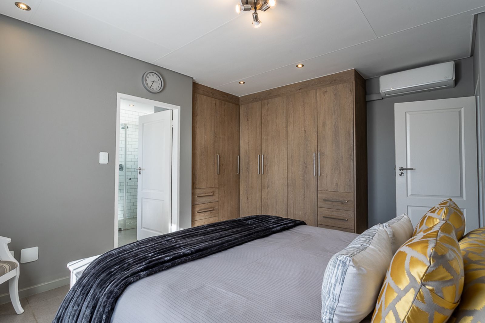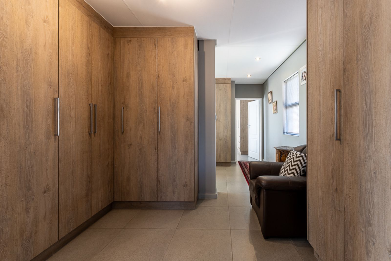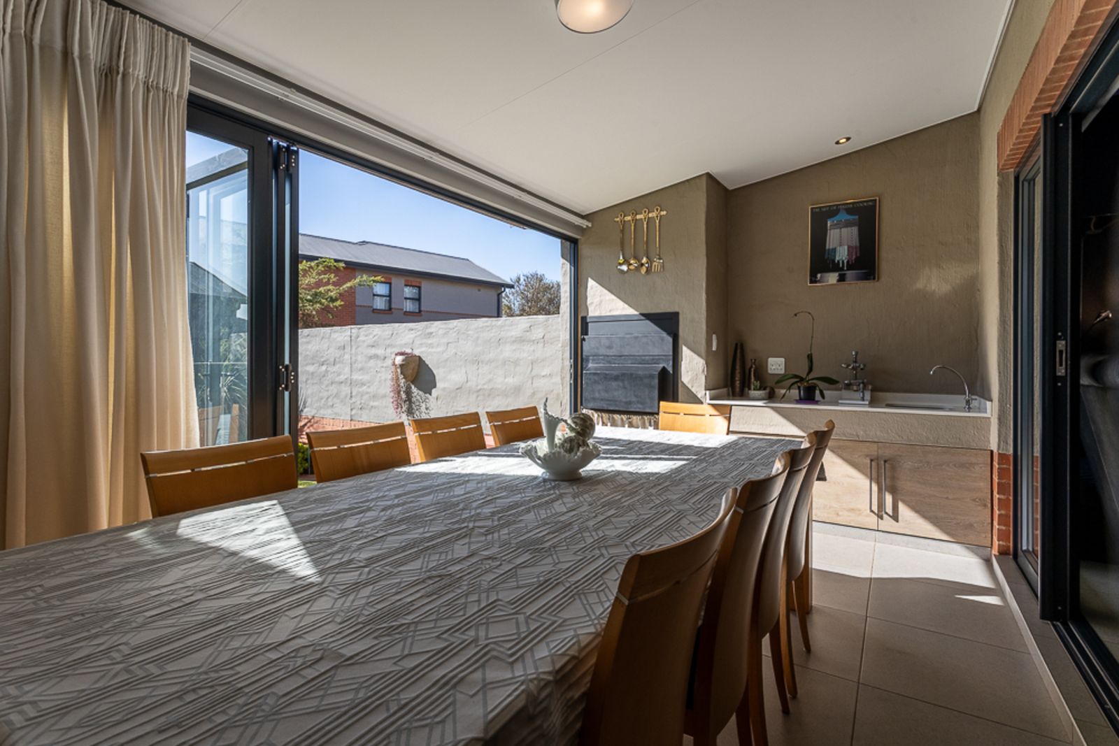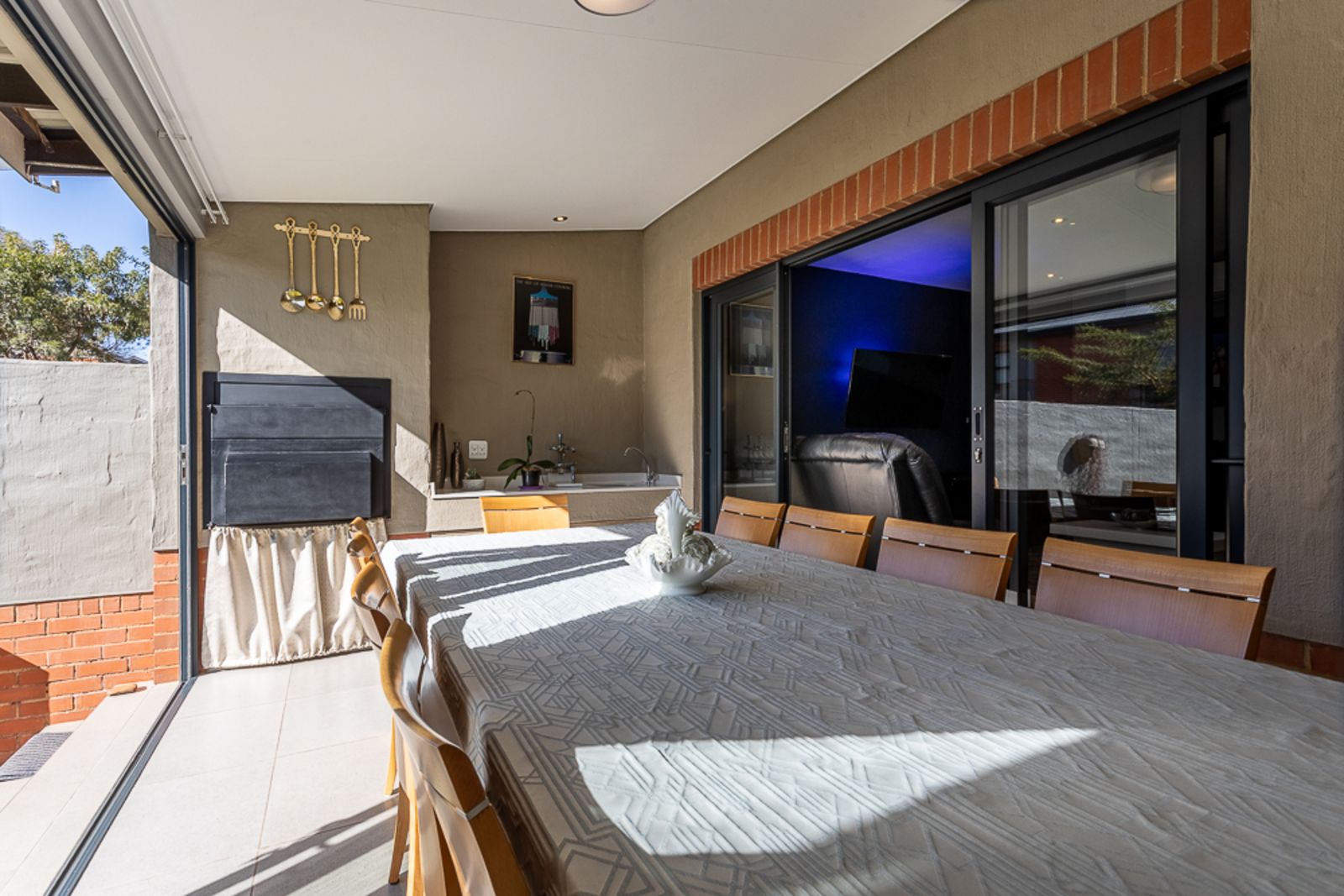 French doors lead to a covered patio, perfect for entertaining, complete with built-in cupboards and a built-in braai. The living areas and pyjama lounge are designed with attention to detail, including tiled window sills that add a touch of sophistication throughout.